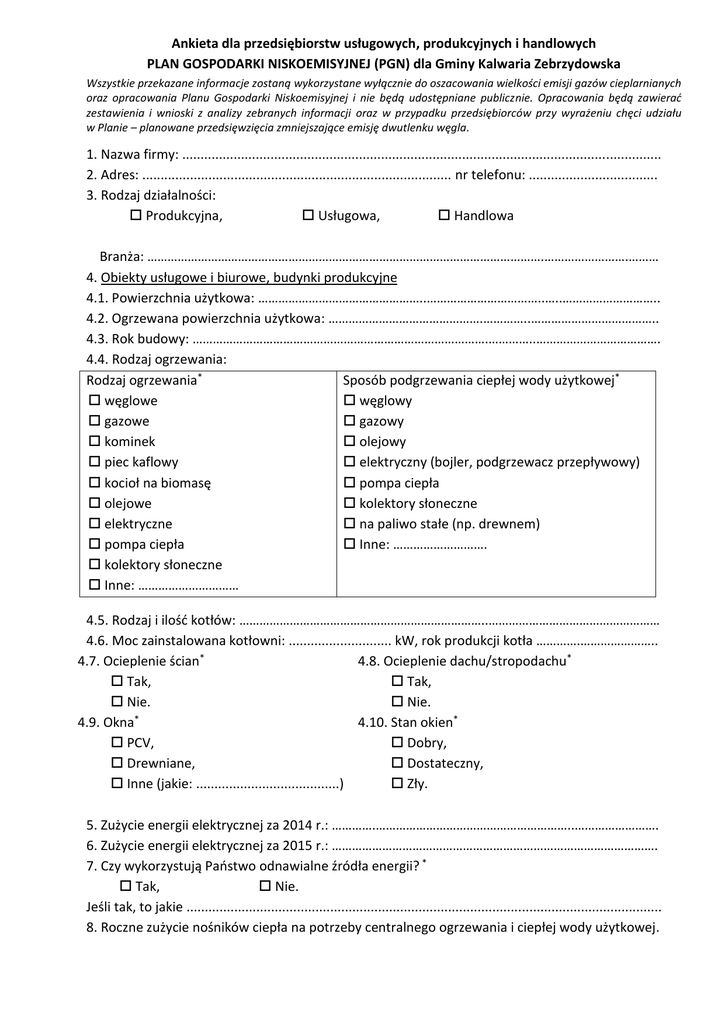 Ankieta dla przedsiębiorstw usługowych, produkcyjnych i handlowych PLAN GOSPODARKI NISKOEMISYJNEJ (PGN) dla Gminy Kalwaria Zebrzydowska Wszystkie przekazane informacje zostaną wykorzystane wyłącznie do oszacowania wielkości emisji gazów cieplarnianych oraz opracowania Planu Gospodarki Niskoemisyjnej i nie będą udostępniane publicznie. Opracowania będą zawierać zestawienia i wnioski z analizy zebranych informacji oraz w przypadku przedsiębiorców przy wyrażeniu chęci udziału w Planie – planowane przedsięwzięcia zmniejszające emisję dwutlenku węgla. 1. Nazwa firmy: .................................................................................................................................. 2. Adres: .................................................................................... nr telefonu: ................................... 3. Rodzaj działalności: Produkcyjna, Usługowa, Handlowa Branża: ……………………………………………………………………………………………………….…………………….……… 4. Obiekty usługowe i biurowe, budynki produkcyjne 4.1. Powierzchnia użytkowa: …………………………………………..……………………………..…..……………………….. 4.2. Ogrzewana powierzchnia użytkowa: ……………………………………….…………..……………………………….. 4.3. Rok budowy: …………………………………………………………………………….…………..………………………………. 4.4. Rodzaj ogrzewania: Rodzaj ogrzewania* Sposób podgrzewania ciepłej wody użytkowej* węglowe węglowy gazowe gazowy kominek olejowy piec kaflowy elektryczny (bojler, podgrzewacz przepływowy) kocioł na biomasę pompa ciepła olejowe kolektory słoneczne elektryczne na paliwo stałe (np. drewnem) pompa ciepła Inne: ………………………. kolektory słoneczne Inne: ………………………… 4.5. Rodzaj i ilość kotłów: ………………………………………………………………..…………………………………………… 4.6. Moc zainstalowana kotłowni: ............................ kW, rok produkcji kotła ………….………………….. 4.7. Ocieplenie ścian* 4.8. Ocieplenie dachu/stropodachu* Tak, Tak, Nie. Nie. * 4.9. Okna 4.10. Stan okien* PCV, Dobry, Drewniane, Dostateczny, Inne (jakie: .......................................) Zły. 5. Zużycie energii elektrycznej za 2014 r.: ………….…………………………………………………..……………………. 6. Zużycie energii elektrycznej za 2015 r.: ……………………………………………………………………………………. 7. Czy wykorzystują Państwo odnawialne źródła energii? * Tak, Nie. Jeśli tak, to jakie ................................................................................................................................. 8. Roczne zużycie nośników ciepła na potrzeby centralnego ogrzewania i ciepłej wody użytkowej. Rok 2014 Rok 2015 ciepło sieciowe [GJ] węgiel (ilość) [t] gaz [m3] olej opałowy [l] drewno [m3] własna produkcja (np. OZE) [ ………………] Inne (jakie) ………………………………. [ ………………] 9. Czy są Państwo zainteresowani zamontowaniem OZE (Odnawialnych Źródeł Energii)? * Tak. Nie. Nie wiem. 10. Jeżeli tak, to jakie i o jakiej mocy? …………………………………………………………………………………………… 11. Przeprowadzone w ostatnich latach (2014, 2015 rok) prace termomodernizacyjne (np. docieplanie budynku, wymiana okien, wymiana kotłów) - proszę podać zakres prac, lata realizacji, poniesione koszty i źródła finansowania. ………..……………………………………………………………………… ………………………………………………………………………………………………………………………………………………………….. …………………………………………………………………………………………………………………………………………………………… …………………………………………………………………………………………………………………………………………………………… 12. Planowane inwestycje zmniejszające emisję CO2 w latach 2016 – 2020 (np. docieplanie budynku, wymiana okien, wymiana kotłów, wymiana urządzeń na energooszczędne) - proszę podać zakres prac, lata realizacji, planowane koszty i źródła finansowania. ………………………………………………………………………………………………………………………………………….…………….... …………………………………………………………………………………………………………………………………………………………… ………………………………………………………………………………………………………..………………………………………………… 13. Czy są Państwo zainteresowani zamieszczeniem planowanych inwestycji w PGN (zwiększy to Państwa możliwości uzyskania dofinansowania na te inwestycje)? Tak. Nie. 14. Liczba samochodów i rodzaj oraz ilość używanego rocznie paliwa? Zużycie w litrach w ciągu roku osobowe Liczba samochodów benzyna szt. LPG szt. diesel szt. dostawcze benzyna LPG diesel szt. szt. szt. ciężarowe benzyna diesel szt. szt. 2014 2015 15. Jaki orientacyjny procent podróży samochodami odbywa się w granicach Gminy? …………………….. Dziękujemy za wypełnienie ankiety!