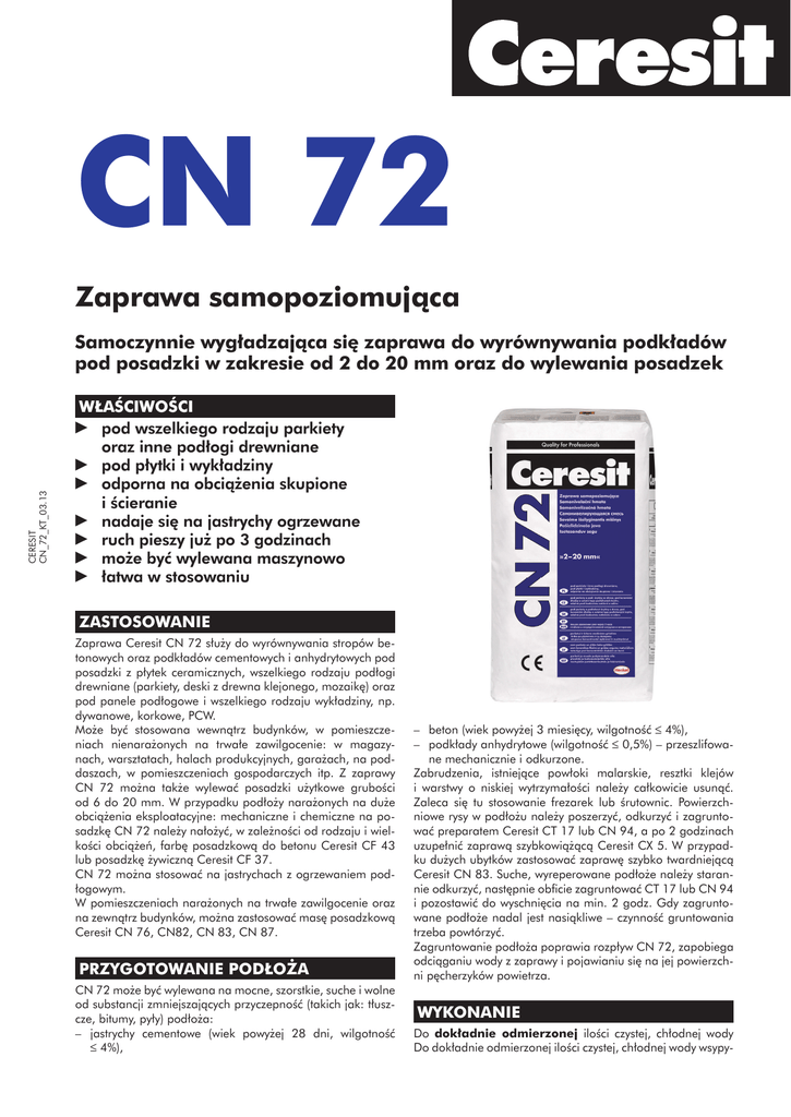 CN 72 Zaprawa samopoziomująca CERESIT CN_72_KT_03.13 Samoczynnie wygładzająca się zaprawa do wyrównywania podkładów pod posadzki w zakresie od 2 do 20 mm oraz do wylewania posadzek WŁAŚCIWOŚCI pod wszelkiego rodzaju parkiety oraz inne podłogi drewniane pod płytki i wykładziny odporna na obciążenia skupione i ścieranie nadaje się na jastrychy ogrzewane ruch pieszy już po 3 godzinach może być wylewana maszynowo łatwa w stosowaniu ZASTOSOWANIE Zaprawa Ceresit CN 72 służy do wyrównywania stropów betonowych oraz podkładów cementowych i anhydrytowych pod posadzki z płytek ceramicznych, wszelkiego rodzaju podłogi drewniane (parkiety, deski z drewna klejonego, mozaikę) oraz pod panele podłogowe i wszelkiego rodzaju wykładziny, np. dywanowe, korkowe, PCW. Może być stosowana wewnątrz budynków, w pomieszczeniach nienarażonych na trwałe zawilgocenie: w magazynach, warsztatach, halach produkcyjnych, garażach, na poddaszach, w pomieszczeniach gospodarczych itp. Z zaprawy CN 72 można także wylewać posadzki użytkowe grubości od 6 do 20 mm. W przypadku podłoży narażonych na duże obciążenia eksploatacyjne: mechaniczne i chemiczne na posadzkę CN 72 należy nałożyć, w zależności od rodzaju i wielkości obciążeń, farbę posadzkową do betonu Ceresit CF 43 lub posadzkę żywiczną Ceresit CF 37. CN 72 można stosować na jastrychach z ogrzewaniem podłogowym. W pomieszczeniach narażonych na trwałe zawilgocenie oraz na zewnątrz budynków, można zastosować masę posadzkową Ceresit CN 76, CN82, CN 83, CN 87. PRZYGOTOWANIE PODŁOŻA CN 72 może być wylewana na mocne, szorstkie, suche i wolne od substancji zmniejszających przyczepność (takich jak: tłuszcze, bitumy, pyły) podłoża: – jastrychy cementowe (wiek powyżej 28 dni, wilgotność £ 4%), – beton (wiek powyżej 3 miesięcy, wilgotność £ 4%), – podkłady anhydrytowe (wilgotność £ 0,5%) – przeszlifowane mechanicznie i odkurzone. Zabrudzenia, istniejące powłoki malarskie, resztki klejów i warstwy o niskiej wytrzymałości należy całkowicie usunąć. Zaleca się tu stosowanie frezarek lub śrutownic. Powierzchniowe rysy w podłożu należy poszerzyć, odkurzyć i zagruntować preparatem Ceresit CT 17 lub CN 94, a po 2 godzinach uzupełnić zaprawą szybkowiążącą Ceresit CX 5. W przypadku dużych ubytków zastosować zaprawę szybko twardniejącą Ceresit CN 83. Suche, wyreperowane podłoże należy starannie odkurzyć, następnie obficie zagruntować CT 17 lub CN 94 i pozostawić do wyschnięcia na min. 2 godz. Gdy zagruntowane podłoże nadal jest nasiąkliwe – czynność gruntowania trzeba powtórzyć. Zagruntowanie podłoża poprawia rozpływ CN 72, zapobiega odciąganiu wody z zaprawy i pojawianiu się na jej powierzchni pęcherzyków powietrza. WYKONANIE Do dokładnie odmierzonej ilości czystej, chłodnej wody Do dokładnie odmierzonej ilości czystej, chłodnej wody wsypy- UWAGA Mieszanie materiału z większą ilością wody spowoduje spadek wytrzymałości i rozwarstwienie CN 72. Prace należy wykonywać w suchych warunkach, przy temperaturze powietrza i podłoża od +5°C do +25°C. Wszelkie dane odnoszą się do temperatury +23°C oraz wilgotności względnej powietrza 50%. W innych warunkach należy uwzględnić szybsze lub wolniejsze twardnienie materiału. CN 72 zawiera cement i zmieszana z wodą ma odczyn alkaliczny. W związku z tym należy chronić naskórek i oczy. W przypadku kontaktu materiału z oczami płukać je obficie wodą i zasięgnąć porady lekarza. Zawartość chromu VI – poniżej 2 ppm w okresie ważności wyrobu. ZALECENIA Wylaną zaprawę chronić przed zbyt szybkim przesychaniem powodowanym przeciągami czy silnym nasłonecznieniem pomieszczenia. Jeżeli w podłożu występują dylatacje lub szczeliny przeciwskurczowe, to należy je również powtórzyć w warstwie CN 72. W posadzce CN 72 należy wykonać szczeliny przeciwskurczowe. Maksymalna wielkość pola dylatacyjnego nie może przekraczać 36 m2. Przy przyjmowaniu długości i szerokości pól należy zachować proporcje zbliżone do kwadratu. Stosunek długości do szerokości pola nie powinien przekraczać 1,5. Dylatacje przeciwskurczowe należy wykonać również w progach pomieszczeń. Po 3 godzinach od wylania po posadzce można już chodzić. Płytki ceramiczne można mocować zaprawami Ceresit CM po min. 24 godz., a inne wykładziny układać po wyschnięciu zaprawy – nie wcześniej jednak niż po 48 godz. Przy wylewaniu zaprawy na pękniętych, odkształcających się podłożach nie można wykluczyć powstania rys w posadzce i na powierzchni sztywnych wykładzin. Niniejsza karta techniczna określa zakres stosowania materiału i zalecany sposób prowadzenia robót, ale nie może zastąpić zawodowego przygotowania wykonawcy. Oprócz podanych zaleceń prace należy wykonywać zgodnie ze sztuką budowlaną i zasadami BHP. Producent gwarantuje jakość wyrobu, natomiast nie ma wpływu na warunki i sposób jego użycia. W przypadku wątpliwości należy wykonać własne próby stosowania. Wraz z ukazaniem się tej karty technicznej tracą ważność karty wcześniejsze. SKŁADOWANIE Do 12 miesięcy od daty produkcji, przy składowaniu na paletach, w suchych warunkach i w oryginalnych, nieuszkodzonych opakowaniach. OPAKOWANIA Worki 25 kg. DANE TECHNICZNE Baza: mieszanka cementów z wypełniaczami mineralnymi i modyfikatorami Proporcje mieszania: 6 l wody na 25 kg Temperatura stosowania: od +5°C do +25°C Czas wstępnego dojrzewania: ok. 5 min Czas zużycia: do 25 min Ruch pieszy: po 3 godz. Wytrzymałość na ściskanie (wg PN-EN 13813): C30 Wytrzymałość na zginanie (wg PN-EN 13813): F7 Skurcz (wg PN-EN 13813): -0,8 mm/m Ścieralność na tarczy Bohmego (wg PN-EN 13813): A22 Reakcja na ogień (wg PN-EN 13813): A2fl - s1 Uwalnianie substancji lotnych: spełnia wymagania Orientacyjne zużycie na m2: ok. 1,6 kg/m2 na każdy mm grubości Wyrób zgodny z normą PN-EN 1