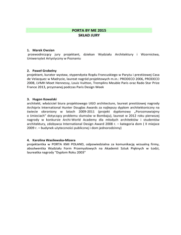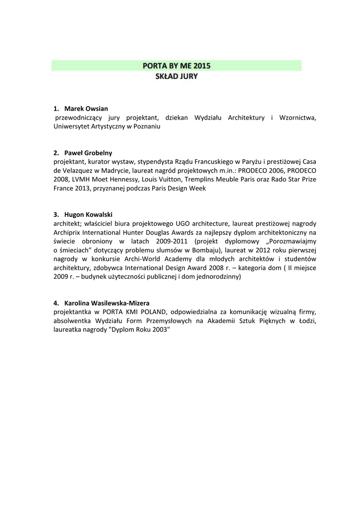 1. Marek Owsian przewodniczący jury projektant, dziekan Wydziału Architektury i Wzornictwa, Uniwersytet Artystyczny w Poznaniu 2. Paweł Grobelny projektant, kurator wystaw, stypendysta Rządu Francuskiego w Paryżu i prestiżowej Casa de Velazquez w Madrycie, laureat nagród projektowych m.in.: PRODECO 2006, PRODECO 2008, LVMH Moet Hennessy, Louis Vuitton, Tremplins Meuble Paris oraz Rado Star Prize France 2013, przyznanej podczas Paris Design Week 3. Hugon Kowalski architekt; właściciel biura projektowego UGO architecture, laureat prestiżowej nagrody Archiprix International Hunter Douglas Awards za najlepszy dyplom architektoniczny na świecie obroniony w latach 2009-2011 (projekt dyplomowy „Porozmawiajmy o śmieciach” dotyczący problemu slumsów w Bombaju), laureat w 2012 roku pierwszej nagrody w konkursie Archi-World Academy dla młodych architektów i studentów architektury, zdobywca International Design Award 2008 r. – kategoria dom ( II miejsce 2009 r. – budynek użyteczności publicznej i dom jednorodzinny) 4. Karolina Wasilewska-Mizera projektantka w PORTA KMI POLAND, odpowiedzialna za komunikację wizualną firmy, absolwentka Wydziału Form Przemysłowych na Akademii Sztuk Pięknych w Łodzi, laureatka nagrody "Dyplom Roku 2003"