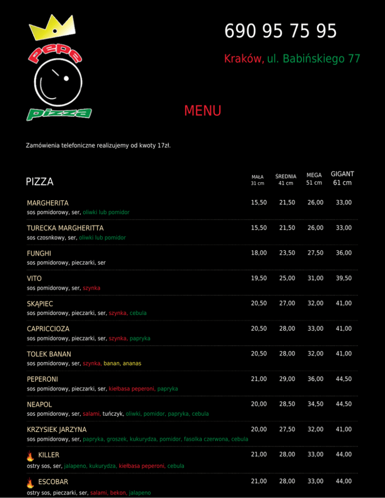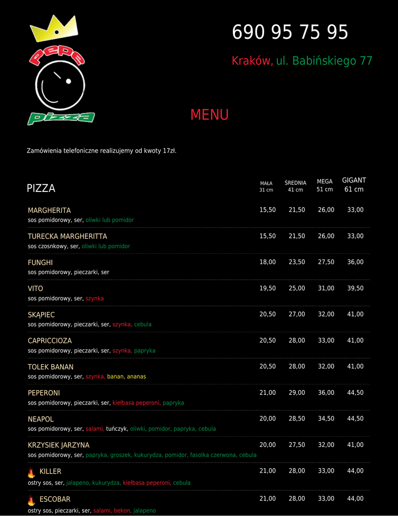 690 95 75 95 Kraków, ul. Babińskiego 77 MENU Zamówienia telefoniczne realizujemy od kwoty 17zł. PIZZA MAŁA 31 cm ŚREDNIA 41 cm MEGA 51 cm GIGANT 61 cm MARGHERITA 15,50 21,50 26,00 33,00 15,50 21,50 26,00 33,00 18,00 23,50 27,50 36,00 19,50 25,00 31,00 39,50 20,50 27,00 32,00 41,00 20,50 28,00 33,00 41,00 20,50 28,00 32,00 41,00 21,00 29,00 36,00 44,50 20,00 28,50 34,50 44,50 20,00 27,50 32,00 41,00 21,00 28,00 33,00 44,00 21,00 28,00 33,00 44,00 sos pomidorowy, ser, oliwki lub pomidor TURECKA MARGHERITTA sos czosnkowy, ser, oliwki lub pomidor FUNGHI sos pomidorowy, pieczarki, ser VITO sos pomidorowy, ser, szynka SKĄPIEC sos pomidorowy, pieczarki, ser, szynka, cebula CAPRICCIOZA sos pomidorowy, pieczarki, ser, szynka, papryka TOLEK BANAN sos pomidorowy, ser, szynka, banan, ananas PEPERONI sos pomidorowy, pieczarki, ser, kiełbasa peperoni, papryka NEAPOL sos pomidorowy, ser, salami, tuńczyk, oliwki, pomidor, papryka, cebula KRZYSIEK JARZYNA sos pomidorowy, ser, papryka, groszek, kukurydza, pomidor, fasolka czerwona, cebula KILLER ostry sos, ser, jalapeno, kukurydza, kiełbasa peperoni, cebula ESCOBAR ostry sos, pieczarki, ser, salami, bekon, jalapeno DZIKUS 21,00 28,00 35,00 45,00 sos pomidorowo-czosnkowy, pieczarki, ser, kiełbasa, bekon, ogórek kiszony, kukurydza, papryka, cebula KOZAK 21,00 28,50 34,50 44,50 21,00 27,50 33,00 43,50 21,00 28,00 34,00 44,00 20,00 28,00 33,00 44,00 21,00 28,50 34,00 44,00 21,00 28,00 33,00 44,00 20,00 27,50 33,00 43,00 21,00 28,00 34,00 44,00 20,00 27,00 33,00 43,00 21,00 28,00 33,00 44,00 21,00 28,00 33,00 44,00 21,00 28,00 33,00 44,00 21,00 29,50 35,00 45,00 21,00 29,00 34,00 44,50 21,00 29,00 34,00 44,50 22,00 30,00 35,00 45,00 21,00 29,50 35,50 45,00 20,50 28,00 34,50 44,50 sos pomidorowo-ostry, ser, 3x bekon, cebula, chili GONZALES sos pomidorowy, ser, bekon, wołowina, kukurydza, papryka JANOSIK sos pomidorowy, ser, ser wędzony, kiełbasa, papryka, cebula GÓRALSKA sos pomidorowy, ser, bekon, oscypek, żurawina. cebula CEZAR sos pomidorowy, pieczarki, ser, bekon, kabanos, kiełbasa, groszek, kukurydza, papryka CLEO sos majonezowy, ser, pomidor, kukurydza, kurczak, czosnek, cebula OLUŚ sos pomidorowy, ser, szynka, kurczak, ananas, kukurydza BABILON sos pomidorowo-majonezowy, ser, szynka, ogórek kiszony, kurczak, cebula, jajka WIOSENNA sos pomidorowy, ser, brokuły, kukurydza, papryka, młoda cebulka FERDEK sos pomidorowo-majonezowy, ser, bekon, kiełbasa, ogórek kiszony, cebula WALDEK sos pomidorowy, pieczarki, ser, kiełbasa, pomidor, papryka, cebula, chili ZIOMBEL sos pomidorowy, ser, szynka, kurczak, ananas, kukurydza, papryka OSIOŁ sos pomidorowy, pieczarki, ser, 3 x salami ALCATRAZ sos pomidorowy, , pieczarki, ser, szynka, salami, ogórek kiszony, cebula, papryka AL'CAPONE sos pomidorowy, ser, szynka, kabanos, ser feta, czosnek, papryka VOODOO sos pomidorowy, ser, bekon, szynka, salami, kiełbasa, chili SEROWA sos pomidorowy, mix serowy (mozarella, gouda, ser wędzony, ser feta, ser pleśniowy) KEBAB sos pomidorowo- czosnkowy, kapusta pekińska, shaarma z kurczaka, ogórek, pomidor ZORRO 20,00 28,00 34,50 44,50 20,00 28,00 34,00 43,00 20,00 27,50 34,50 44,50 22,00 29,00 35,00 45,00 21,00 29,00 35,00 45,00 21,00 29,00 35,50 45,00 21,00 27,50 34,00 44,00 23,00 30,00 36,00 46,00 21,00 29,00 35,00 45,00 22,00 32,00 38,00 46,00 27,00 34,00 27,00 36,00 22,00 28,00 29,00 37,00 29,00 37,00 sos pomidorowy, pieczarki, ser, kiełbasa, wołowina, jalapeno, kukurydza, cebula SYCYLIJSKA sos pomidorowy, pieczarki, ser, szynka, pomidor, cebula CORLEONE sos pomidorowy, pieczarki, ser, bekon, wołowina, kukurydza, papryka, cebula PEPE sos pomidorowy, pieczarki, ser, bekon, salami, szynka, papryka, cebula, chili PETROZA sos pomidorowy, pieczarki, ser, szynka, salami, ser feta, papryka, cebula ZEMSTA sos pomidorowy, pieczarki, ser, szynka, pomidor, jalapeno, czosnek, cebula, chili, kukurydza COCO CHRZANEL sos majonezowo-chrzanowy, ser, szynka, boczek, kiełbasa, por, koperek FRUTTI DI MARE sos pomidorowy, ser, owoce morza, oliwki, cebula MASAKRA sos pomidorowo-czosnkowy, pieczarki, ser, szynka, kurczak, oliwki, kukurydza, papryka, cebula TO CO CHCESZ sos, ser + 6 dowolnych składników ALEJA KOZAKÓW PIZZE NA CIEŃKIM CIEŚCIE PIZZA SZEFA sos pomidorowy, ser, szynka dojrzewająca, suszone pomidory, ruccola, parmezan KURCZAK W LESIE sos czosnkowy, kurczak, szpinak, kurki, cebula, ruccola BIANCO oliwa, ser mozarella biała, pomidorki cherry, ruccola, pesto PIZZA Z KOZIM SEREM ser, szynka, kozi ser, suszone pomidory PIZZA KREWETKA sos czosnkowy, ser, krewetki, kurczak, cebula DODATKI DO PIZZY warzywny 2,00 3,00 4,00 5,00 mięsny 3,00 4,00 5,00 6,50 serowy 3,50 4,50 5,50 6,50 serowe ranty 4,00 5,00 6,00 7,50 SOSY DO PIZZY czosnkowy 2,00 majonezowy 2,00 ostry 2,00 sos mary-rose 2,00 miodowo-musztardowy 2,00 SAŁATKI WŁOSKA 15,00 mix sałat, pomidorki cherry, mozarella, parmezan, sos bazyliowy GRECKA 15,00 sałata lodowa, ser feta, pomidorki cherry, oliwki, ogóerk, cebula, sos vinaigrette SAŁATKA SZEFOWEJ 20,00 mix sałat, kurczak, bekon, pomidorki cehrry, ogórek, sos czosnkowy lub musztardowo - miodowy SAŁATKA Z KOZIM SEREM 25,00 mix sałat, suszone pomidory, pomidorki cherry, ser kozi, sos balsamiczny SAŁATKA Z ANANASEM sałata lodowa, ananas, kurczak, kukurydza, sos miodowo - musztardowy 20,00 PRZEKĄSKI 9,00 MINI PIZZA sos, ser, + 2 dowolne składniki 20,00 CALZONE MEKSYKAŃSKI sos ostry, kurczak, fasolka czerwona, jalapeno, kukurydza, chili 20,00 CALZONE 5 dowolnych składników PIECZYWO CZOSNKOWE 6,00 TORTILLA Z KURCZAKIEM 12,00 PALUCHY PIZZOWE 5,00 NAPOJE PEPSI PEPSI 0,5L 4,00 PEPSI 1,0L 7,00