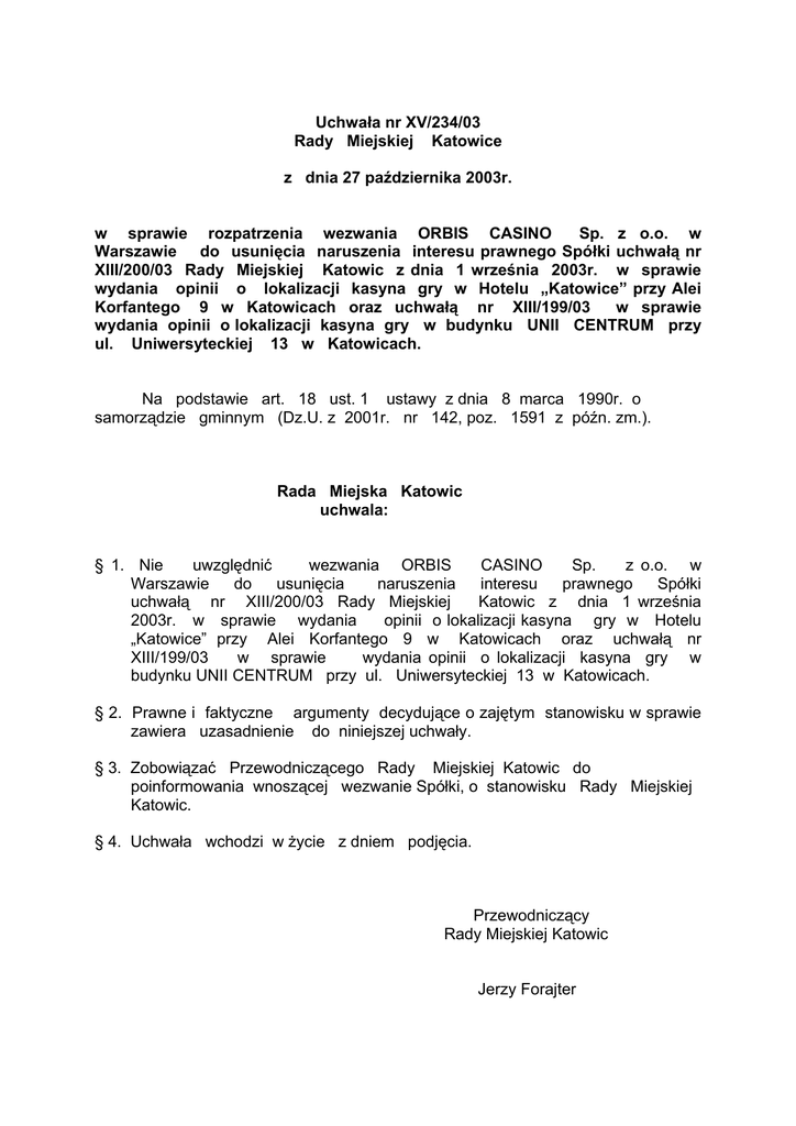 Uchwała nr XV/234/03 Rady Miejskiej Katowice z dnia 27 października 2003r. w sprawie rozpatrzenia wezwania ORBIS CASINO Sp. z o.o. w Warszawie do usunięcia naruszenia interesu prawnego Spółki uchwałą nr XIII/200/03 Rady Miejskiej Katowic z dnia 1 września 2003r. w sprawie wydania opinii o lokalizacji kasyna gry w Hotelu „Katowice” przy Alei Korfantego 9 w Katowicach oraz uchwałą nr XIII/199/03 w sprawie wydania opinii o lokalizacji kasyna gry w budynku UNII CENTRUM przy ul. Uniwersyteckiej 13 w Katowicach. Na podstawie art. 18 ust. 1 ustawy z dnia 8 marca 1990r. o samorządzie gminnym (Dz.U. z 2001r. nr 142, poz. 1591 z późn. zm.). Rada Miejska Katowic uchwala: § 1. Nie uwzględnić wezwania ORBIS CASINO Sp. z o.o. w Warszawie do usunięcia naruszenia interesu prawnego Spółki uchwałą nr XIII/200/03 Rady Miejskiej Katowic z dnia 1 września 2003r. w sprawie wydania opinii o lokalizacji kasyna gry w Hotelu „Katowice” przy Alei Korfantego 9 w Katowicach oraz uchwałą nr XIII/199/03 w sprawie wydania opinii o lokalizacji kasyna gry w budynku UNII CENTRUM przy ul. Uniwersyteckiej 13 w Katowicach. § 2. Prawne i faktyczne argumenty decydujące o zajętym stanowisku w sprawie zawiera uzasadnienie do niniejszej uchwały. § 3. Zobowiązać Przewodniczącego Rady Miejskiej Katowic do poinformowania wnoszącej wezwanie Spółki, o stanowisku Rady Miejskiej Katowic. § 4. Uchwała wchodzi w życie z dniem podjęcia. Przewodniczący Rady Miejskiej Katowic Jerzy Forajter Uzasadnienie Pismem z dnia 3.10.2003r. (wpływ do Biura Rady Miejskiej Katowic 14.10.2003r.) - ORBIS CASINO Sp. z o.o. w Warszawie wezwała Radę Miejską Katowic do usunięcia naruszenia prawa , które zdaniem Spółki nastąpiło poprzez podjęcie w dniu 1 września 2003r. dwóch uchwał, a mianowicie: 1. uchwała nr XIII/199/03 w sprawie wydania opinii o lokalizacji kasyna gry w budynku Unii Centrum przy ul. Uniwersyteckiej 13 w Katowicach (pozytywna), 2. uchwała nr XIII/200/03 w sprawie wydania opinii o lokalizacji kasyna gry w Hotelu „Katowice” przy Alei Korfantego 9 w Katowicach (negatywna), z wnioskiem o ich uchylenie. Wezwanie w/w Spółki do uchylenia wymienionych powyżej uchwał Rady Miejskiej Katowice jest nieuzasadnione z następujących względów: Na sesji w dniu 1 września 2003r. Rada Miejska Katowic podjęła dwie uchwały w sprawie wydania opinii o lokalizacji kasyna gry na terenie miasta Katowice, opiniując pozytywnie wniosek „Casinos Poland” Sp. z o.o. z siedzibą w Warszawie - uchwałą nr XIII/199/03 Rady Miejskiej Katowic na lokalizację kasyna gry w nowo wybudowanym obiekcie Unii Centrum przy ul. Uniwersyteckiej 13 w Katowicach. Drugi wniosek tj. „Orbis Casino” Sp. z o.o. z siedzibą w Warszawie został zaopiniowany negatywnie uchwałą nr XIII/200/03 Rady Miejskiej Katowic. Podjęte przez Radę Miejską w/w uchwały w sprawie opinii o lokalizacji kasyna gry są prawidłowe zarówno pod względem formalnoprawnym jak i merytorycznym. Bezsporne bowiem jest, że na terenie miasta Katowice funkcjonuje już jedno kasyno gry i dlatego spośród dwóch wniosków- Rada Miejska mogła zaopiniować pozytywnie tylko jeden wniosek, albowiem zgodnie z art. 29 ust. 1 ustawy z dnia 29.07.1992r. o grach i zakładach wzajemnych (Dz.U. z 1998r. nr 102, poz. 650 z późn. zm.) - w Katowicach, jako mieście liczącym ponad 300 tyś. mieszkańców mogą funkcjonować tylko 2 kasyna gry. Ocena zaś, który z wniosków zaopiniować pozytywnie - należy do suwerennych uprawnień Rady Miejskiej Katowic, według której lokalizacja kasyna gry w budynku Unii Centrum przy ul. Uniwersyteckiej 13 jest bardziej uzasadniona, a ponadto „Casino Poland” Sp. z o.o. złożyła wniosek wcześniej aniżeli „Orbis Casino” Sp. z o.o. Wbrew stanowisku wyrażonemu w wezwaniu ORBIS CASINO Sp. z o.o. - opinia Rady Miejskiej stanowi jedynie jeden z wielu elementów wniosku ubiegającego się podmiotu o udzielenie mu zezwolenia na prowadzenie działalności w zakresie gier (vide art. 32 ust. 1 cyt. powyżej ustawy o grach i zakładach wzajemnych), o czym decyduje organ wydający zezwolenie, a nie Rada Miejska. Z tych też względów Rada Miejska nie jest uprawniona do badania ew. zastrzeżeń Ministra Finansów w stosunku do danego podmiotu, albowiem nie posiada nawet w tym zakresie żadnych informacji, a jeśli takie istotnie są, to weźmie je niewątpliwie pod uwagę organ wydający zezwolenie. Z wyżej wymienionych względów wezwanie do usunięcia naruszenia nie zasługuje na uwzględnienie.