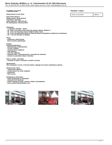 Biuro Podróży WIGRA s.c. ul. Człuchowska 25 01-360 Warszawa Tel. 22 665 06 06, 22 664 94 86, www.wigra.com.pl, e-mail: [email protected] California*** Dubaj 04.03-11.03.2016 Termin i cena 04.03-11.03.2016 3869 zł Kraj: Brak danych Miejscowość: Brak danych Transport: Samolot Data ważności: 2016-03-04 Nr katalogowy: Wczasy/2015 Położenie - w dzielnicy Dubaju – Deira - ok. 500 m od stacji metra Baniyas Square Metro Station 2 - ok. 2 km od słynnego bazaru Gold & Spice Souk - ok. 6 km od publicznej plaży Al Mamzar Beach (bezpłatny shuttle bus hotelowy) - ok. 7 km od lotniska w Dubaju Plaża - publiczna, piaszczysta - brak serwisu plażowego Pokoje Pokój Standardowy - klimatyzacja indywidualna - TV-Sat, telefon - internet Wi-Fi (płatny) - sejf (płatny) - mini bar (płatny) - łazienka (WC, wanna/prysznic, suszarka do włosów) - zestaw do parzenia kawy i herbaty Sport, relaks, rozrywka - muzyka na żywo i karaoke w klubie nocnym Wyżywienie HB: śniadanie i lunch w formie bufetu. Napoje do lunchu dodatkowo płatne. Restauracje i bary - restauracja główna - restauracja a’la carte indyjska - kawiarnia - klub nocny Dodatkowe informacje - hotel dysponuje 41 pokojami - internet wi-fi (płatny) - punkt wymiany walut, pralnia, sklep z pamiątkami - www.californiahoteldubai.com 1/1 Powered by TCPDF (www.tcpdf.org)
