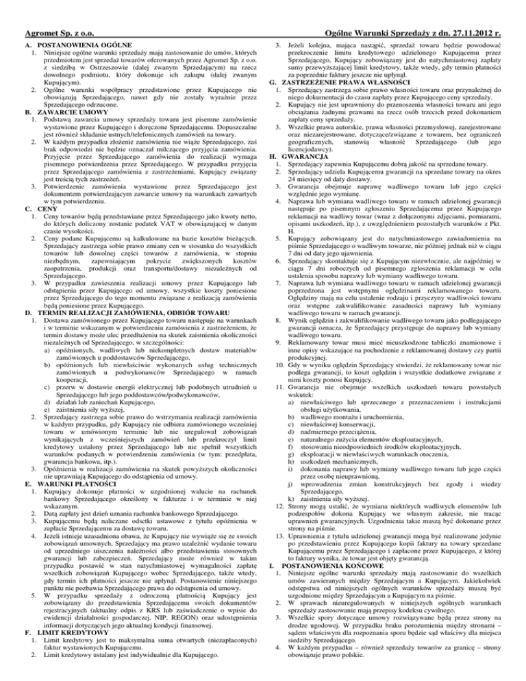 Agromet Sp. z o.o. A. POSTANOWIENIA OGÓLNE 1. Niniejsze ogólne warunki sprzedaży mają zastosowanie do umów, których przedmiotem jest sprzedaż towarów oferowanych przez Agromet Sp. z o.o. z siedzibą w Ostrzeszowie (dalej zwanym Sprzedającym) na rzecz dowolnego podmiotu, który dokonuje ich zakupu (dalej zwanym Kupującym). 2. Ogólne warunki współpracy przedstawione przez Kupującego nie obowiązują Sprzedającego, nawet gdy nie zostały wyraźnie przez Sprzedającego odrzucone. B. ZAWARCIE UMOWY 1. Podstawą zawarcia umowy sprzedaży towaru jest pisemne zamówienie wystawione przez Kupującego i doręczone Sprzedającemu. Dopuszczalne jest również składanie ustnych/telefonicznych zamówień na towary. 2. W każdym przypadku złożenie zamówienia nie wiąże Sprzedającego, zaś brak odpowiedzi nie będzie oznaczał milczącego przyjęcia zamówienia. Przyjęcie przez Sprzedającego zamówienia do realizacji wymaga pisemnego potwierdzenia przez Sprzedającego. W przypadku przyjęcia przez Sprzedającego zamówienia z zastrzeżeniami, Kupujący związany jest treścią tych zastrzeżeń. 3. Potwierdzenie zamówienia wystawione przez Sprzedającego jest dokumentem potwierdzającym zawarcie umowy na warunkach zawartych w tym potwierdzeniu. C. CENY 1. Ceny towarów będą przedstawiane przez Sprzedającego jako kwoty netto, do których doliczony zostanie podatek VAT w obowiązującej w danym czasie wysokości. 2. Ceny podane Kupującemu są kalkulowane na bazie kosztów bieżących. Sprzedający zastrzega sobie prawo zmiany cen w stosunku do wszystkich towarów lub dowolnej części towarów z zamówienia, w stopniu niezbędnym, zapewniającym pokrycie zwiększonych kosztów zaopatrzenia, produkcji oraz transportu/dostawy niezależnych od Sprzedającego. 3. W przypadku zawieszenia realizacji umowy przez Kupującego lub odstąpienia przez Kupującego od umowy, wszystkie koszty poniesione przez Sprzedającego do tego momentu związane z realizacją zamówienia będą poniesione przez Kupującego. D. TERMIN REALIZACJI ZAMÓWIENIA, ODBIÓR TOWARU 1. Dostawa zamówionego przez Kupującego towaru następuje na warunkach i w terminie wskazanym w potwierdzeniu zamówienia z zastrzeżeniem, że termin dostawy może ulec przedłużeniu na skutek zaistnienia okoliczności niezależnych od Sprzedającego, w szczególności: a) opóźnionych, wadliwych lub niekompletnych dostaw materiałów zamówionych u poddostawców Sprzedającego, b) opóźnionych lub niewłaściwie wykonanych usług technicznych zamówionych u podwykonawców Sprzedającego w ramach kooperacji, c) przerw w dostawie energii elektrycznej lub podobnych utrudnień u Sprzedającego lub jego poddostawców/podwykonawców, d) działań lub zaniechań Kupującego, e) zaistnienia siły wyższej, 2. Sprzedający zastrzega sobie prawo do wstrzymania realizacji zamówienia w każdym przypadku, gdy Kupujący nie odbiera zamówionego wcześniej towaru w umówionym terminie lub nie uregulował zobowiązań wynikających z wcześniejszych zamówień lub przekroczył limit kredytowy ustalony przez Sprzedającego lub nie spełnił wszystkich warunków podanych w potwierdzeniu zamówienia (w tym: przedpłata, gwarancja bankowa, itp.). 3. Opóźnienia w realizacji zamówienia na skutek powyższych okoliczności nie uprawniają Kupującego do odstąpienia od umowy. E. WARUNKI PŁATNOŚCI 1. Kupujący dokonuje płatności w uzgodnionej walucie na rachunek bankowy Sprzedającego określony w fakturze i w terminie w niej wskazanym. 2. Datą zapłaty jest dzień uznania rachunku bankowego Sprzedającego. 3. Kupującemu będą naliczane odsetki ustawowe z tytułu opóźnienia w zapłacie Sprzedającemu za dostawę towaru. 4. Jeżeli istnieje uzasadniona obawa, że Kupujący nie wywiąże się ze swoich zobowiązań umownych, Sprzedający ma prawo uzależnić wydanie towaru od uprzedniego uiszczenia należności albo przedstawienia stosownych gwarancji lub zabezpieczeń. Sprzedający może również w takim przypadku postawić w stan natychmiastowej wymagalności zapłatę wszelkich zobowiązań Kupującego wobec Sprzedającego, także wtedy, gdy termin ich płatności jeszcze nie upłynął. Postanowienie niniejszego punktu nie pozbawia Sprzedającego prawa do odstąpienia od umowy. 5. W przypadku sprzedaży z odroczoną płatnością Kupujący jest zobowiązany do przedstawienia Sprzedającemu swoich dokumentów rejestracyjnych (aktualny odpis z KRS lub zaświadczenie o wpisie do ewidencji działalności gospodarczej, NIP, REGON) oraz udostępnienia informacji dotyczących jego aktualnej kondycji finansowej. F. LIMIT KREDYTOWY 1. Limit kredytowy jest to maksymalna suma otwartych (niezapłaconych) faktur wystawionych Kupującemu. 2. Limit kredytowy ustalany jest indywidualnie dla Kupującego. Ogólne Warunki Sprzedaży z dn. 27.11.2012 r. 3. Jeżeli kolejna, mająca nastąpić, sprzedaż towaru będzie powodować przekroczenie limitu kredytowego udzielonego Kupującemu przez Sprzedającego, Kupujący zobowiązany jest do natychmiastowej zapłaty sumy przewyższającej limit kredytowy, także wtedy, gdy termin płatności za poprzednie faktury jeszcze nie upłynął. G. ZASTRZEŻENIE PRAWA WŁASNOŚCI 1. Sprzedający zastrzega sobie prawo własności towaru oraz przynależnej do niego dokumentacji do czasu zapłaty przez Kupującego ceny sprzedaży. 2. Kupujący nie jest uprawniony do przenoszenia własności towaru ani jego obciążania żadnymi prawami na rzecz osób trzecich przed dokonaniem zapłaty ceny sprzedaży. 3. Wszelkie prawa autorskie, prawa własności przemysłowej, zarejestrowane oraz niezarejestrowane, dotyczące/związane z towarem, bez ograniczeń geograficznych, stanowią własność Sprzedającego (lub jego licencjodawcy). H. GWARANCJA 1. Sprzedający zapewnia Kupującemu dobrą jakość na sprzedane towary. 2. Sprzedający udziela Kupującemu gwarancji na sprzedane towary na okres 24 miesięcy od daty dostawy. 3. Gwarancja 