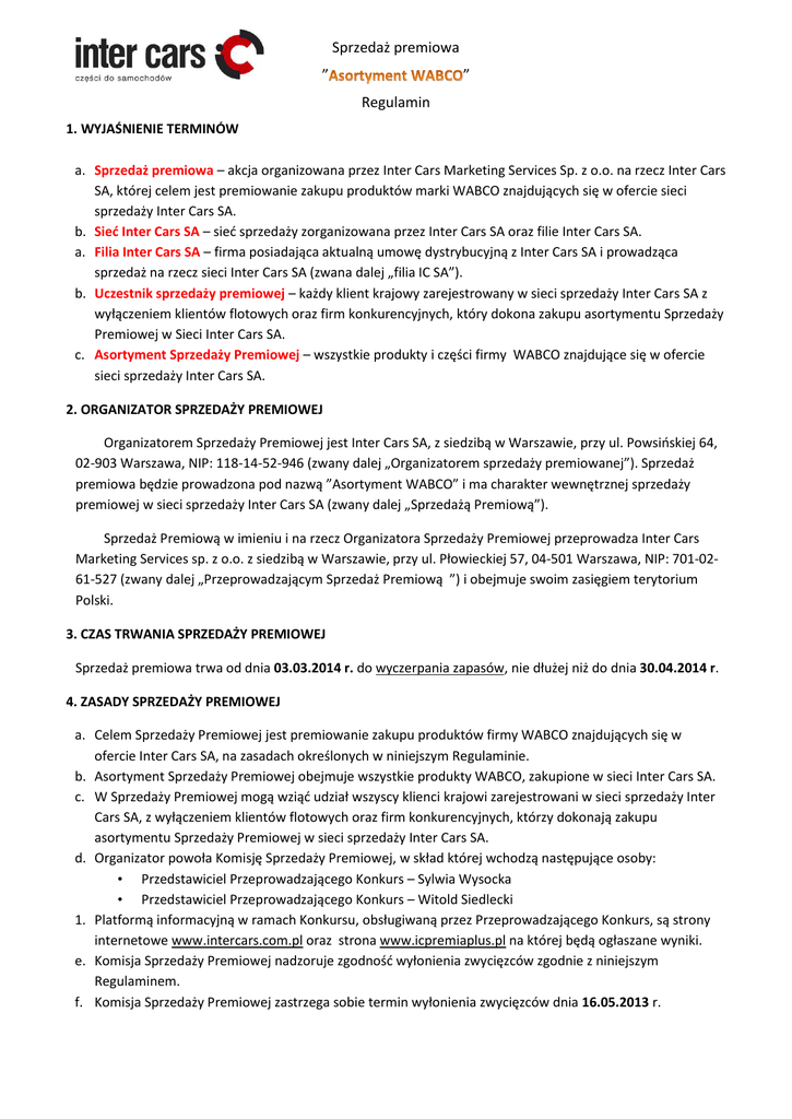 Sprzedaż premiowa ” ” Regulamin 1. WYJAŚNIENIE TERMINÓW a. Sprzedaż premiowa – akcja organizowana przez Inter Cars Marketing Services Sp. z o.o. na rzecz Inter Cars SA, której celem jest premiowanie zakupu produktów marki WABCO znajdujących się w ofercie sieci sprzedaży Inter Cars SA. b. Sieć Inter Cars SA – sieć sprzedaży zorganizowana przez Inter Cars SA oraz filie Inter Cars SA. a. Filia Inter Cars SA – firma posiadająca aktualną umowę dystrybucyjną z Inter Cars SA i prowadząca sprzedaż na rzecz sieci Inter Cars SA (zwana dalej „filia IC SA”). b. Uczestnik sprzedaży premiowej – każdy klient krajowy zarejestrowany w sieci sprzedaży Inter Cars SA z wyłączeniem klientów flotowych oraz firm konkurencyjnych, który dokona zakupu asortymentu Sprzedaży Premiowej w Sieci Inter Cars SA. c. Asortyment Sprzedaży Premiowej – wszystkie produkty i części firmy WABCO znajdujące się w ofercie sieci sprzedaży Inter Cars SA. 2. ORGANIZATOR SPRZEDAŻY PREMIOWEJ Organizatorem Sprzedaży Premiowej jest Inter Cars SA, z siedzibą w Warszawie, przy ul. Powsińskiej 64, 02-903 Warszawa, NIP: 118-14-52-946 (zwany dalej „Organizatorem sprzedaży premiowanej”). Sprzedaż premiowa będzie prowadzona pod nazwą ”Asortyment WABCO” i ma charakter wewnętrznej sprzedaży premiowej w sieci sprzedaży Inter Cars SA (zwany dalej „Sprzedażą Premiową”). Sprzedaż Premiową w imieniu i na rzecz Organizatora Sprzedaży Premiowej przeprowadza Inter Cars Marketing Services sp. z o.o. z siedzibą w Warszawie, przy ul. Płowieckiej 57, 04-501 Warszawa, NIP: 701-0261-527 (zwany dalej „Przeprowadzającym Sprzedaż Premiową ”) i obejmuje swoim zasięgiem terytorium Polski. 3. CZAS TRWANIA SPRZEDAŻY PREMIOWEJ Sprzedaż premiowa trwa od dnia 03.03.2014 r. do wyczerpania zapasów, nie dłużej niż do dnia 30.04.2014 r. 4. ZASADY SPRZEDAŻY PREMIOWEJ a. Celem Sprzedaży Premiowej jest premiowanie zakupu produktów firmy WABCO znajdujących się w ofercie Inter Cars SA, na zasadach określonych w niniejszym Regulaminie. b. Asortyment Sprzedaży Premiowej obejmuje wszystkie produkty WABCO, zakupione w sieci Inter Cars SA. c. W Sprzedaży Premiowej mogą wziąć udział wszyscy klienci krajowi zarejestrowani w sieci sprzedaży Inter Cars SA, z wyłączeniem klientów flotowych oraz firm konkurencyjnych, którzy dokonają zakupu asortymentu Sprzedaży Premiowej w sieci sprzedaży Inter Cars SA. d. Organizator powoła Komisję Sprzedaży Premiowej, w skład której wchodzą następujące osoby: • Przedstawiciel Przeprowadzającego Konkurs – Sylwia Wysocka • Przedstawiciel Przeprowadzającego Konkurs – Witold Siedlecki 1. Platformą informacyjną w ramach Konkursu, obsługiwaną przez Przeprowadzającego Konkurs, są strony internetowe www.intercars.com.pl oraz strona www.icpremiaplus.pl na której będą ogłaszane wyniki. e. Komisja Sprzedaży Premiowej nadzoruje zgodność wyłonienia zwycięzców zgodnie z niniejszym Regulaminem. f. Komisja Sprzedaży Premiowej zastrzega sobie termin wyłonienia zwycięzców dnia 16.05.2013 r. g. Nieterminowe płatności za zakupy asortymentu Sprzedaży Premiowej, przeterminowane należności wobec Organizatora Sprzedaży Premiowej lub zwrot zakupionego asortymentu Sprzedaży Premiowej powodują wykluczenie Uczestnika z udziału w Sprzedaży Premiowej. h. Nagrody w Sprzedaży Premiowej będą przyznawane zgodnie z zasadami ustalonymi w niniejszym regulaminie. i. Prace Komisji Sprzedaży Premiowej są niejawne. 5. NAGRODY a. Nagrodą w Sprzedaży Premiowej jest dwustronny bezrękawnik z logiem WABCO, który Laureat Sprzedaży Premiowej nabywa za kwotę 1 zł netto. Rozmiary bezrękawników są przekazywane losowo. b. Nagroda przysługuje Uczestnikowi Sprzedaży Premiowej który dokona jednorazowych zakupów za kwotę 2 000 zł (netto) asortymentu Sprzedaży Premiowej w całym okresie trwania Sprzedaży Premiowej. c. Organizator Sprzedaży Premiowej zastrzega, że wszelkie należności podatkowe, które mogą zaistnieć w związku ze sprzedażą towarów będących nagrodami w Sprzedaży Premiowej pozostają po stronie Laureata Sprzedaży Premiowej. d. Nagrody za dokonanie zakupów zgodnie z Regulaminem, zostaną wysłane do filii IC SA w której zostały dokonane zakupy Sprzedaży Premiowej 16.05.2014 r. w celu przekazania Klientom. 6. REKLAMACJE I ROSZCZENIA. a. Uczestnikowi przysługuje prawo złożenia reklamacji. b. Reklamacje przyjmowane będą wyłącznie w trybie korespondencji przesłanej listem poleconym na adres Przeprowadzającego Sprzedaż Premiową z dopiskiem ”Asortyment WABCO”, nie później niż do dnia 23.05.2014 r., przy czym o dotrzymaniu terminu będzie decydować data stempla pocztowego. Reklamacja zgłoszona po tym terminie nie zostanie rozpatrzona. c. Reklamacja powinna być sporządzona na piśmie i zawierać imię, nazwisko i dokładny adres Uczestnika, jak również dokładny opis przyczyny reklamacji. d. Przeprowadzający Sprzedaż Premiową rozpatrzy reklamację w terminie 7 (siedmiu) dni roboczych od daty otrzymania, przy czym okres ten może zostać wydłużony, gdy rozpoznanie reklamacji wymaga dłuższego czasu. e. Po rozpatrzeniu reklamacji Przeprowadzający Sprzedaż Premiową prześle odpowiedź listem poleconym na adres wskazany przez Uczestnika. f. W przypadku, gdy złożona reklamacja zawiera braki uniemożliwiające jej rozpatrzenie, Przeprowadzający Sprzedaż Premiową wezwie Uczestnika do jej uzupełnienia, określając termin nie krótszy niż 7 (siedem) dni roboczych, oraz zakres tego uzupełnienia. Brak uzupełnienia reklamacji w określonym terminie spowoduje pozostawienie reklamacji bez rozpatrzenia. g. Decyzja Przeprowadzającego Sprzedaż Premiową w przedmiocie reklamacji jest ostateczna i wiążąca. 7. ODPOWIEDZIALNOŚĆ ORGANIZATORA Odpowiedzialność Organizatora Sprzedaży Premiowej wobec Uczestników z tytułu Sprzedaży Premiowej, w żadnym przypadku nie przekroczy 