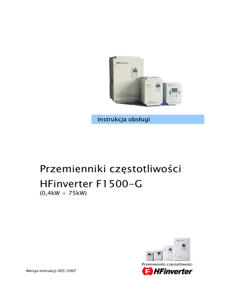 Instrukcja obsługi Przemienniki częstotliwości HFinverter F1500-G (0,4kW ÷ 75kW) Przemienniki częstotliwości Wersja instrukcji 005/2007 Dziękujemy, że wybrali Państwo produkty firmy HFinverter! Celem poniższej instrukcji obsługi jest dostarczenie użytkownikowi wskazówek, ostrzeżeń i wytycznych odnośnie instalacji, uruchamiania, ustawiania lub zmiany parametrów oraz wykrywania i diagnozowania nieprawidłowości, jakie mogą wystąpić podczas pracy z przemiennikami częstotliwości serii F1500-G. Prosimy dokładnie przeczytać instrukcję obsługi przed instalacją i rozpoczęciem pracy z przemiennikami częstotliwości. Zawsze aktualną instrukcję obsługi można pobrać z naszej strony internetowej www.eurodrive.pl lub www.hfinverter.com Zmiany w porównaniu do poprzedniej wersji instrukcji: • zmiany wielkości obudowy dla falowników zasilanych trójfazowo o mocy 0,7kW, 1,5kW i 2,2kW - strona 8 - z B3 na B2, • zmiana wymiarów montażowych dla falowników w obudowie B2 strona 12 - o 1mm mniej, • sposób podłączenia uziemienia dla 4 typów falowników - strona 16 nie do zacisków PE lub P - patrz rysunek, • nowa listwa z zaciskami sterującymi - duża zmiana!! - strona 19 dodano wejścia komunikacyjne A+ i B-, • opisane nowe zaciski sterujące - wejścia komunikacyjne - strona 20 Symbole użyte w instrukcji obsługi: ZAGROŻENIE! Niewłaściwa instalacja lub użytkowanie przemiennika częstotliwości F1500-G może spowodować zagrożenie życia, zdrowia ludzkiego lub nieodwracalne uszkodzenie urządzenia. OSTRZEŻENIE! Niewłaściwa instalacja lub użytkowanie przemiennika F1500-G może spowodować zagrożenie życia, zdrowia ludzkiego lub nieodwracalne uszkodzenie urządzenia. UWAGA! Niewłaściwe użytkowanie może spowodować nieodwracalne uszkodzenie urządzenia. WAŻNE! Wskazówki dotyczące poprawnego użytkowania urządzenia. Pomocne informacje dotyczące urządzenia. 2 ver.05/2007 Spis treści I Zasady bezpiecznej pracy……………………………………………………........ 5 II Produkty……………………………………………………………………………..… 7 2.1 Oznaczenie modeli……………………………………………………….….. 7 2.2 Typy przemienników…………………………………………………….…… 8 2.3 Budowa przemienników………………………………………………….…. 9 III 2.3.1 Obudowy z tworzywa 2.3.2 Obudowy metalowe 2.4 Parametry…..…………………………………………………………………... 10 Instalacja i podłączenie……………………………………………………..……… 11 3.1 Instalacja……………………………………………………………………..…. 11 3.1.1 Wytyczne instalacji 3.1.2 Otoczenie (środowisko pracy) 3.1.3 Wymiary 3.2 Połączenia………………………………………………………………..…….. 3.2.1 13 Standardowe typy połączeń Schemat połączeń 1…………………………………………………. 13 Schemat połączeń 2…………………………………………………. 14 3.2.2 Zaciski wejściowe……………………………………………………. 15 Zalecane przekroje przewodów zasilających………………….. 17 Zalecane zabezpieczenia…………………………………………… 18 3.2.3 Zaciski sterujące……………………………………………………… 19 IV Obsługa – panel operatorski…………………………………………………..….. 21 4.1 Wyświetlacz i klawiatura…………………………………………..………… 21 4.1.1 Instrukcja obsługi panela 4.1.2 Opis przycisków funkcyjnych 4.2 Ustawianie parametrów………………………………………………..…….. 22 4.3 Opis grup parametrów……………………………………………..………… 24 V 4.4 Opis wyświetlanych parametrów……………………………………..……. 24 Opis parametrów przemiennika……………………………………………..…... 25 5.1 Parametry podstawowe……………………………………………..……….. 25 5.2 Parametry zaawansowane…………………………………………….…….. 28 5.2.1 Ustawianie zworek terminala……………………………………… 3 ver.05/2007 30 Spis treści 5.3 Parametry prędkości wielostopniowych……………………………….…. 35 5.4 Parametry wejść i wyjść programowalnych…………………..………….. 38 5.4.1 Programowalne wejścia…………………………………………….. 38 5.4.2 Programowalne wyjścia…………………………………………….. 39 5.4.3 Wyjścia specjalne…………………………………………………….. 40 5.5 Parametry kontrolne sterowania U/f………………………………..…….. 41 5.5.1 Kompensacja krzywej U/f i częstotliwość nośna……………… 41 5.5.2 Parametry hamowania………………………………………………. 42 5.5.3 Parametry funkcji zabezpieczających…………………………… 43 5.6 Parametry regulatora PI……………………………………………..……….. 44 5.7 Definiowanie parametrów czasowych i zabezpieczających……..…… 46 5.7.1 Ustawianie parametrów czasowych……………………………… 46 5.7.2 Ustawianie zabezpieczeń podnapięciowych i nadprądowych 46 5.7.3 Zapis błędów………………………………………………………….. 47 5.8 Ustawienia wartości analogowych…………………………………………. 48 5.8.1 Wartości wejść analogowych………………………………………. 48 5.8.2 Detekcja częstotliwości…………………………………………….. 48 5.9 Parametry komunikacyjne…………………………………………………… 49 VI Ustawienia podstawowe (przykład)….