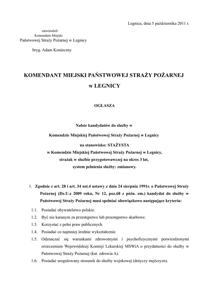 Legnica, dnia 5 października 2011 r. zatwierdził: Komendant Miejski Państwowej Straży Pożarnej w Legnicy bryg. Adam Konieczny KOMENDANT MIEJSKI PAŃSTWOWEJ STRAŻY POŻARNEJ w LEGNICY OGŁASZA Nabór kandydatów do służby w Komendzie Miejskiej Państwowej Straży Pożarnej w Legnicy na stanowisko: STAŻYSTA w Komendzie Miejskiej Państwowej Straży Pożarnej w Legnicy, strażak w służbie przygotowawczej na okres 3 lat, system pełnienia służby: zmianowy. 1. Zgodnie z art. 28 i art. 34 ust.4 ustawy z dnia 24 sierpnia 1991r. o Państwowej Straży Pożarnej (Dz.U.z 2009 roku, Nr 12, poz.68 z późn. zm.) kandydat do służby w Państwowej Straży Pożarnej musi spełniać obowiązkowo następujące kryteria: 1.1. Posiadać obywatelstwo polskie. 1.2. Być nie karanym za przestępstwo lub przestępstwo skarbowe. 1.3. Korzystać z pełni praw publicznych. 1.4. Posiadać co najmniej średnie wykształcenie. 1.5. Odznaczać się warunkami zdrowotnymi i psychofizycznymi potwierdzonymi orzeczeniem Wojewódzkiej Komisji Lekarskiej MSWiA o przydatności do służby w Państwowej Straży Pożarnej (kat. zdrowia A). 1.6. Posiadać uregulowany stosunek do służby wojskowej (dotyczy mężczyzn). 2. Zakres zadań do wykonania na stanowisku stażysta. 2.1. Pozostawanie w czasie służby w stałej gotowości do udziału w działaniach ratowniczogaśniczych. 2.2. Udział w działaniach ratowniczo-gaśniczych. 2.3. Obsługa podczas akcji ratowniczo-gaśniczych sprzętu silnikowego i specjalnego. 2.4. Kierowanie przydzielonym pojazdem z zachowaniem przepisów kodeksu drogowego. 2.5. Wykonywanie obsługi codziennej i konserwacji sprzętu specjalnego przydzielonego do obsługi. 2.6. Przygotowanie oraz rzetelne przekazywanie pojazdów i innego przydzielonego sprzętu silnikowego podczas zmiany służby. 2.7. Utrzymanie sprzętu i wyposażenia we właściwym stanie technicznym i stałej gotowości bojowej. 2.8. Znajomość parametrów technicznych i możliwości taktycznych sprzętu będącego na wyposażeniu jednostki. 2.9. Pełnienie służby wewnętrznej, dbanie o czystość w rejonie zakwaterowania oraz podczas działań ratowniczo-gaśniczych, w tym również w zakresie BHP. 2.10. Podnoszenie kwalifikacji zawodowych i specjalistycznych. 3. Wymagane dokumenty obowiązkowe: 3.1. Podanie o przyjęcie do służby (druk do pobrania) 3.2. Ankieta osobowa kandydata do służby w PSP (druk do pobrania) 3.3. Aktualne zaświadczenie lekarskie o stanie zdrowia stwierdzające zdolność kandydata do przystąpienia do próby wydolnościowej – zmodyfikowana metoda harwardzka („Harvard Step-Up Test”), testu sprawności fizycznej oraz testu wysokościowego (druk do pobrania). 3.4. Życiorys. 3.5. Kserokopia dowodu osobistego. 3.6. Kserokopia prawa jazdy. 3.7. Kserokopia książeczki wojskowej z uwidocznionymi danymi osobowymi kandydata, kategorią zdrowia i uregulowanym stosunkiem do służby wojskowej. 3.8. Kserokopie dokumentów potwierdzających posiadanie wykształcenia średniego. 4. Dokumenty dodatkowe: 4.1. Uprawnienia ratownika medycznego. 4.2. Uprawnienia płetwonurka. 4.3. Udokumentowana znajomość języków obcych. 4.4. Udokumentowane posiadanie własnego mieszkania na terenie powiatu legnickiego. 4.5. Udokumentowane odbycie zastępczej służby wojskowej w jednostkach organizacyjnych PSP. 4.6. Udokumentowane posiadanie uprawnień, które mogą być przydatne w PSP, np.: obsługa sprzętu ciężkiego. 4.7. Udokumentowane: członkostwo w OSP powyżej 3 lat, udział w zawodach pożarniczych OSP, szkolenia dla członków OSP (druk do pobrania). 4.8. Udokumentowane wykształcenie wyższe informatyczne, wyższe techniczne o kierunku przydatnym w PSP. Uwaga ! Dokumenty, przy których znajduje się adnotacja „druk do pobrania” obowiązują wyłącznie w takiej formie. Inna forma druku w przypadku dokumentów obowiązkowych będzie skutkowała odrzuceniem całości dokumentacji kandydata, bez dodatkowych czynności ze strony KM PSP w Legnicy. Zaświadczenie lekarskie o stanie zdrowia ważne jest miesiąc od daty wystawienia. Koszty badań lekarskich i zaświadczeń pokrywa zainteresowany. Honorowane będą zaświadczenia wydane przez lekarzy: rodzinnych, internistów, medycyny pracy, profilaktyków. Podanie oraz inne dokumenty należy wypełnić dokładnie i czytelnie. Druki do pobrania można pobrać w sekretariacie KM PSP w Legnicy lub ze strony internetowej Komendy: www.straz.legnica.eu z zakładki „Nabór”. Wymagane dokumenty należy składać w zaklejonej kopercie formatu A4 opisanej imieniem i nazwiskiem z dopiskiem „Nabór do służby w KM PSP w Legnicy 2011 – STAŻYSTA”, w terminie od dnia 10.10.2011 r. do dnia 28.10.2011 r. osobiście w sekretariacie Komendy Miejskiej Państwowej Straży Pożarnej w Legnicy, ul. Witelona 2, od poniedziałku do piątku w godzinach od 8:00 do 15:00 lub przesłać drogą pocztową na adres: Komenda Miejska Państwowej Straży Pożarnej w Legnicy, ul. Witelona 2, 59-220 Legnica (decyduje data wpływu, a nie data stempla pocztowego). Nabór do służby w Komendzie Miejskiej Państwowej Straży Pożarnej w Legnicy będzie cztero-etapowy. Harmonogram przebiegu procesu naboru: • 10.10.2011 do 28.10.2011 r. do godz. 15:00 – składanie dokumentów przez kandydatów do służby; • I etap naboru – 31.10.2011 do 03.11.2011 r. - weryfikacja dokumentów złożonych przez kandydatów do służby - ogłoszenie wyników w dniu 04.11.2011 r.; • II etap naboru – 07.11.2011 r. - ocena sprawności fizycznej kandydata - ogłoszenie wyników w dniu 09.112011 r.; • III etap naboru – 14.11.2011 r. - rozmowa z Komisją Kwalifikacyjną Komendy Miejskiej Państwowej Straży Pożarnej w Legnicy; - ogłoszenie wyników w dniu 16.11.2011 r. • IV etap naboru – badania lekarskie Rezygnacja lub nieobecność kandydata na jakimkolwiek etapie prowadzenia naboru wiąże się z wykluczeniem z dalszego postępowania rekrutacyjnego. Informacje w sprawie naboru można