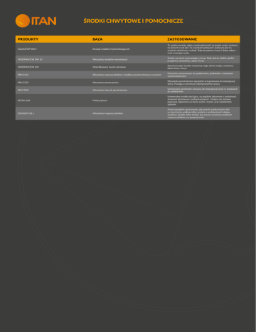 ŚRODKI CHWYTOWE I POMOCNICZE PRODUKTY BAZA ZASTOSOWANIE AGUASTOP WA 9 Emulsja środków hydrofobizujących. To wodna emulsja, dająca wodoodporność na krople wody, zarówno na skórach crust jak i na wyrobach gotowych. Zalecana jest na artykuły odzieżowe i nubuki. Daje przyjemny chwyt i dobrą odporność na krople wody. MODIFIKATOR DW 10 Mieszanina środków chwytowych Środek wyraźnie poprawiający chwyt. Daje skórze miękki, gładki, przyjemny, aksamitny, ciepły chwyt. MODIFIKATOR 202 Modyfikowane żywice akrylowe Stosowany jako środek chwytowy. Daje skórze ciepły, woskowy, lekko tłusty chwyt. PEN 5315 Mieszanka rozpuszczalników i środków powierzchniowo-czynnych. Penetrator stosowanym do podbarwień, podkładów i zestawów wykończalniczych. PEN 5323 Mieszanka penetratorów. Mieszanka penetratorów specjalnie przygotowana do impregnacji skóry. Pomaga w penetracji impregnowanej żywicy. PEN 7010 Mieszanka różnych penetratorów. Uniwersalny penetrator używany do impregnacji żywic w zestawach do podbarwień. RETEN 100 Poliazyrydyna Uniwersalny środek sieciujący, szczególnie aktywnym z proteinami, żywicami akrylowymi i poliuretanowymi . Dodany do zestawu poprawia odporność na tarcie suche i mokre, oraz wielokrotne zginanie. SOLVENT OIL J Mieszanina rozpuszczalników Został specjalnie opracowany, aby pomóc producentom skór w czyszczeniu wałków roller-coatera z syntetycznych olejów, wosków i parafin, które trudno się usuwa za pomocą zwykłych rozpuszczalników czy gorącej wody.
