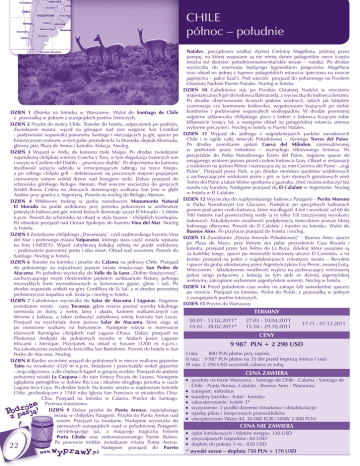 CHILE północ – południe DZIEŃ 1 Zbiórka na lotnisku w Warszawie. Wylot do Santiago de Chile z przesiadką w jednym z europejskich portów lotniczych. DZIEŃ 2 Przylot do stolicy Chile. Transfer do hotelu, odpoczynek po podróży. Zwiedzanie miasta: wjazd na górujące nad nim wzgórze San Cristóbal - podziwianie wspaniałej panoramy Santiago i otaczających ją gór, spacer po historycznym centrum, w tym pałac prezydencki la Moneda, deptak Ahumada, główny plac Plaza de Armas i katedra. Kolacja. Nocleg. DZIEŃ 3 Wyjazd w Andy, do kanionu rzeki Maipo. Po drodze zwiedzanie największej chilijskiej winnicy Concha y Tora, w tym degustacja świetnych win i wizyta w Casillero del Diablo - „piwniczce diabła”. Po dojechaniu do kanionu możliwość wzięcia udziału w emocjonującym raftingu na rzece Maipo, a po raftingu chilijski grill – delektowanie się pieczonym mięsem popijanym czerwonym winem wśród drzew nad brzegiem rzeki. Dalszy przejazd do schroniska górskiego Refugio Aleman. Pod wieczór wycieczka do gorących źródeł Banos Colina na zboczach drzemiącego wulkanu San Jose w głębi Andów przy granicy z Argentyną. Powrót na nocleg do Refugio Aleman. DZIEŃ 4 Półdniowy treking w parku narodowym Monumento Natural El Morado na punkt widokowy przy jeziorku położonym w amfiteatrze pokrytych lodowcami gór, wśród których dominuje szczyt El Morado - 5 060m n.p.m. Powrót do schroniska na obiad w stylu huasos – chilijskich kowbojów. Po obiedzie przejazd nad Ocean Spokojny do kurortu Vina del Mar. Nocleg w hotelu. DZIEŃ 5 Zwiedzanie chilijskiego „Dwumiasta”, czyli nadmorskiego kurortu Vina del Mar i portowego miasta Valparaiso, którego stara część została wpisana na listę UNESCO. Wjazd zabytkową kolejką zębatą na punkt widokowy – podziwianie panoramy portu i obu miast. Obiad nad oceanem. Powrót do Santiago. Nocleg w hotelu. DZIEŃ 6 Transfer na lotnisko i przelot do Calama na północy Chile. Przejazd do położonego na najsuchszej pustyni świata miasta-oazy San Pedro de Atacama. Po południu wycieczka do Valle de la Luna „Doliny Księżycowej”, zachwycającego swym nieziemskim pięknem sanktuarium Natury, pełnego niezwykłych form wyerodowanych w kolorowym gipsie, glinie i soli. Po drodze wspaniałe widoki na góry Cordillera de la Sal, a w drodze powrotnej prehistoryczna kopalnia soli. Kolacja i nocleg w hotelu. DZIEŃ 7 Całodniowa wycieczka do Salar de Atacama i Lagunas. Najpierw zwiedzanie wioski - oazy Toconao, gdzie można poznać wyroby lokalnego rzemiosła ze skóry, z wełny lamy i alpaki, kamieni wulkanicznych czy drewna z kaktusa, a także zobaczyć zabytkową wieżę kościoła San Lucas. Przejazd na wyschnięte słone jezioro Salar de Atacama, które sięga aż po ośnieżone wulkany na horyzoncie. Następnie wizyta w rezerwacie różowych flamingów chilijskich nad Laguna Chaxa. Dalszy przejazd na Płaskowyż Andyjski do położonych wysoko w Andach jezior Lagunas Miscanti i Menique. Przystanek na obiad w Socaire (3200 m n.p.m.). Na zakończenie zwiedzanie kościółka San Bartolome. Powrót do hotelu w San Pedro de Atacama. Nocleg. DZIEŃ 8 Bardzo wcześnie wyjazd do położonych w niecce wulkanu gejzerów Tatio na wysokości 4320 m n.p.m. Śniadanie i przechadzki wokół gejzerów - sesja zdjęciowa, a dla chętnych kąpiel w gorącej wodzie. Przejazd do pięknie położonej wioski La Caspana i do ruin fortecy Pucara de Lasana. Następnie oglądanie petroglifów w dolinie Río Loa i idealnie okrągłego jeziorka w oazie Laguna Inca Coya. Po drodze lunch. Na koniec wizyta w najstarszym kościele Chile, pochodzącym z 1540 roku Iglesia San Francisco w miasteczku ChiuChiu. Przejazd na lotnisko w Calama. Przelot do Santiago. Przerwa tranzytowa. DZIEŃ 9 Dalszy przelot do Punta Arenas, największego miasta w chilijskiej Patagonii. Przylot do Punta Arenas nad ranem. Przejazd na śniadanie. Następnie wycieczka do pierwszych europejskich osad w południowej Patagonii: nieistniejącego już, a mającego tragiczną historię Portu Głodu oraz zrekonstruowanego Fuerte Bulnes. Po powrocie krótkie zwiedzanie miasta Punta Arenas. Następnie przejazd do Puerto 22 Natales, początkowo wzdłuż słynnej Cieśniny Magellana, później przez pampę, na której wypasane są nie mniej słynne patagońskie owce (często można też dostrzec południowoamerykańskie strusie – nandu). Po drodze wycieczka do rezerwatu będącego lęgowiskiem pingwinów Magellana oraz obiad na jednej z typowo patagońskich estancias (pieczona na ruszcie jagnięcina – palce lizać!). Pod wieczór przyjazd do położonego na Fiordem Ostatniej Nadziei Puerto Natales. Nocleg w hotelu. DZIEŃ 10 Całodniowy rejs po Fiordzie Ostatniej Nadziei w otoczeniu majestatycznych gór do lodowca Balmaceda, z wycieczką do lodowca Serrano. Po drodze obserwowanie licznych ptaków wodnych, takich jak łabędzie czarnoszyje czy kormorany królewskie, wypatrywanie krążących po niebie kondorów i podziwianie wspaniałych wodospadów. W drodze powrotnej najpierw szklaneczka chilijskiego pisco z lodem z lodowca liczącym sobie kilkanaście tysięcy lat, a następnie obiad na patagońskiej estancia (znowu wyborne pieczyste!). Nocleg w hotelu w Puerto Natales. DZIEŃ 11 Wyjazd do jednego z najpiękniejszych parków narodowych Chile i w ogóle całej Ameryki Południowej – słynnego Torres del Paine. Po drodze zwiedzanie jaskini Cueva del Milodon, zamieszkiwanej w prehistorii przez milodona – wymarłego olbrzymiego leniwca. Po przyjeździe do Parku Narodowego Torres del Paine, najpierw spacer do smaganego wiatrem jeziora przed czołem lodowca Gray. Obiad w restauracji z widokiem na jezioro Pehoe i wznoszące się za nim Cuernos del Paine - „rogi Paine”. Przejazd przez Park, a po drodze mnóstwo punktów widokowych z zachwycającymi widokami jezior i gór, w tym słynnych granitowych wież Torres del Paine a także bliskie spotkania z guanako, choć można zobaczyć też na