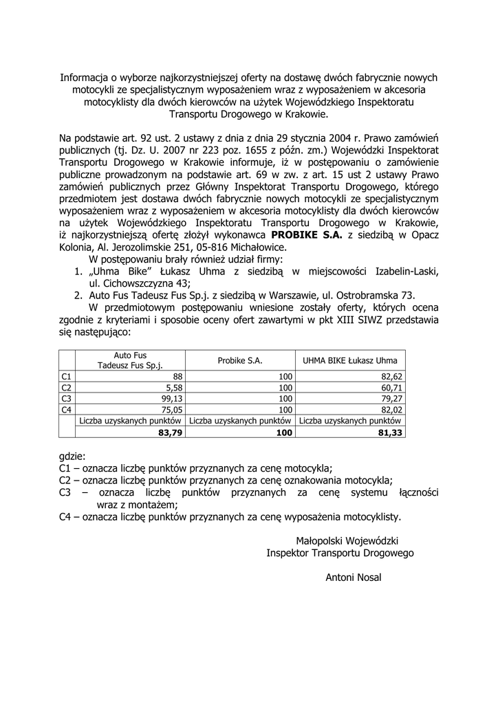 Informacja o wyborze najkorzystniejszej oferty na dostawę dwóch fabrycznie nowych motocykli ze specjalistycznym wyposaŜeniem wraz z wyposaŜeniem w akcesoria motocyklisty dla dwóch kierowców na uŜytek Wojewódzkiego Inspektoratu Transportu Drogowego w Krakowie. Na podstawie art. 92 ust. 2 ustawy z dnia z dnia 29 stycznia 2004 r. Prawo zamówień publicznych (tj. Dz. U. 2007 nr 223 poz. 1655 z późn. zm.) Wojewódzki Inspektorat Transportu Drogowego w Krakowie informuje, iŜ w postępowaniu o zamówienie publiczne prowadzonym na podstawie art. 69 w zw. z art. 15 ust 2 ustawy Prawo zamówień publicznych przez Główny Inspektorat Transportu Drogowego, którego przedmiotem jest dostawa dwóch fabrycznie nowych motocykli ze specjalistycznym wyposaŜeniem wraz z wyposaŜeniem w akcesoria motocyklisty dla dwóch kierowców na uŜytek Wojewódzkiego Inspektoratu Transportu Drogowego w Krakowie, iŜ najkorzystniejszą ofertę złoŜył wykonawca PROBIKE S.A. z siedzibą w Opacz Kolonia, Al. Jerozolimskie 251, 05-816 Michałowice. W postępowaniu brały równieŜ udział firmy: 1. „Uhma Bike” Łukasz Uhma z siedzibą w miejscowości Izabelin-Laski, ul. Cichowszczyzna 43; 2. Auto Fus Tadeusz Fus Sp.j. z siedzibą w Warszawie, ul. Ostrobramska 73. W przedmiotowym postępowaniu wniesione zostały oferty, których ocena zgodnie z kryteriami i sposobie oceny ofert zawartymi w pkt XIII SIWZ przedstawia się następująco: Auto Fus Tadeusz Fus Sp.j. C1 C2 C3 C4 Probike S.A. UHMA BIKE Łukasz Uhma 88 100 82,62 5,58 100 60,71 99,13 100 79,27 75,05 100 82,02 Liczba uzyskanych punktów Liczba uzyskanych punktów Liczba uzyskanych punktów 83,79 100 81,33 gdzie: C1 – oznacza liczbę punktów przyznanych za cenę motocykla; C2 – oznacza liczbę punktów przyznanych za cenę oznakowania motocykla; C3 – oznacza liczbę punktów przyznanych za cenę systemu łączności wraz z montaŜem; C4 – oznacza liczbę punktów przyznanych za cenę wyposaŜenia motocyklisty. Małopolski Wojewódzki Inspektor Transportu Drogowego Antoni Nosal