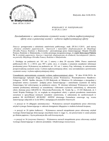 Białystok, dnia 16.06.2015r. Znak: ZP.26.1.5.2015 WYKONAWCY W POSTĘPOWANIU Nr ZP.26.1.5.2015 Zawiadomienie o unieważnieniu czynności oceny i wyboru najkorzystniejszej oferty oraz o ponownej ocenie i wyborze najkorzystniejszej oferty Dotyczy: postępowania o udzielenie zamówienia publicznego, znak: ZP.26.1.5.2015, pod nazwą „Dostawa artykułów papierniczych, biurowych i materiałów eksploatacyjnych do Miejskiego Ośrodka Pomocy Rodzinie w Białymstoku”, prowadzonego przez Zamawiającego: Miejski Ośrodek Pomocy Rodzinie w Białymstoku, w trybie przetargu nieograniczonego, w części dotyczącej Pakietu Nr 1: artykuły papiernicze, biurowe i materiały eksploatacyjne do drukarek, kserokopiarek i faksów, na potrzeby Miejskiego Ośrodka Pomocy Rodzinie w Białymstoku. 1. Działając na podstawie art. 181 ust. 2 ustawy z dnia 29 stycznia 2004r. Prawo zamówień publicznych (Dz. U. z 2013r. poz. 907 z późn. zm.), w związku z uznaniem zasadności informacji przekazanej przez Wykonawcę na podstawie art. 181 ust. 1 ustawy Pzp, informuję, że unieważniam przeprowadzoną czynność oceny i wyboru najkorzystniejszej oferty oraz zawiadamiam o powtórzeniu czynności oceny i wyboru najkorzystniejszej oferty. Uzasadnienie unieważnienia czynności wyboru najkorzystniejszej oferty: W dniu 03.06.2015r. do Zamawiającego wpłynęło drogą elektroniczną pismo Wykonawcy: Przedsiębiorstwo HandlowoUsługowe BAWI Spółka Akcyjna 15-399 Białystok, ul. Składowa 10, informujące o niezgodnej z przepisami ustawy czynności podjętej przez Zamawiającego i zaniechaniu czynności do której Zamawiający był zobowiązany na podstawie ustawy. W złożonej informacji Wykonawca wnosił o uznanie przekazanej informacji za uzasadnioną i dokonanie czynności zaniechanej, tj. odrzucenie oferty złożonej przez GRAFIX K. Olszewska-Piotrowska, M. Tyrała Sp. j., 15-103 Białystok, ul. I Armii Wojska Polskiego 2A, ze względu na niezgodność oferty z opisem przedmiotu zamówienia zawartym w specyfikacji istotnych warunków zamówienia, w odniesieniu do zaoferowanych w punkcie III MATERIAŁY BIUROWE –RÓŻNE złożonego Formularza cenowego wg. wzoru stanowiącego załącznik nr 2a do SIWZ, następujących artykułów biurowych: - w pozycji nr 16 (długopis automatyczny) – Wykonawca zarzucił niespełnienie przez oferowany artykuł wymogu Zamawiającego w zakresie dostępności długopisu w siedmiu kolorach korpusu, - w pozycji nr 28 (pióro kulkowe) – Wykonawca zarzucił niespełnienie przez oferowany artykuł wymogu Zamawiającego dotyczącego zasychania tuszu w ciągu 1s., nie przerywania w czasie pisania po śliskim papierze, i bycia polecanym dla osób leworęcznych, - w pozycji nr 36 (zszywacz biurowy) – Wykonawca zarzucił niespełnienie przez oferowany artykuł wymogu Zamawiającego w zakresie posiadania wbudowanego rozszywacza. W związku wniesioną informacją, Zamawiający zwrócił się do Wykonawcy, którego oferta została uznana za najkorzystniejszą, o złożenie dodatkowych wyjaśnień dotyczących treści złożonej oferty, w zakresie potwierdzenia spełnienia przez oferowane w pozycjach nr 16, 28, 36 artykuły biurowe. W wyniku złożonych przez wybranego Wykonawcę wyjaśnień oraz powtórnego badania przez Zamawiającego zgodności z opisem przedmiotu zamówienia w/w artykułów, Zamawiający uznał zasadność wniesionej informacji w zakresie niezgodności z opisem przedmiotu zamówienia artykułów biurowych oferowanych w pozycjach nr 28 oraz 36 złożonego Formularza cenowego, tj.: - oferowane w pozycji nr 28 pióro kulkowe nie spełnia wymogu Zamawiającego zasychania w ciągu 1 s. Zgodnie z informacją otrzymaną od dystrybutora artykułu, czas zasychania tuszu wynosi 3,0 sek na większości papierach, - oferowany w pozycji nr 36 zszywacz biurowy nie spełnia wymogu Zamawiającego w zakresie posiadania wbudowanego rozszywacza. Zgodnie z informacją otrzymaną od przedstawiciela producenta artykułu oferowany zszywacz biurowy nie posiada wbudowanego rozszywacza. W złożonych wyjaśnieniach wybrany Wykonawca zaproponował artykuł innego producenta, tym samym dokonał niedopuszczalnej zmiany treści złożonej oferty. Zgodnie z art. 87 ust. 1, w toku badania i oceny ofert zamawiający może żądać od wykonawców wyjaśnień dotyczących treści złożonych ofert. Niedopuszczalne jest prowadzenie między zamawiającym a wykonawcą negocjacji dotyczących złożonej oferty, oraz z zastrzeżeniem ust. 1a i 2, dokonywanie zmiany w jej treści. Zamawiający nie uznał zasadności zarzutu niespełnienia przez oferowany w poz. 16 długopis w zakresie dostępności w siedmiu kolorach korpusu. Z informacji przedstawiciela producenta, wynika że długopis, w standardowej ofercie, jest dostępny w pięciu kolorach obudowy. Nie wykluczył jednak dostępności w siedmiu kolorach korpusa, w sytuacji niestandardowych zleceń. W związku z potwierdzeniem niezgodności oferty wybranego Wykonawcy z opisem przedmiotu zamówienia zawartym w specyfikacji istotnych warunków zamówienia, w zakresie artykułów biurowych oferowanych w pozycjach nr 28 oraz 36 złożonego Formularza cenowego, Zamawiający unieważnia przeprowadzoną w dniu 02.06.2015r. czynność oceny i wyboru najkorzystniejszej oferty. POWTÓRZONY WYBÓR NAJKORZYSTNIEJSZEJ OFERTY. 2. Działając na podstawie art. 92 ust. 2 ustawy z dnia 29 stycznia 2004r. Prawo zamówień publicznych (Dz. U. z 2013r. poz. 907 z późn. zm.) informuję, że po dokonaniu badania i oceny ofert złożonych w postępowaniu w sprawie udzielenia zamówienia publicznego, znak: ZP.26.1.5.2015, pod nazwą „Dostawa artykułów papierniczych, biurowych i materiałów eksploatacyjnych do Miejskiego Ośrodka Pomocy Rodzinie w Białymstoku”, prowadzonym przez Zamawiającego: Miejski Ośrodek Pomocy Rodzinie w Białymstoku, w trybie przetargu nieograniczonego, w części dotyczącej Pakietu Nr 1: artykuły papiernicze, biurowe i materiały eksploatacy