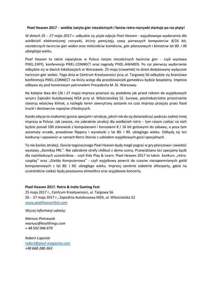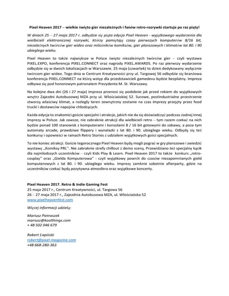 Pixel Heaven 2017 – wielkie święto gier niezależnych i fanów retro-rozrywki startuje po raz piąty! W dniach 25 – 27 maja 2017 r. odbędzie się piąta edycja Pixel Heaven - wyjątkowego wydarzenia dla wielbicieli elektronicznej rozrywki, którzy pamiętają czasy pierwszych komputerów 8/16 bit, niezależnych twórców gier wideo oraz miłośników komiksów, gier planszowych i klimatów lat 80. i 90 ubiegłego wieku. Pixel Heaven to także największe w Polsce święto niezależnych twórców gier – czyli wystawa PIXEL.EXPO, konferencja PIXEL.CONNECT oraz nagrody PIXEL.AWARDS. Po raz pierwszy wydarzenie odbędzie się w dwóch lokalizacjach w Warszawie. 25 maja (czwartek) to dzień dedykowany wyłącznie twórcom gier wideo. Tego dnia w Centrum Kreatywności przy ul. Targowej 56 odbędzie się branżowa konferencja PIXEL.CONNECT na którą wstęp dla przedstawicieli gamedevu będzie bezpłatny. Impreza odbywa się pod honorowym patronatem Prezydenta M. St. Warszawy. Na kolejne dwa dni (26 i 27 maja) impreza przenosi się podobnie jak przed rokiem do wyjątkowych wnętrz Zajezdni Autobusowej MZA przy ul. Włościańskiej 52. Surowe, postindustrialne przestrzenie stworzą właściwy klimat, a rozległy teren zewnętrzny zostanie na czas imprezy przejęty przez food trucki i dostawców napojów chłodzących. Każda edycja to znakomici goście specjalni i atrakcje, jakich nie da się doświadczyć podczas żadnej innej imprezy w Polsce. Jak zawsze, nie zabraknie atrakcji dla wielbicieli retro – tym razem czekać na nich będzie ponad 100 stanowisk z komputerami i konsolami 8 / 16 bit gotowymi do zabawy, a poza tym automaty arcade, prawdziwe flippery i wynalazki z lat 80. i 90. ubiegłego wieku. Odbędą się też konkursy i opowieści w ramach Retro Stories z udziałem wyjątkowych gości specjalnych. To nie koniec atrakcji. Goście tegorocznego Pixel Heaven będą mogli pograć w gry planszowe i zwiedzić wystawę „Komiksy PRL”. Nie zabraknie strefy chillout z demo sceną. Przewidziano też specjalny kącik dla najmłodszych uczestników – czyli Kids Play & Learn. Pixel Heaven 2017 to także konkurs „retrocosplay” oraz „Giełda Komputerowa” - czyli wyjątkowy powrót do czasów niezapomnianych giełd komputerowych z lat 80. i 90. ubiegłego wieku. Imprezę zamknie sobotnie afterparty, gdzie na uczestników czekać będą pozytywna atmosfera oraz wyjątkowe koncerty. Pixel Heaven 2017. Retro & Indie Gaming Fest 25 maja 2017 r., Centrum Kreatywności, ul. Targowa 56 26 – 27 maja 2017 r., Zajezdnia Autobusowa MZA, ul. Włościańska 52 www.pixelheavenfest.com Więcej informacji udzielą: Mariusz Pietraszek [email protected] + 48 502 046 679 Robert Łapiński [email protected] +48 668-280-363
