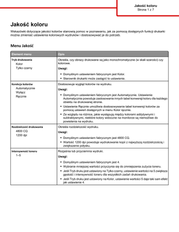 Jakość koloru Strona 1 z 7 Jakość koloru Wskazówki dotyczące jakości kolorów stanowią pomoc w poznawaniu, jak za pomocą dostępnych funkcji drukarki można zmieniać ustawienia kolorowych wydruków i dostosowywać je do potrzeb. Menu Jakość Element menu Opis Tryb drukowania Kolor Tylko czarny Określa, czy obrazy drukowane są jako monochromatyczne (w skali szarości) czy kolorowe. Uwagi: • Domyślnym ustawieniem fabrycznym jest Kolor. • Sterownik drukarki może zastąpić to ustawienie. Korekcja kolorów Automatycznie Wyłącz Ręcznie Dostosowuje wygląd kolorów na wydruku. Uwagi: • Domyślnym ustawieniem fabrycznym jest Automatycznie. Ustawienie Automatycznie powoduje zastosowanie innych tabel konwersji koloru dla każdego obiektu na drukowanej stronie. • Ustawienie Ręcznie umożliwia dostosowywanie tabel konwersji kolorów za pomocą ustawień dostępnych w menu Kolor ręcznie. • Ze względu na różnice, jakie występują między kolorami addytywnymi i subtraktywnymi, niektóre kolory widoczne na monitorze są niemożliwe do powielenia na wydruku. Rozdzielczość drukowania 4800 CQ 1200 dpi Określa rozdzielczość wydruku. Uwagi: • Domyślnym ustawieniem fabrycznym jest 4800 CQ. • Wartość 1200 dpi powoduje wydrukowanie kopii z najwyższą rozdzielczością i zwiększenie połysku. Intensywność toneru 1–5 Rozjaśnia lub przyciemnia wydruki. Uwagi: • Domyślnym ustawieniem fabrycznym jest 4. • Wybranie mniejszej wartości przyczynia się do zmniejszenia zużycia toneru. • Jeśli Tryb druku jest ustawiony na Tylko czarny, ustawienie wartości na 5 zwiększa gęstość i intensywność toneru dla wszystkich zadań drukowania. • Jeśli Tryb druku jest ustawiony na Kolor, ustawienie wartości 5 daje taki sam efekt jak ustawienie 4. Jakość koloru Strona 2 z 7 Element menu Opis Popraw cienkie linie Wyłącz Włącz Włącza tryb drukowania bardziej odpowiedni dla takich plików, jak np. rysunki architektoniczne, mapy, schematy układów elektronicznych i diagramy sekwencji działań. Uwagi: • Domyślnym ustawieniem fabrycznym jest Wyłącz. • Można ustawić tę opcję z poziomu oprogramowania. W systemie Windows kliknij kolejno opcje Plik > Drukuj, a następnie Właściwości, Preferencje, Opcje lub Konfiguracja. W przypadku komputera Macintosh wybierz kolejno opcje File (Plik)> Print (Drukuj), a następnie dostosuj ustawienia w oknie dialogowym drukowania i w podręcznych menu. • Aby ustawić tę opcję za pomocą wbudowanego serwera WWW, wpisz adres IP drukarki sieciowej w oknie przeglądarki. Oszczędzanie kolorów Wyłącz Włącz Zmniejsza zużycie toneru podczas drukowania grafiki i obrazów. Zużycie toneru podczas drukowania tekstu nie ulega zmniejszeniu. Uwagi: • Domyślnym ustawieniem fabrycznym jest Wyłącz. • W przypadku wybrania wartości Włącz ustawienie to ma wyższy priorytet niż ustawienia Intensywności toneru. Jasność RGB –6 do 6 Dostosowuje jasność kolorowych wydruków. Uwagi: • Domyślnym ustawieniem fabrycznym jest 0. • To ustawienie nie wpływa na drukowanie plików wykorzystujących specyfikację kolorów CMYK. Kontrast RGB 0–5 Dostosowuje kontrast kolorowych wydruków. Uwagi: • Domyślnym ustawieniem fabrycznym jest 0. • To ustawienie nie wpływa na drukowanie plików wykorzystujących specyfikację kolorów CMYK. Nasycenie RGB 0–5 Dostosowuje nasycenie kolorowych wydruków. Uwagi: • Domyślnym ustawieniem fabrycznym jest 0. • To ustawienie nie wpływa na drukowanie plików wykorzystujących specyfikację kolorów CMYK. Równowaga kolorów Cyjan –5 do 5 Magenta –5 do 5 Żółty –5 do 5 Czarny –5 do 5 Przywróć domyślne Pozwala dostosować kolory na wydruku poprzez zwiększenie lub zmniejszenie ilości toneru osobno dla każdego koloru. Uwaga: Domyślnym ustawieniem fabrycznym jest 0. Jakość koloru Strona 3 z 7 Element menu Opis Próbki kolorów Wyświetlacz sRGB Żywe kolory sRGB Wyświetlacz — pełna czerń Żywe kolory Wyłącz — RGB US CMYK Euro CMYK Żywe kolory CMYK Wyłącz — CMYK Drukuje strony z próbkami kolorów dla poszczególnych tabel konwersji kolorów RGB i CMYK stosowanych w drukarce. Uwagi: • Wybór któregokolwiek ustawienia powoduje wydrukowanie danej próbki. • Próbki kolorów składają się z serii kolorowych pól wraz z kombinacjami kolorów RGB lub CMYK tworzącymi kolor widoczny w danym polu. Strony te mogą być pomocne w wyborze kombinacji, jaką należy zastosować w celu uzyskania oczekiwanych kolorów wydruku. • Aby uzyskać dostęp do pełnej listy stron z próbkami kolorów z poziomu wbudowanego serwera sieci Web, należy wpisać adres IP drukarki w oknie przeglądarki. Kolor ręcznie Dostosowuje konwersję kolorów RGB. Obraz RGB Uwagi: Wyświetlacz sRGB • Domyślnym ustawieniem fabrycznym dla opcji Obraz RGB jest Wyświetlacz Wyświetlacz — pełna czerń sRGB. Powoduje zastosowanie takiej tablicy konwersji kolorów, która powoduje Żywe kolory sRGB uzyskanie takich kolorów jak na ekranie monitora. Wyłącz • Domyślnym ustawieniem fabrycznym dla opcji Tekst RGB i Grafika RGB jest Żywe kolory ustawienie Żywe kolory sRGB. Ustawienie to powoduje zastosowanie tabeli Tekst RGB konwersji kolorów zwiększającej nasycenie kolorów. Jest to opcja zalecana do Żywe kolory sRGB druku grafiki prezentacyjnej i tekstu. Wyłącz • Ustawienie Żywe kolory powoduje zastosowanie tabeli konwersji kolorów pozwalającej uzyskać jaśniejsze, bardziej nasycone kolory. Żywe kolory Wyświetlacz sRGB • Ustawienie Wyświetlacz — pełna czerń powoduje zastosowanie tabeli konwersji kolorów, przy użyciu której neutralne odcienie szarości są drukowane za pomocą Wyświetlacz — pełna czerń tylko czarnego toneru. Grafika RGB Żywe kolory sRGB Wyłącz Żywe kolory Wyświetlacz sRGB Wyświetlacz — pełna czerń Kolor ręcznie Obraz CMYK US CMYK Euro CMYK Żywe kolory CMYK Wyłącz Tekst CMYK US CMYK Euro CMYK Żywe kolory CMYK W