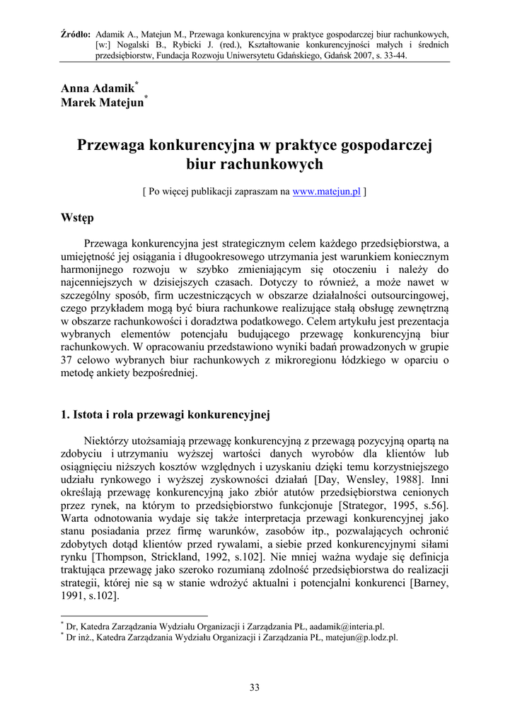 Źródło: Adamik A., Matejun M., Przewaga konkurencyjna w praktyce gospodarczej biur rachunkowych, [w:] Nogalski B., Rybicki J. (red.), Kształtowanie konkurencyjności małych i średnich przedsiębiorstw, Fundacja Rozwoju Uniwersytetu Gdańskiego, Gdańsk 2007, s. 33-44. Anna Adamik* Marek Matejun* Przewaga konkurencyjna w praktyce gospodarczej biur rachunkowych [ Po więcej publikacji zapraszam na www.matejun.pl ] Wstęp Przewaga konkurencyjna jest strategicznym celem każdego przedsiębiorstwa, a umiejętność jej osiągania i długookresowego utrzymania jest warunkiem koniecznym harmonijnego rozwoju w szybko zmieniającym się otoczeniu i należy do najcenniejszych w dzisiejszych czasach. Dotyczy to również, a może nawet w szczególny sposób, firm uczestniczących w obszarze działalności outsourcingowej, czego przykładem mogą być biura rachunkowe realizujące stałą obsługę zewnętrzną w obszarze rachunkowości i doradztwa podatkowego. Celem artykułu jest prezentacja wybranych elementów potencjału budującego przewagę konkurencyjną biur rachunkowych. W opracowaniu przedstawiono wyniki badań prowadzonych w grupie 37 celowo wybranych biur rachunkowych z mikroregionu łódzkiego w oparciu o metodę ankiety bezpośredniej. 1. Istota i rola przewagi konkurencyjnej Niektórzy utożsamiają przewagę konkurencyjną z przewagą pozycyjną opartą na zdobyciu i utrzymaniu wyższej wartości danych wyrobów dla klientów lub osiągnięciu niższych kosztów względnych i uzyskaniu dzięki temu korzystniejszego udziału rynkowego i wyższej zyskowności działań [Day, Wensley, 1988]. Inni określają przewagę konkurencyjną jako zbiór atutów przedsiębiorstwa cenionych przez rynek, na którym to przedsiębiorstwo funkcjonuje [Strategor, 1995, s.56]. Warta odnotowania wydaje się także interpretacja przewagi konkurencyjnej jako stanu posiadania przez firmę warunków, zasobów itp., pozwalających ochronić zdobytych dotąd klientów przed rywalami, a siebie przed konkurencyjnymi siłami rynku [Thompson, Strickland, 1992, s.102]. Nie mniej ważna wydaje się definicja traktująca przewagę jako szeroko rozumianą zdolność przedsiębiorstwa do realizacji strategii, której nie są w stanie wdrożyć aktualni i potencjalni konkurenci [Barney, 1991, s.102]. * * Dr, Katedra Zarządzania Wydziału Organizacji i Zarządzania PŁ, [email protected]. Dr inż., Katedra Zarządzania Wydziału Organizacji i Zarządzania PŁ, [email protected]. 33 Źródło: Adamik A., Matejun M., Przewaga konkurencyjna w praktyce gospodarczej biur rachunkowych, [w:] Nogalski B., Rybicki J. (red.), Kształtowanie konkurencyjności małych i średnich przedsiębiorstw, Fundacja Rozwoju Uniwersytetu Gdańskiego, Gdańsk 2007, s. 33-44. Opierając się na przytoczonych poglądach oraz własnych przemyśleniach poprzedzonych obszernymi analizami zagadnienia można stwierdzić, iż przewaga konkurencyjna przedsiębiorstwa to jego zdolność świadomego identyfikowania, wdrażania, rozwoju, ochrony oraz czerpania korzyści z takich unikalnych zasobów i umiejętności (z zakresu wszystkich realizowanych w organizacji ogniw łańcucha wartości), które będąc poszukiwanymi i cenionymi na rynku, nie są dostępne w takim samym zakresie innym konkurentom. Zdolność, o której mowa powyżej jest krytycznym czynnikiem sukcesu przedsiębiorstw, gdyż jest podstawą procesu trwałego tworzenia i zawłaszczania wartości rynkowych i to w większym stopniu niż udaje się to konkurentom. Efektem tego jest większy potencjał wzrostu i większa wartość firmy w oczach inwestorów [Obłój, 2001, s.3]. Poza tym, ponieważ przewaga konkurencyjna to „umiejętność dotarcia do przyszłości przed innymi” (budowanie nowych cech konkurencyjności szybciej niż rynkowi rywale), daje więc firmie wiele szans konkurencyjnych, które pozwalają jej budować infrastrukturę lub „instalować bazę”, których spóźnialscy nie są w stanie powielić. Przewaga konkurencyjna to także podwyższona rentowność działań firmy. Ze względu na to, iż wyrasta ona z całego systemu dostosowanych do siebie czynności koszt jednej z nich ulega obniżeniu dzięki sposobom wykonywania innych. Wzajemne ich dostosowanie ogranicza koszty lub zwiększa zróżnicowanie przez co ma istotny wpływ na wielkość realizowanych przez firmę przychodów i zysków. Przewaga konkurencyjna przedsiębiorstwa oznacza również wyjątkową pozycję konkurencyjną. W początkowym etapie jej kreacji to zwykle wyjątkowa pozycja w dziedzinie kosztów, z czasem przeradza się w wyjątkową jakość, bądź unikatowe zróżnicowanie. Na wstępie dotyczy zwykle rynku krajowego, z upływem lat, dzięki nabytemu doświadczeniu i zwiększonemu potencjałowi, stanowi podstawę globalizacji działań firmy. Przewaga konkurencyjna pełni ważną rolę nie tylko dla przedsiębiorstw, ale i dla środowiska w którym one funkcjonują (środowiskowy kontekst przewagi). Proces jej budowy uaktywnia bowiem rywalizację wśród miejscowych firm, co przyczynia się do rozwoju na danym obszarze szczególnych zasobów, wyspecjalizowanych umiejętności i technologii. Czynna rywalizacja sprzyja tworzeniu i podnoszeniu poziomu miejscowych sektorów dostawczych, które znajdą w danym środowisku chętny rynek [Porter, 2001]. W takich warunkach budowa przewagi konkurencyjnej staje się cyklem, nie kończącym się procesem1, którego inauguracja i realizacja jest obowiązkiem każdej myślącej o swej przyszłości w długim horyzoncie czasowym firmy. Zaangażowanie w ten proces pozwala bowiem na systematyczny rozwój realizowany „o krok dalej, o jeden ruch szybciej niż konkurencja” oraz umożliwia elastyczne reakcje na zmiany w otoczeniu rynkowym. 1 więcej na temat procesu budowy przewagi konkurencyjnej można znaleźć np. w: [Adamik, 1997], [Adamik, 1998]. 34 Źródło: Adamik A., Matejun M., Przewaga konkurencyjna w praktyce gospodarczej biur rachunkow