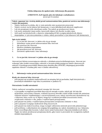 Ulotka dołączona do opakowania: informacja dla pacjenta ATROVENT, 0,25 mg/ml, płyn do inhalacji z nebulizatora Ipratropii bromidum Należy zapoznać się z treścią ulotki przed zastosowaniem leku, ponieważ zawiera ona informacje ważne dla pacjenta. - Należy zachować tę ulotkę, aby w razie potrzeby móc ją ponownie przeczytać. - Należy zwrócić się do lekarza lub farmaceuty w razie jakichkolwiek dalszych wątpliwości. - Lek ten przepisano ściśle określonej osobie. Nie należy go przekazywać innym. - Lek może zaszkodzić innej osobie, nawet jeśli objawy jej choroby są takie same. - Jeśli nasili się którykolwiek z objawów niepożądanych lub wystąpią jakiekolwiek objawy niepożądane, w tym niewymienione w ulotce, należy powiedzieć o tym lekarzowi lub farmaceucie. Spis treści ulotki: 1. Co to jest lek Atrovent i w jakim celu się go stosuje 2. Informacje ważne przed zastosowaniem leku Atrovent 3. Jak stosować lek Atrovent 4. Możliwe działania niepożądane 5. Jak przechowywać lek Atrovent 6. Zawartość opakowania i inne informacje 1. Co to jest lek Atrovent i w jakim celu się go stosuje Atrovent jest lekiem rozszerzającym oskrzela, o działaniu przeciwcholinergicznym. Atrovent jest wskazany jako środek rozszerzający oskrzela w leczeniu podtrzymującym stanów skurczowych oskrzeli w przebiegu przewlekłej obturacyjnej chorobie płuc (POChP), obejmującej przewlekłe zapalenie oskrzeli i rozedmę płuc oraz w astmie oskrzelowej. 2. Informacje ważne przed zastosowaniem leku Atrovent Kiedy nie stosować leku Atrovent - jeśli pacjent ma uczulenie (nadwrażliwość) na atropinę lub jej pochodne, bądź którykolwiek z pozostałych składników tego leku (wymienione w punkcie 6). Ostrzeżenia i środki ostrożności Należy zachować szczególną ostrożność stosując lek Atrovent: − w przypadku wystąpienia powikłań dotyczących narządu wzroku, takich jak: ból oka lub dyskomfort, niewyraźne widzenie, widzenie tęczowej obwódki wokół źródła światła lub zmienione widzenie kolorów współistniejące z zaczerwienieniem oczu, należy niezwłocznie skonsultować się z lekarzem, który oceni czy te objawy mogą być wynikiem powikłań (rozszerzenie źrenic, zwiększenie ciśnienia w oku, jaskra z wąskim kątem przesączania). − jeśli pacjent ma jaskrę z wąskim kątem przesączania (zwiększone ciśnienie w oku). − jeśli u pacjenta występuje niedrożność dróg moczowych. − jeśli pacjent ma mukowiscydozę; mogą wystąpić zaburzenia motoryki przewodu pokarmowego. − jeśli problemy z oddychaniem nie ustępują lub pogłębiają się: należy skontaktować się z lekarzem, który zweryfikuje plan leczenia. Lekarz może uznać konieczność włączenia dodatkowych leków. Nigdy nie należy przekraczać przepisanej dawki, gdyż może to prowadzić do wystąpienia ciężkich działań niepożądanych. 1 Nie wolno dopuścić, aby płyn lub rozpylany podczas inhalacji lek dostał się do oczu. Zaleca się, by płyn rozpylany z nebulizatora podawany był przez ustnik. W przypadku braku ustnika i stosowania maski do nebulizacji, musi być ona dobrze dopasowana. Po podaniu leku mogą wystąpić reakcje nadwrażliwości typu natychmiastowego, co potwierdziły rzadkie przypadki pokrzywki, obrzęku naczynioruchowego (nagły obrzęk skóry lub błon śluzowych, mogący powodować trudności w oddychaniu), wysypki, skurczu oskrzeli, obrzęku błony śluzowej jamy ustnej i gardła oraz szybko postępujących, zagrażających życiu reakcji alergicznych. Inne leki i Atrovent Należy powiedzieć lekarzowi lub farmaceucie o wszystkich lekach przyjmowanych obecnie lub ostatnio, a także o lekach, które pacjent planuje stosować. Leki pobudzające receptory beta-2-adrenergiczne i pochodne ksantynowe (teofilina) mogą nasilać działanie rozszerzające oskrzela. Podczas jednoczesnego stosowania leku Atrovent i leków pobudzających receptory beta-adrenergiczne istnieje ryzyko wystąpienia ostrej jaskry u pacjentów z jaskrą z wąskim kątem przesączania w wywiadzie. Ciąża i karmienie piersią W ciąży i w okresie karmienia piersią lub gdy istnieje podejrzenie, że kobieta jest w ciąży, lub gdy planuje ciążę, przed zastosowaniem tego leku należy poradzić się lekarza. Chociaż badania przedkliniczne nie wykazały niekorzystnego oddziaływania bromku ipratropiowego na nienarodzone dzieci, należy stosować lek Atrovent w ciąży jedynie wtedy, gdy lekarz uzna to za konieczne. Nie wiadomo, czy ipratropium przenika do mleka kobiecego. Dlatego należy stosować lek Atrovent u kobiet karmiących piersią jedynie wtedy, gdy lekarz uzna to za konieczne. Prowadzenie pojazdów i obsługiwanie maszyn Nie przeprowadzono badań dotyczących wpływu na zdolność prowadzenia pojazdów i obsługiwania maszyn. Jednakże, podczas leczenia lekiem Atrovent mogą wystąpić działania niepożądane, takie jak: zawroty głowy, zaburzenia ostrości widzenia, rozszerzenie źrenic i niewyraźne widzenie. Dlatego, jeżeli wystąpią wyżej wymienione działania niepożądane, pacjent powinien unikać potencjalnie niebezpiecznych czynności, takich jak prowadzenie pojazdów i obsługiwanie maszyn. Lek Atrovent zawiera chlorek benzalkoniowy. Lek zawiera chlorek benzalkoniowy jako środek konserwujący, w ilości 0,01 g/100 ml i disodu edetynian dwuwodny jako stabilizator. Wykazano, że u pacjentów z nadwrażliwością dróg oddechowych lek może powodować skurcz oskrzeli podczas inhalacji. 3. Jak stosować lek Atrovent Lek Atrovent należy zawsze stosować zgodnie z zaleceniami lekarza. W razie wątpliwości należy skontaktować się z lekarzem lub farmaceutą. Jeśli leczenie nie przynosi znaczącej poprawy lub jeśli stan pacjenta ulega pogorszeniu oraz w przypadku nagłej lub gwałtownie nasilającej się duszności (trudności w oddychaniu) pacjent powinien natychmiast skonsultować się z lekarzem. Nie należy przekraczać zalecanej dobowej dawki. 2