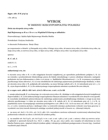 Sygn. akt. II K 575/13 1 Ds. 98/13 WYROK W IMIENIU RZECZYPOSPOLITEJ POLSKIEJ Dnia 29 sierpnia 2014 roku Sąd Rejonowy w R a c i b o r z u Wydział II Karny w składzie: Przewodniczący: Sędzia Sądu Rejonowego Monika Mańka Protokolant: Grażyna Jendrecka w obecności Prokuratora: Beaty Gluzy po rozpoznaniu w dniach: 13 listopada 2013 roku, 6 lutego 2014 roku, 26 marca 2014 roku, 9 kwietnia 2014 roku, 29 maja 2014 roku, 9 czerwca 2014 roku, 10 lipca 2014 roku, 18 lipca 2014 roku i 25 sierpnia 2014 roku sprawy: K. C. zd. J. córki N. i I. ur. (...) w B. oskarżonej o to, że: w styczniu 2013 roku w R. w celu osiągnięcia korzyści majątkowej, po uprzednim podrobieniu podpisu L. K. (1) na wniosku o przekształcenie lokatorskiego prawa do lokalu mieszkalnego w prawo odrębnej własności, następnie posłużenie się tym dokumentem w dniu 11.01.2013r. w Spółdzielni Mieszkaniowej (...) w R. za pomocą wyzyskania psychicznego stanu zdrowia L. K. (1) oraz niezdolności do należytego pojmowania przedsiębranego działania, w dniu 30 stycznia 2013 roku w R. podpisała akt notarialny, na mocy którego nabyła od L. K. (1) mieszkanie przy ul. (...) w R., czym doprowadziła L. K. (1) do niekorzystnego rozporządzenia mieniem wysokości 80.000 złotych, tj. o czyn z art. 286 § 1 kk i art. 270 § 1 kk w zw. z art. 11 § 2 kk 1. uznaje oskarżoną K. C. za winną tego, że w styczniu 2013 roku w R., działając w celu osiągnięcia korzyści majątkowej doprowadziła L. K. (1) do niekorzystnego rozporządzenia własnym mieniem w wysokości 80.000 złotych w ten sposób, że wyzyskała niezdolność pokrzywdzonej do należytego pojmowania przedsiębranego działania z uwagi na jej stan zdrowia psychicznego i w dniu 30 stycznia 2013 roku w R. nabyła od L. K. (1) mieszkanie przy ul. (...) w R., tj. popełnienia czynu wyczerpującego znamiona przestępstwa z art. 286 § 1 k.k. i za to na mocy art. 286 § 1 k.k. i art. 33 § 1, 2 i 3 k.k. wymierza jej karę 1 (jednego) roku i 4 (czterech) miesięcy pozbawienia wolności oraz karę grzywny w wysokości 100 (stu) stawek dziennych ustalając wysokość jednej stawki w kwocie 10,- (dziesięć) złotych; 2. na mocy art. 69 § 1 i § 2 k.k., art. 70 § 1 pkt 1 k.k. warunkowo zawiesza wykonanie wymierzonej oskarżonej kary pozbawienia wolności na okres 2 (dwóch) lat tytułem próby; 3. na zasadzie art. 627 k.p.k., art. 617 k.p.k. w zw. z art. 2 ust. 1 pkt 4 i art. 3 ust. 1 ustawy z dnia 23 czerwca 1973r. o opłatach w sprawach karnych (t.j.: Dz.U. z 1983r., Nr 49, poz. 223 z późn. zm.) zasądza od oskarżonej na rzecz Skarbu Państwa 500,- (pięćset) złotych tytułem opłaty i obciąża ją wydatkami postępowania w kwocie 635,- (sześćset trzydzieści pięć) złotych. Sędzia Sygn. akt II K 575/13 UZASADNIENIE 80-letnia pokrzywdzona L. K. (1) zamieszkiwała samotnie w swoim mieszkaniu przy ul. (...) nr 5 w R. do którego przysługiwało jej spółdzielcze własnościowe prawo do lokalu. Pokrzywdzona była bezdzietną wdową nie posiadającą żadnej bliższej rodziny. Co prawda w roku 1958 przysposobiła syna A., ale ten od wielu lat zamieszkując za granicą nie utrzymywał z nią żadnych kontaktów wobec czego pokrzywdzona zdecydowała się wystąpić z powództwem o rozwiązanie przysposobienia. Sprawa toczyła się w Sądzie Rejonowym w R., pod sygn. III Rc (...) i zakończyła się w dniu 25 kwietnia 2013r. wyrokiem rozwiązującym przysposobienie. Od kilku lat L. K. (2) od czasu do czasu przyjmowała wyznawców Jehowy, w tym oskarżoną K. C., która wspólnie z innymi „siostrami duchowymi” odwiedzała ją w mieszkaniu. Rozmowy dotyczyły głównie tematów biblijnych, jednak z uwagi na fakt, iż K. była osobą bardzo towarzyską i otwartą opowiadała również o swojej sytuacji rodzinnej. Dodatkowo wzajemną sympatię wzmacniał fakt, iż obie kobiety pochodziły z Ukrainy. Pokrzywdzona była kobietą bardzo zadbaną, elegancką aktywnie udzielała się w osiedlowym klubie seniora oraz chórze. W listopadzie 2012 roku L. K. (1) z rozpoznaniem udaru mózgu trafiła do Szpitala (...) w R. na Oddział (...) gdzie była hospitalizowana w okresie od 30 listopada 2012r. do 20 grudnia 2012r. W tym czasie do jej mieszkania kilkakrotnie przychodziła K. C., która ostatecznie od sąsiadów dowiedziała się, że pokrzywdzona przebywa w szpitalu. Oskarżona udała się do chorej i w czasie pobytu w szpitalu często ją tam odwiedzała. Przedstawiając się jako opiekunka K. interesowała się jej stanem zdrowia, przynosiła niezbędne rzeczy początkowo swoje własne, aż w dniu 13 grudnia 2012r. pokrzywdzona podpisała oświadczenie sporządzone przez oskarżoną w którym ustanowiła C. swoją opiekunką i wręczyła klucze do swojego mieszkania. W dniu 17 grudnia 2012r. oskarżona sporządziła oświadczenie z podpisem notarialnie poświadczonym (Rep. A (...)) w którym zobowiązała się do sprawowania opieki nad L. K. (1). Z uwagi na stan zdrowia, sytuację rodzinną i podeszły wiek chorej, pracownik socjalny szpitala (...) zaproponowała L. K. (1) umieszczenie jej w (...), gdzie miałaby zapewnioną całodobową opiekę, na co jednak pokrzywdzona kategorycznie nie wyrażała zgody. Wówczas oskarżona zaproponowała, że otoczy chorą niezbędną opieką co pozwoliłoby na powrót K. do własnego mieszkania. Nie było wówczas mowy o żadnej odpłatności za sprawowane usługi opiekuńcze, zaś na pytanie pracownika socjalnego szpitala oskarżona stwierdziła, że robi to z życzliwości i dobroci serca. Pokrzywdzona wyraziła zgodę na powyższe i w dniu 20 grudnia 2012r. została wypisana do domu pod opiekę K. C.. Oskarżona zamieszkała z pokrzywdzoną w jej mieszkaniu pomagając jej w codziennych czynnościach, zawoziła na umówione wizyty lekarskie, a w sprawowanej opiece czasem pomagała jej córka D. C.. W dniu 24 grudnia 2012r. do Spółdzielni Mieszkaniowej (...) w R. wpłynął wniosek podpisany imieniem i nazwiskiem L. K. 