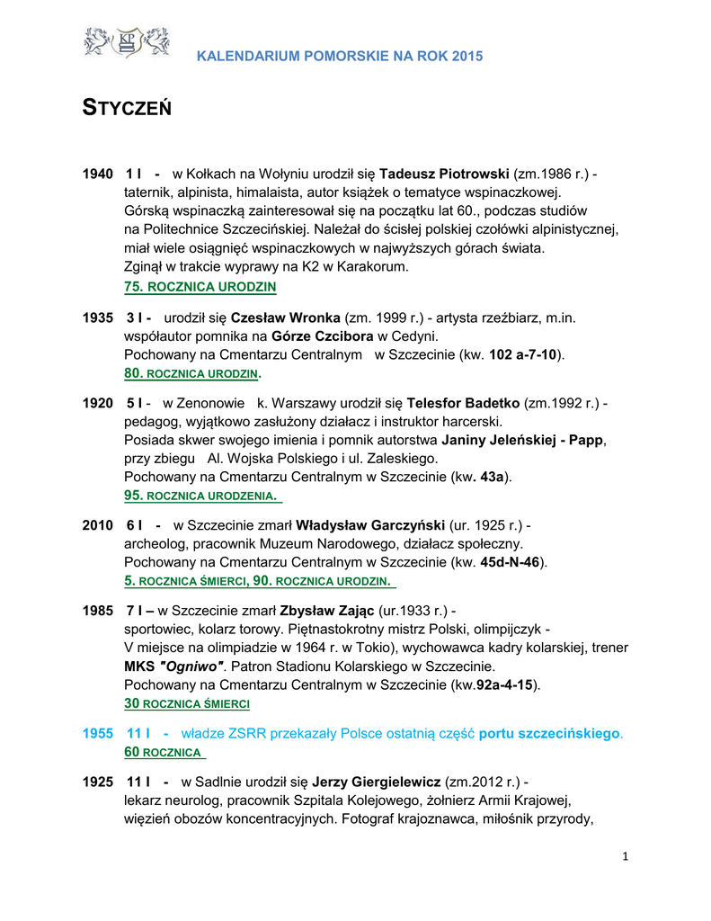 KALENDARIUM POMORSKIE NA ROK 2015 STYCZEŃ 1940 1 I - w Kołkach na Wołyniu urodził się Tadeusz Piotrowski (zm.1986 r.) taternik, alpinista, himalaista, autor książek o tematyce wspinaczkowej. Górską wspinaczką zainteresował się na początku lat 60., podczas studiów na Politechnice Szczecińskiej. Należał do ścisłej polskiej czołówki alpinistycznej, miał wiele osiągnięć wspinaczkowych w najwyższych górach świata. Zginął w trakcie wyprawy na K2 w Karakorum. 75. ROCZNICA URODZIN 1935 3 I - urodził się Czesław Wronka (zm. 1999 r.) - artysta rzeźbiarz, m.in. współautor pomnika na Górze Czcibora w Cedyni. Pochowany na Cmentarzu Centralnym w Szczecinie (kw. 102 a-7-10). 80. ROCZNICA URODZIN. 1920 5 I - w Zenonowie k. Warszawy urodził się Telesfor Badetko (zm.1992 r.) pedagog, wyjątkowo zasłużony działacz i instruktor harcerski. Posiada skwer swojego imienia i pomnik autorstwa Janiny Jeleńskiej - Papp, przy zbiegu Al. Wojska Polskiego i ul. Zaleskiego. Pochowany na Cmentarzu Centralnym w Szczecinie (kw. 43a). 95. ROCZNICA URODZENIA. 2010 6 I - w Szczecinie zmarł Władysław Garczyński (ur. 1925 r.) archeolog, pracownik Muzeum Narodowego, działacz społeczny. Pochowany na Cmentarzu Centralnym w Szczecinie (kw. 45d-N-46). 5. ROCZNICA ŚMIERCI, 90. ROCZNICA URODZIN. 1985 7 I – w Szczecinie zmarł Zbysław Zając (ur.1933 r.) sportowiec, kolarz torowy. Piętnastokrotny mistrz Polski, olimpijczyk V miejsce na olimpiadzie w 1964 r. w Tokio), wychowawca kadry kolarskiej, trener MKS "Ogniwo". Patron Stadionu Kolarskiego w Szczecinie. Pochowany na Cmentarzu Centralnym w Szczecinie (kw.92a-4-15). 30 ROCZNICA ŚMIERCI 1955 11 I - władze ZSRR przekazały Polsce ostatnią część portu szczecińskiego. 60 ROCZNICA 1925 11 I - w Sadlnie urodził się Jerzy Giergielewicz (zm.2012 r.) lekarz neurolog, pracownik Szpitala Kolejowego, żołnierz Armii Krajowej, więzień obozów koncentracyjnych. Fotograf krajoznawca, miłośnik przyrody, 1 KALENDARIUM POMORSKIE NA ROK 2015 zasłużony dla rezerwatu ornitologicznego "Świdwie". Pochowany na cmentarzu w Drzonkowie. 90. ROCZNICA URODZIN 1950 18 I - w gmachu przy Wałach Chrobrego otwarto Teatr Współczesny. 65. ROCZNICA 1980 20 I - otwarcie Szczecińskiej Gubałówki na Osowie. 35. ROCZNICA 1915 21 I - w Wiedniu urodził się Juliusz Bilewicz (zm.1971 r.) jeniec oflagu II C w Woldenbergu. Zastępca kapitana Portu Szczecin, wicedyrektor Koszalińskiego Urzędu Morskiego, dyrektor Polskiej Żeglugi Morskiej, długoletni kapitan floty handlowej PŻM. 100. ROCZNICA URODZIN. 1955 25 I - położono kamień węgielny pod budowę Szczecińskiej Śródmiejskiej Dzielnicy Mieszkaniowej. 60. ROCZNICA. LUTY 1915 7 II - w Duisburgu urodził się Franciszek Jamroży (zm.1984 r.) uczestnik walk w 1939 r., później więzień obozów jenieckich. Do Szczecina przybył wraz z Piotrem Zarembą, pierwszym prezydentem miasta i został jego zastępcą. Później pracował na stanowiskach kierowniczych w swoim wyuczonym zawodzie (technik budownictwa ogólnego). Pochowany na Cmentarzu Centralnym w Szczecinie (kw. 10b-16-25). 100. ROCZNICA URODZIN 2005 15 II - w Szczecinie zmarł Jerzy Stefan Czyżewski (ur. 1923 r.) żołnierz AK, pionier Szczecina, inż. budownictwa wodnego. Pracował m.in. jako generalny projektant Zarządu Portu Szczecin - Świnoujście. Współzałożyciel Klubu Sportowego "Pionier", przewodnik turystyczny PTTK. Pochowany na Cmentarzu Centralnym w Szczecinie (kw. 37b-28-14). 10. ROCZNICA ŚMIERCI 2 KALENDARIUM POMORSKIE NA ROK 2015 1915 16 II - we wsi Zbyszek k. Piotrkowa Trybunalskiego urodził się Jan Papuga (zm.1974 r.) - pisarz, marynista. Ze Szczecinem związany od 1946 r. Pochowany na Cmentarzu Centralnym w Szczecinie w Alei Zasłużonych). 100. ROCZNICA URODZIN 1940 23 II - w obozie koncentracyjnym w Sachsenhausen został zamordowany ks. Albert Willimsky (ur. 29 XII 1890 r. w Głogowie). W lipcu 1939 r. objął parafię rzymsko - katolicką w Podjuchach. Za obronę dyskryminowanych Polaków aresztowany 29 X 1939 r. i osadzony w obozie koncentracyjnym. W 2008 r. jego imieniem nazwano park przy ul. Krzemiennej w Podjuchach. 125. ROCZNICA URODZIN, 75. ROCZNICA ŚMIERCI 1920 23 II - w Kaliszu urodził się Mieczysław Jasnowski (zm.1993 r. w Szczecinie) - botanik, badacz roślinności Pomorza Zachodniego, specjalista z zakresu wiedzy o torfie, autor wielu publikacji na ten temat. W Szczecinie od 1955 r. Pochowany na Cmentarzu Centralnym w Szczecinie (kw. 38d-3-12). 95. ROCZNICA URODZIN 1915 27 II - w Poznaniu urodził się Czesław Piskorski (zm.1987 r. w Szczecinie) geograf, dziennikarz, krajoznawca. W Szczecinie od 1945 r. Niestrudzony popularyzator walorów krajoznawczych Pomorza Zachodniego, autor bardzo licznych przewodników i artykułów o tej tematyce. Członek Honorowy Polskiego Towarzystwa Turystyczno Krajoznawczego. Pochowany na Cmentarzu Centralnym w Szczecinie (kw. 60a-12-1 ) 100. ROCZNICA URODZIN 2000 28 II - zmarł Antoni Huebner (ur.1904 r. w Trzemesznie) muzykolog, pedagog. W Szczecinie od 1945 r. Naczelnik Muzycznej Redakcji PR, wizytator szkolny, dyrektor Państwowej Średniej Szkoły Muzycznej w Szczecinie (1953 - 1967). Popularyzator muzyki, publicysta, działacz społeczny (m.in. w Związku Śpiewaczym Pomorza Zachodniego, Wojewódzkiej Komisji Chopinowskiej, Szczecińskim Towarzystwie Muzycznym). Pochowany na Cmentarzu Centralnym w Szczecinie (kw. 29c-29-1). 15 ROCZNICA ŚMIERCI 3 KALENDARIUM POMORSKIE NA ROK 2015 MARZEC 1915 7 III - w Wiedniu urodziła się Jadwiga Jackowska (zm. 2006 r. w Szczecinie). Ze Szczecinem związana od 1959 r. Aktywnie działała w Lidze Ochrony Przyrody (m.in. wiceprezes Zarządu Wojewódzkiego LOP) i w Polskim Towarzystwie Turystyczno - Krajoznawczym (przewodniczka, współzałożycielka Klubu Tatrzańskiego). Pochowana na Cmentarzu Centralnym (kwatera 58b-20-3), obok męża Jerzego, leśnika, również wybitnego przyrodnika. 100. ROCZNICA URODZIN 2000 19 III - w d