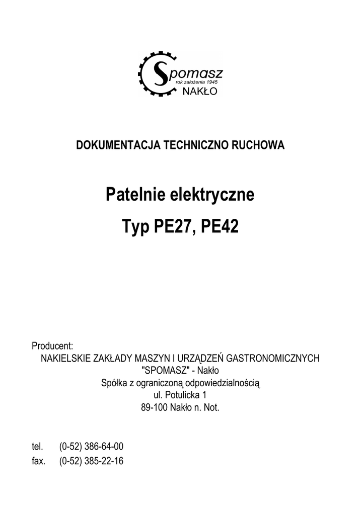 DOKUMENTACJA TECHNICZNO RUCHOWA Patelnie elektryczne Typ PE27, PE42 Producent: NAKIELSKIE ZAKŁADY MASZYN I URZĄDZEŃ GASTRONOMICZNYCH "SPOMASZ" - Nakło Spółka z ograniczoną odpowiedzialnością ul. Potulicka 1 89-100 Nakło n. Not. tel. fax. (0-52) 386-64-00 (0-52) 385-22-16 UWAGI: 1. 2. 3. 4. 5. DTR obejmuje patelnie elektryczne PE27, PE42. Zakres dostawy należy określić w zamówieniu. Producent zastrzega sobie prawo wprowadzania zmian wynikających z postępu technicznego, a odbiegających od opisu konstrukcji. Fakt podłączenia i pierwszego uruchomienia przez uprawnionego elektryka powinien zostać potwierdzony na karcie gwarancyjnej podpisem i pieczątką. W przeciwnym razie uprawnienia użytkownika wynikające z tytułu gwarancji nie będą respektowane przez producenta. Przed pierwszym uruchomieniem i przed przystąpieniem do pracy uruchamiający po raz pierwszy jak i obsługujący zobowiązani są bezwzględnie do zapoznania się z niniejszą DTR, a w szczególności do poznania podstawowych wymagań bezpieczeństwa i obsługi urządzenia oraz zagrożeń wynikających z niewłaściwego stosowania i obsługi patelni elektrycznych. Producent zobowiązuje użytkownika do umieszczenia na stanowisku pracy instrukcji bezpiecznej obsługi patelni elektrycznej zgodnie z zaleceniami podanymi w niniejszej DTR. 2 SPIS TREŚCI 1. CHARAKTERYSTYKA OGÓLNA...................................................................................4 1.1. Zastosowanie.................................................................................................................4 1.2. Charakterystyka techniczna...........................................................................................4 2. OPIS TECHNICZNY ......................................................................................................6 3. MONTAŻ........................................................................................................................6 4. INSTRUKCJA OBSŁUGI................................................................................................7 5. OPAKOWANIE, PRZECHOWYWANIE, TRANSPORT..................................................7 5.1. Stan dostawy. ................................................................................................................7 5.2. Transport........................................................................................................................8 5.3. Warunki składowania. ....................................................................................................8 6. ZASADY BEZPIECZEŃSTWA.......................................................................................8 6.1. Ostrzeżenia:...................................................................................................................8 6.2. Zakazy: ........................................................................................................................10 7. ZASADY KONSERWACJI............................................................................................11 8. RYZYKO SZCZĄTKOWE ............................................................................................12 9. ZAKŁÓCENIA W PRACY URZĄDZENIA.....................................................................13 10. WYSZCZEGÓLNIENIE CZĘŚCI NA RYSUNKACH W INSTRUKCJI ..........................15 11. WYKAZ PUNKTÓW NAPRAW GWARANCYJNYCHBłąd! Nie zdefiniowano zakładki. 3 1. CHARAKTERYSTYKA OGÓLNA 1.1. Zastosowanie. Przechylna patelnia elektryczna została wykonana w celu zmechanizowania prac w kuchni zakładów zbiorowego żywienia. Umożliwia ona smażenie i pieczenie potraw szybko, higienicznie, smacznie, przy jednoczesnej oszczędności tłuszczu. Patelnia elektryczna w kuchniach zakładów gastronomicznych, szpitalach i stołówkach jest niezastąpioną pomocą przy smażeniu i pieczeniu potraw. Na patelni tej można przygotować wiele potraw jak np.: kotlety, pieczenie, ryby, jajecznicę, naleśniki itp. Patelnia z wanną żeliwną nie nadaje się do przygotowania potraw kwaśnych. Zabrania się używania patelni do smażenia w głębokim tłuszczu (np. jako frytkownicy). 1.2. Charakterystyka techniczna. Typ Głębokość Szerokość Wysokość Ciężar − z wanną aluminiową − z wanną żeliwną − z wanną nierdzewną Powierzchnia robocza wanny Wydajność smażenia (np. kotletów) Moc patelni Napięcie zasilania Rodzaj prądu Rodzaj pracy Stopień ochrony PE27 880 mm 650 mm 880 mm PE42 880 mm 920 mm 880 mm 64 kg 88 kg 70 kg 92kg 125 kg - 0,25m2 0,4m2 120szt./h 200szt./h 6kW 400V, 50Hz ~3 S1 IP 34 9 kW 400V, 50Hz ~3 S1 IP 34 4 Patelnia elektryczna PE27 na podstawie kolumnowej Patelnia elektryczna PE42 na podstawie kolumnowej 5 2. OPIS TECHNICZNY Patelnia elektryczna składa się zasadniczo z czterech podzespołów: wanny żeliwnej nierdzewnej lub aluminiowej, obudowy wraz z elementami grzejnymi, podstawy i pokrywy. Wanna patelni ma kształt prostokąta z zaokrąglonymi narożami. Z przodu wanny znajduje się lej zlewowy, służący do zlewania tłuszczu po przechyleniu wanny. Chcąc przechylić wannę należy zwolnić zatrzask blokujący przez odsunięcie dźwigni na podstawie patelni (zatrzask blokuje wannę przed jej przypadkowym przechyłem). Dźwignię zatrzasku odchylać zgodnie z kierunkiem strzałki na etykiecie. Pod dnem wanny w obudowie osadzone są elementy grzejne, których zasilanie jest rozłączane z chwilą przechylania wanny. Wanna wraz z płytą grzejną obudowana jest osłonami z blachy nierdzewnej i izolacją termiczną. W puszce pod dnem obudowy osadzony jest termoregulator z pokrętłem. Z prawej strony do osłony przymocowana jest dźwignia do przechylania wanny. Wanna patelni od góry zamknięta jest pokrywą z uchwytem służącym do jej podnoszenia. Elementy automatyki elektrycznej i wyłącznik główny umieszczone są w puszce, którą należy zainstalować na ścianie. 3. MONTAŻ Patelnia elektryczna dla pra