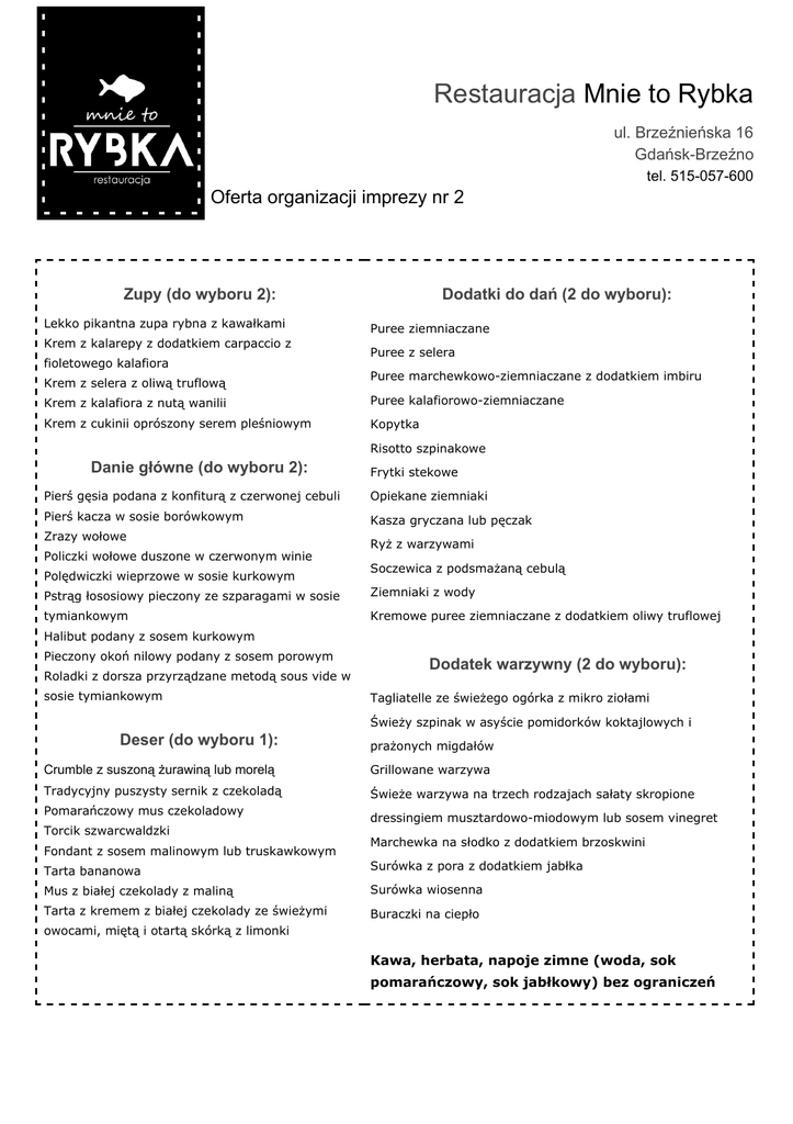 Restauracja Mnie to Rybka ul. Brzeźnieńska 16 Gdańsk-Brzeźno tel. 515-057-600 Oferta organizacji imprezy nr 2 Zupy (do wyboru 2): Lekko pikantna zupa rybna z kawałkami Krem z kalarepy z dodatkiem carpaccio z fioletowego kalafiora Krem z selera z oliwą truflową Dodatki do dań (2 do wyboru): Puree ziemniaczane Puree z selera Puree marchewkowo-ziemniaczane z dodatkiem imbiru Krem z kalafiora z nutą wanilii Puree kalafiorowo-ziemniaczane Krem z cukinii oprószony serem pleśniowym Kopytka Risotto szpinakowe Danie główne (do wyboru 2): Frytki stekowe Pierś gęsia podana z konfiturą z czerwonej cebuli Opiekane ziemniaki Pierś kacza w sosie borówkowym Kasza gryczana lub pęczak Zrazy wołowe Policzki wołowe duszone w czerwonym winie Polędwiczki wieprzowe w sosie kurkowym Ryż z warzywami Soczewica z podsmażaną cebulą Pstrąg łososiowy pieczony ze szparagami w sosie Ziemniaki z wody tymiankowym Kremowe puree ziemniaczane z dodatkiem oliwy truflowej Halibut podany z sosem kurkowym Pieczony okoń nilowy podany z sosem porowym Roladki z dorsza przyrządzane metodą sous vide w sosie tymiankowym Dodatek warzywny (2 do wyboru): Tagliatelle ze świeżego ogórka z mikro ziołami Świeży szpinak w asyście pomidorków koktajlowych i Deser (do wyboru 1): prażonych migdałów Crumble z suszoną żurawiną lub morelą Grillowane warzywa Tradycyjny puszysty sernik z czekoladą Świeże warzywa na trzech rodzajach sałaty skropione Pomarańczowy mus czekoladowy Torcik szwarcwaldzki Fondant z sosem malinowym lub truskawkowym dressingiem musztardowo-miodowym lub sosem vinegret Marchewka na słodko z dodatkiem brzoskwini Tarta bananowa Surówka z pora z dodatkiem jabłka Mus z białej czekolady z maliną Surówka wiosenna Tarta z kremem z białej czekolady ze świeżymi Buraczki na ciepło owocami, miętą i otartą skórką z limonki Kawa, herbata, napoje zimne (woda, sok pomarańczowy, sok jabłkowy) bez ograniczeń