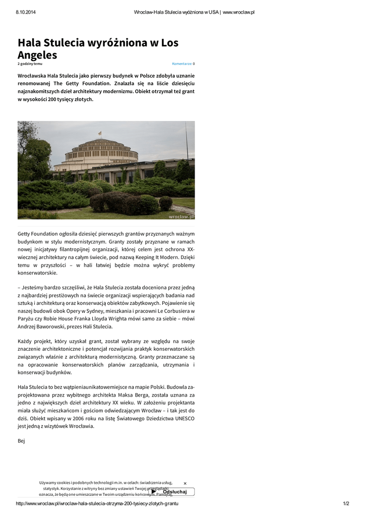 8.10.2014 Wroclaw-Hala Stulecia wyóżniona w USA | www.wroclaw.pl Hala Stulecia wyróżniona w Los Angeles 2 godziny temu Komentarze: 0 Wrocławska Hala Stulecia jako pierwszy budynek w Polsce zdobyła uznanie renomowanej The Getty Foundation. Znalazła się na liście dziesięciu najznakomitszych dzieł architektury modernizmu. Obiekt otrzymał też grant w wysokości 200 tysięcy złotych. Getty Foundation ogłosiła dziesięć pierwszych grantów przyznanych ważnym budynkom w stylu modernistycznym. Granty zostały przyznane w ramach nowej inicjatywy filantropijnej organizacji, której celem jest ochrona XXwiecznej architektury na całym świecie, pod nazwą Keeping It Modern. Dzięki temu w przyszłości – w hali łatwiej będzie można wykryć problemy konserwatorskie. – Je ste śmy bar dzo szczę śli wi, że Hala Stu le cia zo sta ła do ce nio na przez jedną z naj bar dziej pre sti żo wych na świe cie or ga ni za cji wspie ra ją cych ba da nia nad sztu ką i ar chi tek tu rą oraz kon ser wa cją obiek tów za byt ko wych. Po ja wie nie się na szej bu dow li obok Opery w Syd ney, miesz ka nia i pra cow ni Le Cor bu sie ra w Pa ry żu czy Robie House Fran ka Lloy da Wri gh ta mówi samo za sie bie – mówi An drzej Ba wo row ski, pre zes Hali Stu le cia. Każdy projekt, który uzyskał grant, został wybrany ze względu na swoje znaczenie architektoniczne i potencjał rozwijania praktyk konserwatorskich związanych właśnie z architekturą modernistyczną. Granty przeznaczane są na opracowanie konserwatorskich planów zarządzania, utrzymania i konserwacji budynków. Hala Stu le cia to bez wąt pie niauni ka to wemiej sce na mapie Pol ski. Bu dow la za pro jek to wa na przez wy bit ne go ar chi tek ta Maksa Berga, zo sta ła uzna na za jedno z naj więk szych dzieł ar chi tek tu ry XX wieku. W za ło że niu pro jek tan ta miała słu żyć miesz kań com i go ściom od wie dza ją cym Wro cław – i tak jest do dziś. Obiekt wpi sa ny w 2006 roku na listę Świa to we go Dzie dzic twa UNE SCO jest jedną z wi zy tó wek Wro cła wia. Bej Używamy cookies i podobnych technologii m.in. w celach: świadczenia usług, × statystyk. Korzystanie z witryny bez zmiany ustawień Twojej przeglądarki Odsłuchaj oznacza, że będą one umieszczane w Twoim urządzeniu końcowym. Pamiętaj, http://www.wroclaw.pl/wroclaw-hala-stulecia-otrzyma-200-tysiecy-zlotych-grantu 1/2