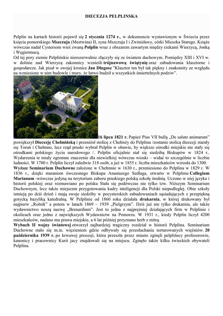 DIECEZJA PELPLINSKA Pelplin na kartach historii pojawił się 2 stycznia 1274 r., w dokumencie wystawionym w Świeciu przez księcia pomorskiego Mszczuja (Mestwina) II, syna Mszczuja I i Zwinisławy, córki Mieszka Starego. Książe wówczas nadał Cystersom wieś zwaną Polplin wraz z obszarem zawartym między rzekami Wierzycą, Jonką i Węgiermucą. Od tej pory ziemie Pelplińskie nierozerwalnie złączyły się ze światem duchowym. Pomiędzy XIII i XVI w. w dolinie nad Wierzycą zakonnicy wznieśli trójnawową świątynię oraz zabudowania klasztorne i gospodarcze. Jak pisał w swojej kronice Jan Długosz ”Klasztor ten był tak piękny i znakomity ze względu na wzniesione w nim budowle i mury, że łatwo budził u wszystkich śmiertelnych podziw”. 16 lipca 1821 r. Papież Pius VII bullą „De salute animarum” powiększył Diecezję Chełmińską i przeniósł stolicę z Chełmży do Pelplina /zostanie stolicą diecezji starały się Toruń i Chełmno, lecz rząd pruski wybrał Pelplin w obawie, by większe ośrodki miejskie nie stały się ośrodkami polskiego życia narodowego /. Pelplin oficjalnie stał się siedzibą Biskupów w 1824 r.. Wydarzenia te miały ogromne znaczenie dla niewielkiej wówczas wioski – widać to szczególnie w liczbie ludności. W 1780 r. Pelplin liczył zaledwie 318 osób, a już w 1855 r. liczba mieszkańców wzrosła do 1300. Wyższe Seminarium Duchowne założone w Chełmnie w 1630 r., przeniesiono do Pelplina w 1829 r. W 1836 r., dzięki staraniom ówczesnego Biskupa Anastazego Sedlaga, otwarto w Pelplinie Collegium Marianum -wówczas jedyną na terytorium zaboru pruskiego polską szkołę średnią. Uczono w niej języka i historii polskiej oraz rozmawiano po polsku Stała się podówczas nie tylko tzw. Niższym Seminarium Duchownym, lecz także miejscem przygotowania kadry inteligencji dla Polski niepodległej. Obie szkoły istnieją po dziś dzień i mają swoje siedziby w pocysterskich zabudowaniach sąsiadujących z przepiękną gotycką bazyliką katedralną. W Pelplinie od 1860 roku działała drukarnia, w której drukowany był najpierw „Rolnik” a potem w latach 1869 – 1939 „Pielgrzym”. Dziś już nie tylko drukarnia, ale także wydawnictwo noszą nazwę „Brenardinm”. Jest to jedna z najprężniej działających firm w Pelplinie i okolicach oraz jedno z największych Wydawnictw na Pomorzu. W 1931 r., kiedy Pelplin liczył 4200 mieszkańców, nadano mu prawa miejskie, a 6 lat później przyznano herb z mitrą. Wybuch II wojny światowej otworzył najbardziej tragiczny rozdział w historii Pelplina. Seminarium Duchowne stało się m.in. więzieniem gdzie odbywały się przesłuchania torturowanych więźniów. 20 października 1939 r. po krwawej procesji, która przeszła przez miasto zginęli pelplińscy profesorowie, kanonicy i pracownicy Kurii jacy znajdowali się na miejscu. Zginęło także kilku świeckich obywateli Pelplina. • • • Dzień 7 marca 1945 r. położył kres okupacji hitlerowskiej. Detonacje przy wysadzaniu mostów przez wycofujące się oddziały niemieckie zniszczyły witraże Katedry, kościoła parafialnego, kaplic Seminarium i Collegium Marianum. Jedyna bomba, która wpadła do Katedry, przebiwszy dach sklepienia za ołtarzem głównym, na szczęście nie eksplodowała (do dziś na suficie Katedry można wciąż dostrzec to miejsce). 25 marca 1992 r. Pelplin stał się Stolicą Diecezji Pelplińskiej. Pierwszym Biskupem Pelplińskim został ksiądz prof. dr hab. Jan Bernard Szlaga. Dzięki niemu i olbrzymiemu zaangażowaniu jego współpracowników zabytkowe budowle zostały odrestaurowane a w nim perła architektury Bazylika Katedralna, która jest drugim, co do wielkości kościołem w Polsce zbudowanym z cegły. Zespół zabytkowych budowli w Pelplinie, z jedynym w Polsce egzemplarzem Biblii Gutenberga, został odznaczony Certyfikatem Polskiej Organizacji Turystycznej dla najlepszego Produktu Turystycznego roku 2003. Pelplin nie bez powodu często nazywany jest Kulturową Stolicą Kociewia. Odbywa się tu wiele imprez o charakterze ogólnopolskim m.in.: Pomorski Festiwal Poetycki im. ks. Janusza St. Pasierba - odbywa się zawsze w drugiej połowie lutego. W Festiwalu uczestniczy młodzież z całej Polski. Pierwszy konkurs odbył się w 1995 r. Międzynarodowy Festiwal Muzyki Organowej w Bazylice Katedralnej w Pelplinie - po raz pierwszy festiwal odbył się w 1998 r. Koncerty odbywają się w Bazylice Katedralnej, w każdą środę lipca i sierpnia o godz. 19:00. W letnie wieczory do Pelplina przyjeżdża śmietanka świata muzyki a wraz z nią miłośnicy niepowtarzalnego dźwięku pelplińskich organów. Jarmark Cysterski - odbywa się w Pelplinie zawsze w trzeci weekend września. Wspaniale zachowane dziedzictwo kulturowe Cystersów oraz niepowtarzalnie wyeksponowana atmosfera średniowiecznych tradycji sprawiają, że jest jedną z najciekawszych atrakcji turystycznych Pomorza. Odbywa się tu także szereg imprez regionalnych tj.: Dożynki Gminne, Konkurs Gwary Kociewskiej, Światło i Dźwięk, Czwartki Poetyckie i festyny oraz pikniki wiejskie. Na obszarze gminy znajdują się liczne obiekty, pełne unikalnych w skali europejskiej, zabytków architektury, rzeźby i malarstwa począwszy od średniowiecza aż do czasów współczesnych. Największą atrakcją turystyczną naszego regionu jest Średniowieczny Pocysterski Zespół Zabytkowy, którego sercem jest Bazylika Katedralna z przełomu XIII i XVI w., jedno z najwybitniejszych dzieł architektury gotyckiej. Kryje ona w sobie przepiękny Ołtarz Główny, największy w tej części Europy, a jej barokowe wnętrza ozdabiają wspaniałe ołtarze z niepowtarzalnym malarstwem wielkich mistrzów: Hermana Hana,Bartłomieja Strobla i Andrzeja Stecha. Odrębną atrakcję Pelplina stanowią Muzeum Diecezjalne, Archiwum Diecezji Pelplińskiej oraz Biblioteka Wyższego Seminarium Duchownego, w których zgromadzono skarby malarstwa, rzeźby E