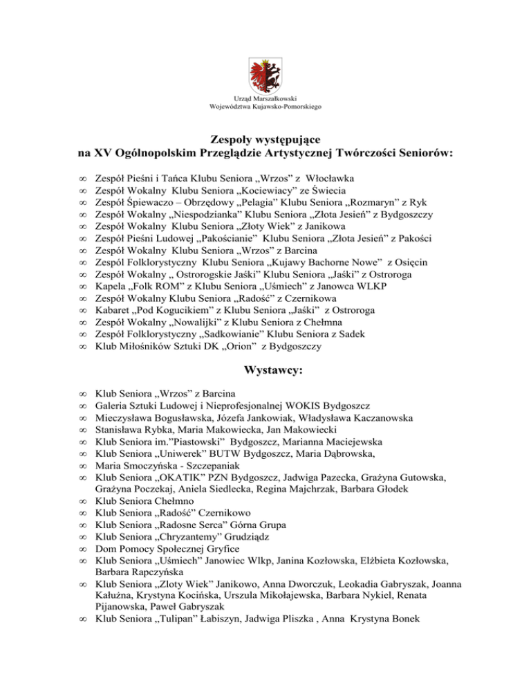 Urząd Marszałkowski Województwa Kujawsko-Pomorskiego Zespoły występujące na XV Ogólnopolskim Przeglądzie Artystycznej Twórczości Seniorów: • • • • • • • • • • • • • • • Zespół Pieśni i Tańca Klubu Seniora „Wrzos” z Włocławka Zespół Wokalny Klubu Seniora „Kociewiacy” ze Świecia Zespół Śpiewaczo – Obrzędowy „Pelagia” Klubu Seniora „Rozmaryn” z Ryk Zespół Wokalny „Niespodzianka” Klubu Seniora „Złota Jesień” z Bydgoszczy Zespół Wokalny Klubu Seniora „Złoty Wiek” z Janikowa Zespół Pieśni Ludowej „Pakościanie” Klubu Seniora „Złota Jesień” z Pakości Zespół Wokalny Klubu Seniora „Wrzos” z Barcina Zespól Folklorystyczny Klubu Seniora „Kujawy Bachorne Nowe” z Osięcin Zespół Wokalny „ Ostrorogskie Jaśki” Klubu Seniora „Jaśki” z Ostroroga Kapela „Folk ROM” z Klubu Seniora „Uśmiech” z Janowca WLKP Zespół Wokalny Klubu Seniora „Radość” z Czernikowa Kabaret „Pod Kogucikiem” z Klubu Seniora „Jaśki” z Ostroroga Zespół Wokalny „Nowalijki” z Klubu Seniora z Chełmna Zespół Folklorystyczny „Sadkowianie” Klubu Seniora z Sadek Klub Miłośników Sztuki DK „Orion” z Bydgoszczy Wystawcy: • • • • • • • • • • • • • • • • Klub Seniora „Wrzos” z Barcina Galeria Sztuki Ludowej i Nieprofesjonalnej WOKIS Bydgoszcz Mieczysława Bogusławska, Józefa Jankowiak, Władysława Kaczanowska Stanisława Rybka, Maria Makowiecka, Jan Makowiecki Klub Seniora im.”Piastowski” Bydgoszcz, Marianna Maciejewska Klub Seniora „Uniwerek” BUTW Bydgoszcz, Maria Dąbrowska, Maria Smoczyńska - Szczepaniak Klub Seniora „OKATIK” PZN Bydgoszcz, Jadwiga Pazecka, GraŜyna Gutowska, GraŜyna Poczekaj, Aniela Siedlecka, Regina Majchrzak, Barbara Głodek Klub Seniora Chełmno Klub Seniora „Radość” Czernikowo Klub Seniora „Radosne Serca” Górna Grupa Klub Seniora „Chryzantemy” Grudziądz Dom Pomocy Społecznej Gryfice Klub Seniora „Uśmiech” Janowiec Wlkp, Janina Kozłowska, ElŜbieta Kozłowska, Barbara Rapczyńska Klub Seniora „Zloty Wiek” Janikowo, Anna Dworczuk, Leokadia Gabryszak, Joanna KałuŜna, Krystyna Kocińska, Urszula Mikołajewska, Barbara Nykiel, Renata Pijanowska, Paweł Gabryszak Klub Seniora „Tulipan” Łabiszyn, Jadwiga Pliszka , Anna Krystyna Bonek • • • • • • • • • • • • • • • • • • • Klub Seniora „Razem Raźniej” Łochowo Klub Seniora „Łojewianie” Łojewo Klub Seniora „Jesienni Entuzjaści” Nałęczów Klub Seniora „Jaśki” Ostroróg Kolo Seniora przy DDP „Magda – Maria” Koło Plastyczna „Tęcza” Opole Klub Seniora „Białe Zagłębie” Piechcin Klub Seniora „Zacisze” Piła, Sekcja Plastyczna „Plama” Klub Seniora „Enea SA” Poznań Klub Seniora „Aster” Rogowo Klub Seniora „Rozmaryn” Ryki Klub Seniora „Uniwerek” Szczecin Klub Seniora „Kociewiacy” Świecie, Jerzy Dończyk Toruński Uniwersytet Trzeciego Wieku Toruń Klub Seniora „Supełek” Toruń Klub Aktywnego Seniora Wieliczka, Zofia Machnik, Maria Wojas, Maria Gurgul, Maria Guła Klub Seniora „Atłasek” Więcbork Klub Seniora „Wrzos” Włocławek, Stanisława Marchaluk, Zdzisław Witkowski Klub Seniora „Stokrotka” Włocławek, Halina Rucińska Klub Seniora „Uśmiech” Wolbórz WOKiS Stara Ochronka w Bydgoszczy sierpień 2011