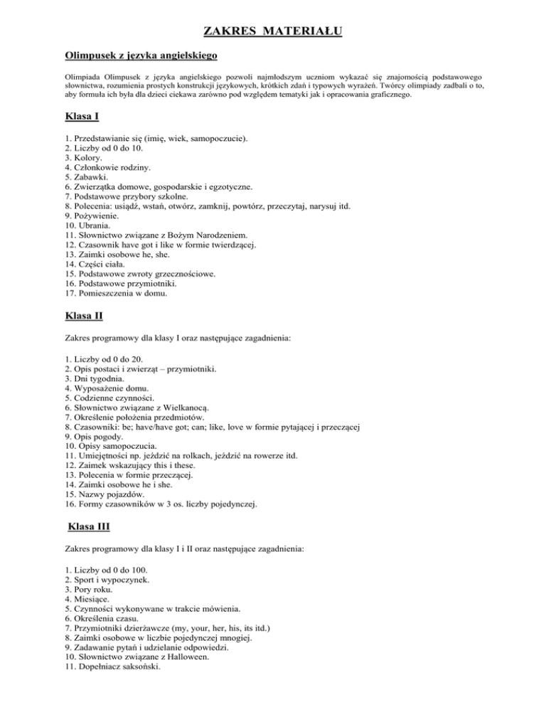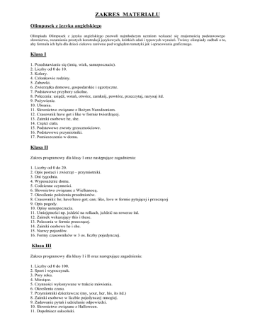 ZAKRES MATERIAŁU Olimpusek z języka angielskiego Olimpiada Olimpusek z języka angielskiego pozwoli najmłodszym uczniom wykazać się znajomością podstawowego słownictwa, rozumienia prostych konstrukcji językowych, krótkich zdań i typowych wyrażeń. Twórcy olimpiady zadbali o to, aby formuła ich była dla dzieci ciekawa zarówno pod względem tematyki jak i opracowania graficznego. Klasa I 1. Przedstawianie się (imię, wiek, samopoczucie). 2. Liczby od 0 do 10. 3. Kolory. 4. Członkowie rodziny. 5. Zabawki. 6. Zwierzątka domowe, gospodarskie i egzotyczne. 7. Podstawowe przybory szkolne. 8. Polecenia: usiądź, wstań, otwórz, zamknij, powtórz, przeczytaj, narysuj itd. 9. Pożywienie. 10. Ubrania. 11. Słownictwo związane z Bożym Narodzeniem. 12. Czasownik have got i like w formie twierdzącej. 13. Zaimki osobowe he, she. 14. Części ciała. 15. Podstawowe zwroty grzecznościowe. 16. Podstawowe przymiotniki. 17. Pomieszczenia w domu. Klasa II Zakres programowy dla klasy I oraz następujące zagadnienia: 1. Liczby od 0 do 20. 2. Opis postaci i zwierząt – przymiotniki. 3. Dni tygodnia. 4. Wyposażenie domu. 5. Codzienne czynności. 6. Słownictwo związane z Wielkanocą. 7. Określenie położenia przedmiotów. 8. Czasowniki: be; have/have got; can; like, love w formie pytającej i przeczącej 9. Opis pogody. 10. Opisy samopoczucia. 11. Umiejętności np. jeździć na rolkach, jeździć na rowerze itd. 12. Zaimek wskazujący this i these. 13. Polecenia w formie przeczącej. 14. Zaimki osobowe he i she. 15. Nazwy pojazdów. 16. Formy czasowników w 3 os. liczby pojedynczej. Klasa III Zakres programowy dla klasy I i II oraz następujące zagadnienia: 1. Liczby od 0 do 100. 2. Sport i wypoczynek. 3. Pory roku. 4. Miesiące. 5. Czynności wykonywane w trakcie mówienia. 6. Określenia czasu. 7. Przymiotniki dzierżawcze (my, your, her, his, its itd.) 8. Zaimki osobowe w liczbie pojedynczej mnogiej. 9. Zadawanie pytań i udzielanie odpowiedzi. 10. Słownictwo związane z Halloween. 11. Dopełniacz saksoński.
