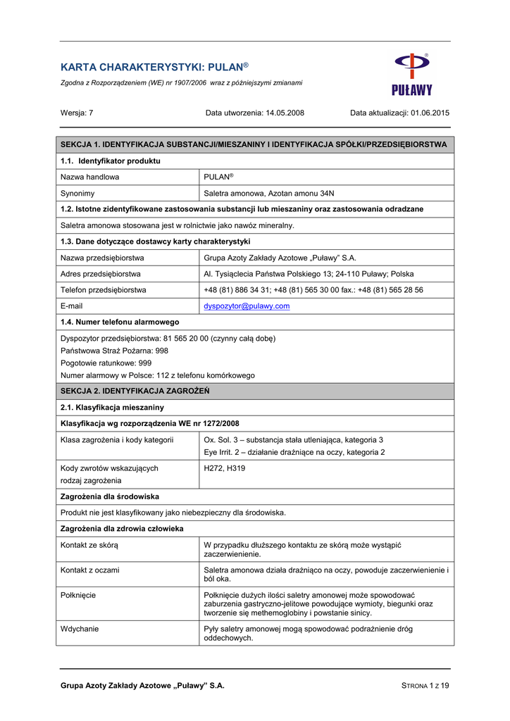 KARTA CHARAKTERYSTYKI: PULAN® Zgodna z Rozporządzeniem (WE) nr 1907/2006 wraz z późniejszymi zmianami Wersja: 7 Data utworzenia: 14.05.2008 Data aktualizacji: 01.06.2015 SEKCJA 1. IDENTYFIKACJA SUBSTANCJI/MIESZANINY I IDENTYFIKACJA SPÓŁKI/PRZEDSIĘBIORSTWA 1.1. Identyfikator produktu Nazwa handlowa PULAN® Synonimy Saletra amonowa, Azotan amonu 34N 1.2. Istotne zidentyfikowane zastosowania substancji lub mieszaniny oraz zastosowania odradzane Saletra amonowa stosowana jest w rolnictwie jako nawóz mineralny. 1.3. Dane dotyczące dostawcy karty charakterystyki Nazwa przedsiębiorstwa Grupa Azoty Zakłady Azotowe „Puławy” S.A. Adres przedsiębiorstwa Al. Tysiąclecia Państwa Polskiego 13; 24-110 Puławy; Polska Telefon przedsiębiorstwa +48 (81) 886 34 31; +48 (81) 565 30 00 fax.: +48 (81) 565 28 56 E-mail [email protected] 1.4. Numer telefonu alarmowego Dyspozytor przedsiębiorstwa: 81 565 20 00 (czynny całą dobę) Państwowa Straż Pożarna: 998 Pogotowie ratunkowe: 999 Numer alarmowy w Polsce: 112 z telefonu komórkowego SEKCJA 2. IDENTYFIKACJA ZAGROŻEŃ 2.1. Klasyfikacja mieszaniny Klasyfikacja wg rozporządzenia WE nr 1272/2008 Klasa zagrożenia i kody kategorii Ox. Sol. 3 – substancja stała utleniająca, kategoria 3 Eye Irrit. 2 – działanie drażniące na oczy, kategoria 2 Kody zwrotów wskazujących H272, H319 rodzaj zagrożenia Zagrożenia dla środowiska Produkt nie jest klasyfikowany jako niebezpieczny dla środowiska. Zagrożenia dla zdrowia człowieka Kontakt ze skórą W przypadku dłuższego kontaktu ze skórą może wystąpić zaczerwienienie. Kontakt z oczami Saletra amonowa działa drażniąco na oczy, powoduje zaczerwienienie i ból oka. Połknięcie Połknięcie dużych ilości saletry amonowej może spowodować zaburzenia gastryczno-jelitowe powodujące wymioty, biegunki oraz tworzenie się methemoglobiny i powstanie sinicy. Wdychanie Pyły saletry amonowej mogą spowodować podrażnienie dróg oddechowych. Grupa Azoty Zakłady Azotowe „Puławy” S.A. STRONA 1 Z 19 KARTA CHARAKTERYSTYKI: PULAN® Zgodna z Rozporządzeniem (WE) nr 1907/2006 wraz z późniejszymi zmianami Wersja: 7 Data utworzenia: 14.05.2008 Data aktualizacji: 01.06.2015 Efekty długoterminowe W kilka godzin po zatruciu drogą pokarmową może wystąpić sinoniebieskie zabarwienie warg, paznokci, skóry wskutek methemoglobinemii. Zagrożenia związane z właściwościami fizykochemicznymi Azotan amonowy jest produktem niepalnym, niemniej jednak wzmaga palność innych substancji. W temperaturach wyższych niż temperatura topnienia (patrz pkt. 9.1.) czysty azotan amonu ulega rozkładowi. W zamkniętych przestrzeniach rozkład może prowadzić do wybuchu. Substancje wymienione w pkt.10.5. katalizują rozkład zwiększając zagrożenie pożarowo-wybuchowe. Podczas pożaru z udziałem azotanu amonu powstają toksyczne produkty rozkładu: NOx, NH3. 2.2. Elementy oznakowania Piktogram GHS03 GHS07 Hasło ostrzegawcze Uwaga Zwroty H H272 - Może intensyfikować pożar; utleniacz H319 - Działa drażniąco na oczy. Zwroty P P210: Przechowywać z dala od źródeł ciepła, gorących powierzchni, źródeł iskrzenia, otwartego ognia i innych źródeł zapłonu. Nie palić. P221: Zastosować wszelkie środki ostrożności w celu uniknięcia mieszania z innymi materiałami zapalnymi. P280: Stosować rękawice ochronne/odzież ochronną/ochronę oczu/ochronę twarzy. P305 + P351 + P338: W PRZYPADKU DOSTANIA SIĘ DO OCZU: Ostrożnie płukać wodą przez kilka minut. Wyjąć soczewki kontaktowe, jeżeli są i można je łatwo usunąć. Nadal płukać. P337 + P313: W przypadku utrzymywania się działania drażniącego na oczy: Zasięgnąć porady/zgłosić się pod opiekę lekarza. 2.3. Inne zagrożenia Dla substancji nie stosuje się kryteriów przyjętych dla substancji trwałych, wykazujących zdolność do bioakumulacji i toksycznych (ang. Persistent, Bioaccumulative, Toxic – PBT) ani substancji bardzo trwałych i wykazujących bardzo dużą zdolność do bioakumulacji (ang. very Persistent very Bioaccumulative - vPvB). SEKCJA 3. SKŁAD/INFORMACJA O SKŁADNIKACH 3.1. Substancje Nie dotyczy 3.2. Mieszaniny Identyfikator produktu PULAN® Klasyfikacja składników wg Rozporządzenia (WE) 1272/2008 Grupa Azoty Zakłady Azotowe „Puławy” S.A. STRONA 2 Z 19 KARTA CHARAKTERYSTYKI: PULAN® Zgodna z Rozporządzeniem (WE) nr 1907/2006 wraz z późniejszymi zmianami Wersja: 7 Data utworzenia: 14.05.2008 Nazwa składnika Stężenie Nr WE Nr rejestracji Azotan (V) amonu ≥ 98% 229-347-8 01-2119490981-27-0025 Azotan (V) magnezu ≤ 2% 233-826-7 01-2119491164-38-0008 Data aktualizacji: 01.06.2015 Klasy zagrożenia i kody kategorii Zwroty H Oxid. Solid 3 H272 Eye Irrit. 2 H319 Oxid. Solid 3 H272 Pełne brzmienie zwrotów wskazujących rodzaj zagrożenia (zwrotów H) znajduje się w punkcie 16. SEKCJA 4. ŚRODKI PIERWSZEJ POMOCY 4.1. Opis środków pierwszej pomocy Informacje ogólne Stosować odpowiednią wentylację miejscową i ogólną. Zaleca się wyposażenie miejsca pracy w prysznic oraz myjkę oczu. Inhalacja Usunąć poszkodowanego z miejsca zagrożenia zapewniając dostęp świeżego powietrza. W przypadku wystąpienia objawów zatrucia zapewnić pomoc medyczną. Połknięcie W przypadku spożycia, należy poszkodowanemu podać do picia dużą ilość wody. Nie wywoływać wymiotów. Małe dawki zazwyczaj nie wywołują objawów zatrucia. Spożycie większych ilości nawozu prowadzić może do zaburzeń żołądkowo trawiennych, spadku ciśnienia krwi oraz tworzenia się methemoglobiny. Wezwać pomoc lekarską. Skóra Zdjąć zanieczyszczoną odzież. Skórę spłukać dużą ilością wody. W przypadku wystąpienia podrażnień skontaktować się z lekarzem. Oczy Przemywać oczy dużą ilością wody przez około 15 minut. Unikać silnego strumienia wody ze względu na możliwość uszkodzenia rogówki. Następnie zgłosić się do okulisty. 4.2. Najważniejsze ostre i opóźnione objawy ora
