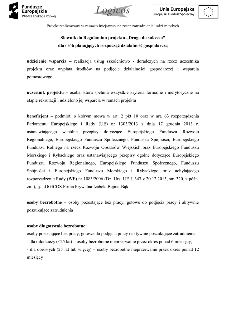 Projekt realizowany w ramach Inicjatywy na rzecz zatrudnienia ludzi młodych Słownik do Regulaminu projektu „Droga do sukcesu” dla osób planujących rozpocząć działalność gospodarczą udzielenie wsparcia – realizacja usług szkoleniowo - doradczych na rzecz uczestnika projektu oraz wypłata środków na podjęcie działalności gospodarczej i wsparcia pomostowego uczestnik projektu – osoba, która spełniła wszystkie kryteria formalne i merytoryczne na etapie rekrutacji i udzielono jej wsparcia w ramach projektu beneficjent – podmiot, o którym mowa w art. 2 pkt 10 oraz w art. 63 rozporządzenia Parlamentu Europejskiego i Rady (UE) nr 1303/2013 z dnia 17 grudnia 2013 r. ustanawiającego wspólne przepisy dotyczące Europejskiego Funduszu Rozwoju Regionalnego, Europejskiego Funduszu Społecznego, Funduszu Spójności, Europejskiego Funduszu Rolnego na rzecz Rozwoju Obszarów Wiejskich oraz Europejskiego Funduszu Morskiego i Rybackiego oraz ustanawiającego przepisy ogólne dotyczące Europejskiego Funduszu Rozwoju Regionalnego, Europejskiego Funduszu Społecznego, Funduszu Spójności i Europejskiego Funduszu Morskiego i Rybackiego oraz uchylającego rozporządzenie Rady (WE) nr 1083/2006 (Dz. Urz. UE L 347 z 20.12.2013, str. 320, z późn. zm.), tj. LOGICOS Firma Prywatna Izabela Bejma-Bąk osoby bezrobotne – osoby pozostające bez pracy, gotowe do podjęcia pracy i aktywnie poszukujące zatrudnienia osoby długotrwale bezrobotne: osoby pozostające bez pracy, gotowe do podjęcia pracy i aktywnie poszukujące zatrudnienia: - dla młodzieży (<25 lat) – osoby bezrobotne nieprzerwanie przez okres ponad 6 miesięcy, - dla dorosłych (25 lat lub więcej) – osoby bezrobotne nieprzerwanie przez okres ponad 12 miesięcy Projekt realizowany w ramach Inicjatywy na rzecz zatrudnienia ludzi młodych osoby bierne zawodowo – osoby, które w danej chwili nie tworzą zasobów siły roboczej (tzn. nie pracują1 i nie są bezrobotne), w tym osoby będące na urlopie wychowawczym (rozumianym jako nieobecność w pracy, spowodowana opieką nad dzieckiem w okresie, który nie mieści się w ramach urlopu macierzyńskiego lub urlopu rodzicielskiego), chyba że są zarejestrowane już jako bezrobotne2 wówczas status bezrobotnego ma pierwszeństwo osoby o niskich kwalifikacjach – do kategorii osób o niskich kwalifikacjach należy zaliczyć osoby posiadające wykształcenie na poziomie do ISCED 3 włącznie tj.: wykształcenie ponadgimnazjalne, ma na celu uzupełnienie wykształcenia średniego i przygotowanie do podjęcia studiów wyższych lub umożliwienie osobom uczącym się nabycia umiejętności istotnych dla podjęcia zatrudnienia. Uczniowie przystępują do nauki na tym poziomie zwykle pomiędzy 15, a 16 rokiem życia. Programy na poziomie ISCED 3 z reguły kończą się 12 lub 13 lat po rozpoczęciu nauki na poziomie ISCED 1 (lub mniej więcej w wieku 18 lat), przy czym najczęściej jest to okres 12 lat. 1 Osoby pracujące to osoby w wieku 15 lat i więcej, które wykonują pracę, za którą otrzymują wynagrodzenie, z której czerpią zyski lub korzyści rodzinne lub osoby posiadające zatrudnienie lub własną działalność, które jednak chwilowo nie pracowały ze względu na np. chorobę, urlop, spór pracowniczy czy kształcenie się lub szkolenie. Osoby prowadzące działalność na własny rachunek – prowadzące działalność gospodarczą, gospodarstwo rolne lub praktykę zawodową - są również uznawane za pracujących, o ile spełniony jest jeden z poniższych warunków: 1) osoba pracuje w swojej działalności, praktyce zawodowej lub gospodarstwie rolnym w celu uzyskania dochodu, nawet jeżeli przedsiębiorstwo nie osiąga zysków; 2) osoba poświęca czas na prowadzenie działalności gospodarczej, praktyki zawodowej czy gospodarstwa rolnego, nawet jeżeli nie zrealizowano żadnej sprzedaży lub usług i nic nie wyprodukowano (np. rolnik wykonujący prace w celu utrzymania swojego gospodarstwa; architekt spędzający czas w oczekiwaniu na klientów w swoim biurze; rybak naprawiający łódkę czy siatki rybackie, aby móc dalej pracować; osoby uczestniczące w konwencjach lub seminariach); 3) osoba jest w trakcie zakładania działalności gospodarczej, gospodarstwa rolnego lub praktyki zawodowej; zalicza się do tego zakup lub instalację sprzętu, zamawianie towarów w ramach przygotowań do uruchomienia działalności. Bezpłatnie pomagający członek rodziny uznawany jest za osobę pracującą, jeżeli wykonywaną przez siebie pracą wnosi bezpośredni wkład w działalność gospodarczą, gospodarstwo rolne lub praktykę zawodową będącą w posiadaniu lub prowadzoną przez spokrewnionego członka tego samego gospodarstwa domowego. Bezpłatnie pomagający osobie prowadzącej działalność członek rodziny uznawany jest za „osobę prowadzącą działalność na własny rachunek”. Żołnierze poborowi, którzy wykonywali określoną pracę, za którą otrzymywali wynagrodzenie lub innego rodzaju zysk w czasie tygodnia odniesienia nie są uznawani za "osoby pracujące" – o ile obowiązkowy pobór i powołanie do wojska dotyczy państwa członkowskiego. Osoby przebywające na urlopie macierzyńskim/rodzicielskim (rozumianym jako świadczenie pracownicze, który zapewnia płatny lub bezpłatny czas wolny od pracy do momentu porodu i obejmuje późniejszą krótkoterminową opiekę nad dzieckiem) są uznawane za „osoby pracujące”. Osoby przebywające na urlopie wychowawczym (rozumianym jako nieobecność w pracy, spowodowaną opieką nad dzieckiem w okresie, który nie mieści się w ramach urlopu macierzyńskiego lub rodzicielskiego) są uznawane za „osoby bierne zawodowo”, chyba że są zarejestrowane już jako „osoby bezrobotne” (wówczas status bezrobotnego ma pierwszeństwo). „Zatrudnienie subsydiowane” jest uznawane za "zatrudnienie”. Należy je rozumieć jako zachętę do zatrudnienia zgodnie z definicjami Polityki Rynk