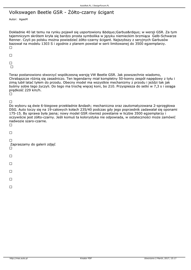 AutoRok.PL / DesignForum.PL Volkswagen Beetle GSR - Żółto-czarny ścigant Autor: AgaeM Dokładnie 40 lat temu na rynku pojawił się usportowiony „Garbus” w wersji GSR. Za tym tajemniczym skrótem kryła się bardzo prosta symbolika w języku niemieckim brzmiąca Gelb-Schwarze Renner. Czyli po polsku można powiedzieć żółto-czarny ścigant. Najszybszy z seryjnych Garbusów bazował na modelu 1303 S i zgodnie z planem powstał w serii limitowanej do 3500 egzemplarzy. Teraz postanowiono stworzyć współczesną wersję VW Beetle GSR. Jak powszechnie wiadomo, Chrabąszcze różnią się zasadniczo. Ten legendarny miał kompletny 50-konny zespół napędowy z tyłu i zimą lubił latać tyłem do przodu. Obecny model ma wszystkie mechanizmy z przodu i jeździ tak jak byśmy sobie tego życzyli. Do tego ma trochę więcej koni, bo 210. Przyspiesza do setki w 7,3 s i osiąga prędkość 229 km/h. Do wyboru są dwie 6-biegowe przekładnie – mechaniczna oraz zautomatyzowana 2-sprzęgłowa DSG. Auto toczy się na 19-calowych kołach 235/40 podczas gdy jego poprzednik zadawalał się oponami 175-15. By sprawa była jasna; nowy model GSR również powstanie w liczbie 3500 egzemplarzy i oczywiście jest żółto-czarny. Jeśli komuś ta kolorystyka nie odpowiada, w ostateczności może zamówić nadwozie szaro-czarne. Zapraszamy do galerii zdjęć http://mas.auto.pl Kreator PDF Utworzono 2 March, 2017, 15:17