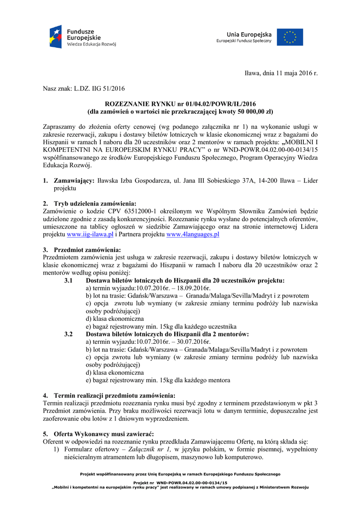 Iława, dnia 11 maja 2016 r. Nasz znak: L.DZ. IIG 51/2016 ROZEZNANIE RYNKU nr 01/04.02/POWR/IŁ/2016 (dla zamówień o wartości nie przekraczającej kwoty 50 000,00 zł) Zapraszamy do złożenia oferty cenowej (wg podanego załącznika nr 1) na wykonanie usługi w zakresie rezerwacji, zakupu i dostawy biletów lotniczych w klasie ekonomicznej wraz z bagażami do Hiszpanii w ramach I naboru dla 20 uczestników oraz 2 mentorów w ramach projektu: „MOBILNI I KOMPETENTNI NA EUROPEJSKIM RYNKU PRACY” o nr WND-POWR.04.02.00-00-0134/15 współfinansowanego ze środków Europejskiego Funduszu Społecznego, Program Operacyjny Wiedza Edukacja Rozwój. 1. Zamawiający: Iławska Izba Gospodarcza, ul. Jana III Sobieskiego 37A, 14-200 Iława – Lider projektu 2. Tryb udzielenia zamówienia: Zamówienie o kodzie CPV 63512000-1 określonym we Wspólnym Słowniku Zamówień będzie udzielone zgodnie z zasadą konkurencyjności. Rozeznanie rynku wysłane do potencjalnych oferentów, umieszczone na tablicy ogłoszeń w siedzibie Zamawiającego oraz na stronie internetowej Lidera projektu www.iig-ilawa.pl i Partnera projektu www.4languages.pl 3. Przedmiot zamówienia: Przedmiotem zamówienia jest usługa w zakresie rezerwacji, zakupu i dostawy biletów lotniczych w klasie ekonomicznej wraz z bagażami do Hiszpanii w ramach I naboru dla 20 uczestników oraz 2 mentorów według opisu poniżej: 3.1 Dostawa biletów lotniczych do Hiszpanii dla 20 uczestników projektu: a) termin wyjazdu:10.07.2016r. – 18.09.2016r. b) lot na trasie: Gdańsk/Warszawa – Granada/Malaga/Sevilla/Madryt i z powrotem c) opcja zwrotu lub wymiany (w zakresie zmiany terminu podróży lub nazwiska osoby podróżującej) d) klasa ekonomiczna e) bagaż rejestrowany min. 15kg dla każdego uczestnika 3.2 Dostawa biletów lotniczych do Hiszpanii dla 2 mentorów: a) termin wyjazdu:10.07.2016r. – 30.07.2016r. b) lot na trasie: Gdańsk/Warszawa – Granada/Malaga/Sevilla/Madryt i z powrotem c) opcja zwrotu lub wymiany (w zakresie zmiany terminu podróży lub nazwiska osoby podróżującej) d) klasa ekonomiczna e) bagaż rejestrowany min. 15kg dla każdego mentora 4. Termin realizacji przedmiotu zamówienia: Termin realizacji przedmiotu rozeznania rynku musi być zgodny z terminem przedstawionym w pkt 3 Przedmiot zamówienia. Przy braku możliwości rezerwacji lotu w danym terminie, dopuszczalne jest zaoferowanie obu lotów z 1 dniowym wyprzedzeniem. 5. Oferta Wykonawcy musi zawierać: Oferent w odpowiedzi na rozeznanie rynku przedkłada Zamawiającemu Ofertę, na którą składa się: 1) Formularz ofertowy – Załącznik nr 1, w języku polskim, w formie pisemnej, wypełniony nieścieralnym atramentem lub długopisem, maszynowo lub komputerowo. Projekt współfinansowany przez Unię Europejską w ramach Europejskiego Funduszu Społecznego Projekt nr WND-POWR.04.02.00-00-0134/15 „Mobilni i kompetentni na europejskim rynku pracy” jest realizowany w ramach umowy podpisanej z Ministerstwem Rozwoju 2) Oświadczenie Oferenta o spełnieniu warunków udziału w odpowiedzi na rozeznanie rynku o posiadaniu uprawnień do wykonywania określonej działalności lub czynności, jeżeli ustawy nakładają obowiązek posiadania takich uprawnień – Załącznik nr 2. 3) Oświadczenie Wykonawcy o braku powiązań osobowych lub kapitałowych – Załącznik nr 3. 4) Oferowana cena powinna być podana w kwocie netto/brutto, powinna zawierać wszystkie koszty i podatki związane z oferowaną realizacją usługi. Ostateczna cena powinna być liczona z dokładnością do dwóch miejsc po przecinku, podana w złotych polskich, cyfrowo i słownie. 5) Wszelkie poprawki lub zmiany w tekście Oferty muszą być naniesione w sposób czytelny, datowane i podpisane przez osobę upoważnioną do reprezentowania firmy na zewnątrz (czytelnie lub z imienną pieczątką). 7. Miejsce i termin składania oferty: Ofertę należy złożyć osobiście w siedzibie Zamawiającego, przesłać do siedziby Zamawiającego w zamkniętej kopercie oznaczonej danymi Oferenta (pieczęć firmowa) oraz napisem: „Rozeznanie rynku nr 01/04.02/POWR/IŁ/2016” na adres: Iławska Izba Gospodarcza, ul. Jana III Sobieskiego 37A, 14-200 Iława lub dostarczyć za pośrednictwem poczty elektronicznej na adres: [email protected] Termin składania ofert upływa dnia 16 maja 2016 r. o godz. 15.00 8. Sposób rozliczenia Rozliczenie na podstawie rachunku/faktury. Wynagrodzenie wypłacane będzie przelewem na rachunek bankowy Wykonawcy w terminie 14 dni od daty złożenia poprawnie wystawionego rachunku/ faktury przez Wykonawcę. 9. Zamawiający zastrzega sobie prawo do: 1) Podjęcia dalszych negocjacji w celu zawarcia umowy. 2) Rezygnacji z wyboru oferty bez podania przyczyn. 10. Opis sposobu udzielania wyjaśnień dotyczących przedmiotu zamówienia. Wszelkie informacje i wyjaśnienia związane z zakresem zamówienia można uzyskać w Iławskiej Izbie Gospodarczej, ul. Jana III Sobieskiego 37 A, 14-200 Iława. Informacji udziela specjalista ds. rekrutacji i organizacji wsparcia pani Barbara Zawieska pod numerem telefonu 89 648 57 51. Projekt współfinansowany przez Unię Europejską w ramach Europejskiego Funduszu Społecznego Projekt nr WND-POWR.04.02.00-00-0134/15 „Mobilni i kompetentni na europejskim rynku pracy” jest realizowany w ramach umowy podpisanej z Ministerstwem Rozwoju