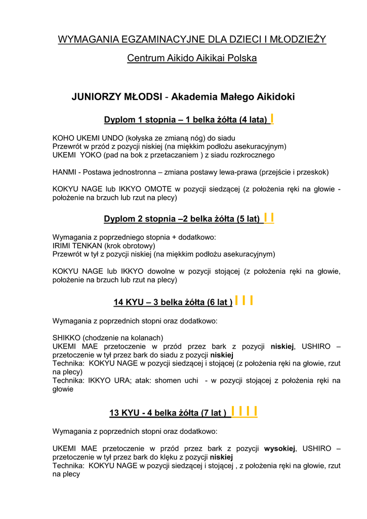 WYMAGANIA EGZAMINACYJNE DLA DZIECI I MŁODZIEŻY Centrum Aikido Aikikai Polska JUNIORZY MŁODSI - Akademia Małego Aikidoki Dyplom 1 stopnia – 1 belka żółta (4 lata) I KOHO UKEMI UNDO (kołyska ze zmianą nóg) do siadu Przewrót w przód z pozycji niskiej (na miękkim podłożu asekuracyjnym) UKEMI YOKO (pad na bok z przetaczaniem ) z siadu rozkrocznego HANMI - Postawa jednostronna – zmiana postawy lewa-prawa (przejście i przeskok) KOKYU NAGE lub IKKYO OMOTE w pozycji siedzącej (z położenia ręki na głowie położenie na brzuch lub rzut na plecy) Dyplom 2 stopnia –2 belka żółta (5 lat) II Wymagania z poprzedniego stopnia + dodatkowo: IRIMI TENKAN (krok obrotowy) Przewrót w tył z pozycji niskiej (na miękkim podłożu asekuracyjnym) KOKYU NAGE lub IKKYO dowolne w pozycji stojącej (z położenia ręki na głowie, położenie na brzuch lub rzut na plecy) 14 KYU – 3 belka żółta (6 lat ) I II Wymagania z poprzednich stopni oraz dodatkowo: SHIKKO (chodzenie na kolanach) UKEMI MAE przetoczenie w przód przez bark z pozycji niskiej, USHIRO – przetoczenie w tył przez bark do siadu z pozycji niskiej Technika: KOKYU NAGE w pozycji siedzącej i stojącej (z położenia ręki na głowie, rzut na plecy) Technika: IKKYO URA; atak: shomen uchi - w pozycji stojącej z położenia ręki na głowie 13 KYU - 4 belka żółta (7 lat ) IIII Wymagania z poprzednich stopni oraz dodatkowo: UKEMI MAE przetoczenie w przód przez bark z pozycji wysokiej, USHIRO – przetoczenie w tył przez bark do klęku z pozycji niskiej Technika: KOKYU NAGE w pozycji siedzącej i stojącej , z położenia ręki na głowie, rzut na plecy Technika: IKKYO OMOTE/ URA; atak: shomen uchi - w pozycji stojącej z położenia ręki na głowie 12 KYU - 5 belka żółta - (8 lat) IIIII Wymagania z poprzednich stopni oraz dodatkowo: USHIRO – przetoczenie w przód przez bark do pozycji wysokiej dowolnej) Technika: IKKYO OMOTE/ URA; atak: shomen uchi - w pozycji stojącej z położenia ręki na głowie – unieruchomienie na brzuchu. Technika: SUMI OTOSHI; atak: katatetori - w pozycji stojącej (lustrzanej) chwyt za rękę – rzut na plecy JUNIORZY ŚREDNI 11 KYU (9 lat) – pas ŻÓŁTY Wymagania z poprzednich stopni oraz dodatkowo: Technika: IKKYO OMOTE/ URA; atak: shomen uchi - w pozycji stojącej z położenia ręki na głowie – unieruchomienie na brzuchu. Technika: SUMI OTOSHI; atak: katatetori - w pozycji stojącej (lustrzanej) chwyt za rękę – rzut na plecy Technika: KOKYU NAGE 2; atak: ushiro ryote dori – chwyt z tyłu za ręce, zejście z linii ataku, przerzucenie partnera w przód Technika: TENCHI NAGE; atak: katadori – w pozycji stojącej chwyt za rękaw na wysokości ramienia 10 KYU (10 lat) – pas POMARAŃCZOWY Wymagania z poprzednich stopni oraz dodatkowo: USHIRO – przetoczenie przez bark do pozycji stojącej z pozycji wysokiej - hanmi) Technika: IKKYO OMOTE/ URA; atak: shomen uchi - w pozycji stojącej z położenia ręki na głowie – unieruchomienie na brzuchu. Technika: SUMI OTOSHI; atak: katatetori - w pozycji stojącej (lustrzanej) chwyt za rękę – rzut na plecy Technika: KOKYU NAGE 2; atak: ushiro ryote dori – chwyt z tyłu za ręce, zejście z linii ataku, przerzucenie partnera w przód Technika: TENCHI NAGE; atak: katadori – w pozycji stojącej, chwyt za rękaw na wysokości ramienia Technika: UCHI KAITEN NAGE; atak: katate dori – z chwytu za nadgarstek 9 KYU (11 lat) – pas ZIELONY Wymagania z poprzednich stopni oraz dodatkowo: Technika: IKKYO OMOTE/ URA; atak: shomen uchi - w pozycji stojącej z położenia ręki na głowie – unieruchomienie na brzuchu. Technika: SUMI OTOSHI; atak: katatetori - w pozycji stojącej (lustrzanej) chwyt za rękę – rzut na plecy Technika: KOKYU NAGE 2; atak: ushiro ryote dori – chwyt z tyłu za ręce, zejście z linii ataku, przerzucenie partnera w przód Technika: TENCHI NAGE; atak: katadori – w pozycji stojącej, chwyt za rękaw na wysokości ramienia Technika: UCHI KAITEN NAGE; atak: katate dori – z chwytu za nadgarstek Technika: KOTE GAESHI; atak: chudan tsuki – z uderzenia pięścią w brzuch Technika: KOKYU NAGE; atak: ryokata dori – suwari waza (chwyt z przodu oburącz za ramiona) JUNIORZY STARSI 8 KYU (12 lat) – pas NIEBIESKI Technika: IKKYO OMOTE/ URA; atak: shomen uchi - w pozycji stojącej z położenia ręki na głowie – unieruchomienie na brzuchu. Technika: SUMI OTOSHI; atak: katatetori - w pozycji stojącej (lustrzanej) chwyt za rękę – rzut na plecy Technika: KOKYU NAGE 2; atak: ushiro ryote dori – chwyt z tyłu za ręce, zejście z linii ataku, przerzucenie partnera w przód Technika: TENCHI NAGE; atak: katadori – w pozycji stojącej, chwyt za rękaw na wysokości ramienia Technika: UCHI KAITEN NAGE; atak: katate dori – z chwytu za nadgarstek Technika KOTE GAESHI; atak: - chudan tsuki – z uderzenia pięścią w brzuch Technika: KOKYU NAGE; atak: ryokata dori – suwari waza (chwyt z przodu oburącz za ramiona) Technika: IRIMI NAGE; atak: shomen uchi– z uderzenia w głowę 7 KYU (13 lat) – pas BRĄZOWY Technika: IKKYO OMOTE/ URA shomen uchi - w pozycji stojącej z położenia ręki na głowie – unieruchomienie na brzuchu. Technika: SUMI OTOSHI katatetori - w pozycji stojącej (lustrzanej) chwyt za rękę – rzut na plecy Technika: KOKYU NAGE 2 ushiro ryote dori – chwyt z tyłu za ręce, zejście z linii ataku, przerzucenie partnera w przód Technika: TENCHI NAGE katadori – w pozycji stojącej, chwyt za rękaw na wysokości ramienia Technika: UCHI KAITEN NAGE katate dori – z chwytu za nadgarstek Technika KOTE GAESHI chudan tsuki – z uderzenia pięścią w brzuch Technika: KOKYU NAGE ryokata dori – suwari waza (chwyt z przodu oburącz za ramiona) Technika: IRIMI NAGE shomen uchi – z uderzenia w głowę Technika: SHIHO NAGE OMOTE / URA yokomen uchi – uderzenie boczne w głowę, wejście do techniki w wersji skróconej) 6 KYU (14-15 lat) - pas BIAŁY + czarna belka Materiał