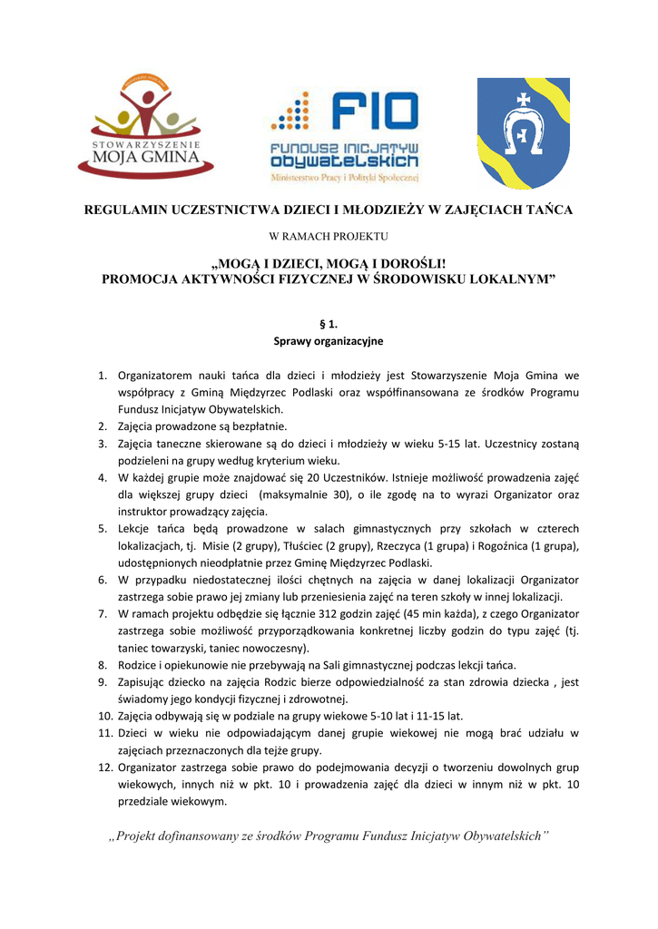 REGULAMIN UCZESTNICTWA DZIECI I MŁODZIEŻY W ZAJĘCIACH TAŃCA W RAMACH PROJEKTU „MOGĄ I DZIECI, MOGĄ I DOROŚLI! PROMOCJA AKTYWNOŚCI FIZYCZNEJ W ŚRODOWISKU LOKALNYM” § 1. Sprawy organizacyjne 1. Organizatorem nauki tańca dla dzieci i młodzieży jest Stowarzyszenie Moja Gmina we współpracy z Gminą Międzyrzec Podlaski oraz współfinansowana ze środków Programu Fundusz Inicjatyw Obywatelskich. 2. Zajęcia prowadzone są bezpłatnie. 3. Zajęcia taneczne skierowane są do dzieci i młodzieży w wieku 5-15 lat. Uczestnicy zostaną podzieleni na grupy według kryterium wieku. 4. W każdej grupie może znajdować się 20 Uczestników. Istnieje możliwość prowadzenia zajęć dla większej grupy dzieci (maksymalnie 30), o ile zgodę na to wyrazi Organizator oraz instruktor prowadzący zajęcia. 5. Lekcje tańca będą prowadzone w salach gimnastycznych przy szkołach w czterech lokalizacjach, tj. Misie (2 grupy), Tłuściec (2 grupy), Rzeczyca (1 grupa) i Rogoźnica (1 grupa), udostępnionych nieodpłatnie przez Gminę Międzyrzec Podlaski. 6. W przypadku niedostatecznej ilości chętnych na zajęcia w danej lokalizacji Organizator zastrzega sobie prawo jej zmiany lub przeniesienia zajęć na teren szkoły w innej lokalizacji. 7. W ramach projektu odbędzie się łącznie 312 godzin zajęć (45 min każda), z czego Organizator zastrzega sobie możliwość przyporządkowania konkretnej liczby godzin do typu zajęć (tj. taniec towarzyski, taniec nowoczesny). 8. Rodzice i opiekunowie nie przebywają na Sali gimnastycznej podczas lekcji tańca. 9. Zapisując dziecko na zajęcia Rodzic bierze odpowiedzialność za stan zdrowia dziecka , jest świadomy jego kondycji fizycznej i zdrowotnej. 10. Zajęcia odbywają się w podziale na grupy wiekowe 5-10 lat i 11-15 lat. 11. Dzieci w wieku nie odpowiadającym danej grupie wiekowej nie mogą brać udziału w zajęciach przeznaczonych dla tejże grupy. 12. Organizator zastrzega sobie prawo do podejmowania decyzji o tworzeniu dowolnych grup wiekowych, innych niż w pkt. 10 i prowadzenia zajęć dla dzieci w innym niż w pkt. 10 przedziale wiekowym. „Projekt dofinansowany ze środków Programu Fundusz Inicjatyw Obywatelskich” 13. Za przedmioty pozostawione w szatni/sali gimnastycznej Organizator oraz instruktorzy nie ponoszą odpowiedzialności. 14. Szczegółowy harmonogram zajęć na dany miesiąc będzie dostępny na stronie internetowej www.stowarzyszenie-mojagmina.com oraz w sekretariatach szkół w których będą odbywały się zajęcia. 15. Organizatorowi przysługuje prawo odwołania lekcji lub zmiany terminu prowadzenia ćwiczeń danej grupy po wcześniejszym powiadomieniu o tym przez ogłoszenie wywieszone w szkole. 16. Organizator oraz trenerzy nie odpowiadają za bezpieczeństwo dziecka w drodze z domu do szkoły i ze szkoły do domu. 17. Organizator udostępnia Uczestnikom i instruktorom na czas zajęć sprzęt grający i nagłaśniający oraz płyty z muzyką. 18. Uczestnictwo dzieci w zajęciach jest jednoznaczne z zaakceptowaniem niniejszego regulaminu przez Rodzica. § 2. Zobowiązania Uczestnika Uczestnik zajęć zobowiązany jest: 1. Nosić obuwie sportowe zmienne (inne od tego, w którym przyszedł do szkoły) w pomieszczeniach przeznaczonych do wykonywania ćwiczeń. 2. Przebywać na przynajmniej 80% zajęć. 3. Przestrzegania i zachowania czystości oraz poszanowania ogólnie przyjętych norm zachowania się. 4. Po każdych zajęciach odłożyć sprzęt w przeznaczone do tego miejsce. 5. Do stosowania się do poleceń instruktora ze względu na bezpieczeństwo wykonywanych ćwiczeń. 6. Do poszanowania mienia szkoły oraz Organizatora, jak również pomieszczeń szkoły. § 3. Zobowiązania Rodzica Rodzic dziecka uczestniczącego w zajęciach zobowiązany jest: 1. Wypełnić formularz zgłoszeniowy dostępny w szkole oraz na stronie www.stowarzyszeniemojagmina.com , uzupełniając wszelkie wymagane dane. 2. Informować instruktora przed zajęciami o każdej niedyspozycji dziecka, stanie jego zdrowia, jeśli może mieć wpływ na ograniczenia w wykonywaniu ćwiczeń. 3. Dopilnować, aby chore dziecko nie brało udziału w zajęciach. 4. Ponieść odpowiedzialność za ewentualne uszkodzenia, zniszczenia spowodowane przez dziecko. 5. Zapewnić dziecku odpowiedni strój sportowy oraz obuwie sportowe na zmianę. „Projekt dofinansowany ze środków Programu Fundusz Inicjatyw Obywatelskich” 6. Odebrać dziecko maksymalnie 15 minut po zakończeniu zajęć. W przypadku samodzielnego powrotu dziecka do domu po zajęciach podpisać upoważnienie do wypuszczenia dziecka do domu bez opieki osoby dorosłej – jednorazowe lub stałe. 7. Dopilnować, aby dziecko przestrzegało zasad niniejszego regulaminu. § 4. Sposób rekrutacji 1. W zajęciach w ramach projektu może wziąć udział 120 dzieci : 60 chłopców i 60 dziewczynek. Istnieje możliwość prowadzenia zajęć dla większej grupy dzieci, o ile zgodę na to wyrazi Organizator oraz instruktor prowadzący zajęcia. 2. Rodzic lub opiekun prawny wypełnia formularz zgłoszeniowy, dostępny w szkołach, na stronie internetowej www.stowarzyszenie-mojagmina.com lub w Biurze Projektu pod adresem Przychody 149, 21-560 Międzyrzec Podlaski i składa go w sekretariacie szkoły lub w siedzibie Biura Projektu. 3. O zakwalifikowaniu się do grupy decyduje kolejność zgłoszeń. W razie rezygnacji któregoś z Uczestników, na listę dostaje się następna w kolejności osoba z listy rezerwowej. 4. Rekrutacja na zajęcia rozpoczyna się wraz z ostatnim tygodniem maja 2015. 5. Ostateczna lista Uczestników będzie dostępna w sekretariatach szkół prowadzących zajęcia oraz w Biurze Projektu. „Projekt dofinansowany ze środków Programu Fundusz Inicjatyw Obywatelskich”