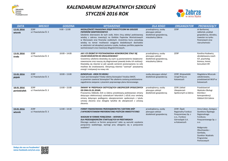 KALENDARIUM BEZPŁATNYCH SZKOLEŃ STYCZEŃ 2016 ROK DATA MIEJSCE 12.01.2016 wtorek ZCRP ul. Powstańców Śl. 3 9:00 – 12:00 GODZINA NIEZALEŻNOŚĆ FINANSOWA DZIĘKI INWESTYCJOM NA GIEŁDZIE PAPIERÓW WARTOŚCIOWYCH Szkolenie skierowane do tych osób, które chcą zdobyć podstawową wiedzę z zakresu inwestycji na Giełdzie Papierów Wartościowych w Warszawie oraz finansów osobistych. Uczestnicy kursu pozyskają wiedzę na temat możliwości osiągania dodatkowych dochodów w zależności od akceptacji poziomu ryzyka, budowy portfela papierów wartościowych oraz inwestycji długoterminowych. WYDARZENIE przedsiębiorcy, osoby planujące założyć działalność gospodarczą, mieszkańcy Zabrza ZCRP dr Bartłomiej Jabłoński, praktyk gospodarczy, doradca, inwestor na rynku finansowym oraz nieruchomości 13.01.2016 środa ZCRP ul. Powstańców Śl. 3 10:00 – 14:00 JAK I CO ZROBIĆ BY POSTANOWIENIA NOWOROCZNE STAŁY SIĘ CELEM MOŻLIWYM DO ZREALIZOWANIA? Uczestnicy szkolenia dowiedzą się czym są postanowienia świątecznonoworoczne oraz nauczą się diagnozować powody braku ich realizacji. Dowiedzą się również w jaki sposób zamienić postanawiania na cele możliwe do zrealizowania. Otrzymają również "zastrzyk" pozytywnej energii i motywacji na nowy rok. przedsiębiorcy, osoby planujące założyć działalność gospodarczą, mieszkańcy Zabrza ZCRP Karolina Hudowicz, akredytowany coach ICF, psycholog biznesu, trener, konsultant HR 15.01.2016 piątek ZCRP ul. Powstańców Śl. 3 10:00 – 13:00 BIZNESPLAN - KROK PO KROKU Czym jest biznesplan? Kiedy robimy biznesplan? Analiza SWOT, co powinien zawierać biznesplan? Na szkoleniu zostaną przedstawione zagadnienia związane z pisaniem poprawnego planu biznesowego. osoby planujące założyć działalność gospodarczą ZCRP; Wojewódzki Urząd Pracy w Katowicach Magdalena Miszczakszkoleniowiec, przedstawiciel WUP w Katowicach 18.01.2016 poniedziałek ZCRP ul. Powstańców Śl. 3 13:00 – 15:00 ZMIANY W PRZEPISACH DOTYCZĄCYCH UBEZPIECZEŃ SPOŁECZNYCH OD DNIA 01.01.2016R. Pracownicy Oddziału ZUS w Zabrzu przedstawią podstawowe zmiany dotyczące elektronizacji zaświadczeń lekarskich ( eZLA) oraz omówią zmiany dotyczące podlegania ubezpieczeniom społecznym z tytułu umowy zlecenia oraz zbiegów tytułów do ubezpieczeń z umową zlecenia. przedsiębiorcy, osoby planujące założyć działalność gospodarczą ZCRP, Zakład Ubezpieczeń Społecznych w Zabrzu Przedstawiciel Wydziału Obsługi klientów i korespondencji Oddział ZUS Zabrze 19.01.2016 wtorek ZCRP ul. Powstańców Śl. 3 12:00 – 14:30 FORMY FINANSOWANIA PRZEDSIĘBIORSTW Z SEKTORA MŚP Z WYKORZYSTANIEM PREFERENCYJNEJ POŻYCZKI INWESTYCYJNEJ przedsiębiorcy, osoby planujące założyć działalność gospodarczą ZCRP, Śląski Regionalny Fundusz Poręczeniowy Sp. z o.o., Fundusz Górnośląski S.A. w Katowicach Anna Caban, Zastępca Dyrektora Śląskiego Regionalnego Funduszu Poręczeniowego Sp. z o.o. WADIUM W FORMIE PORĘCZENIA – WSPARCIE DLA PRZEDSIĘBIORCÓW STARTUJĄCYCH W PRZETARGACH Dlaczego wadium w formie poręczenia? Jakie są warunki uzyskania poręczenia wadialnego, wymogi przy ubieganiu się o poręczenie wadialne? Dołącz do nas na Facebooku! www.facebook.com/um.zcrp DLA KOGO ORGANIZATOR PROWADZĄCY Małgorzata Obuchowska – Gembala, Dyrektor Wydziału Programów Pomocowych KALENDARIUM BEZPŁATNYCH SZKOLEŃ STYCZEŃ 2016 ROK 20.01.2016 środa ZCRP ul. Powstańców Śl. 3 9:00 – 12:00 NIEZALEŻNOŚĆ FINANSOWA DZIĘKI INWESTYCJOM W NIERUCHOMOŚCI NA WYNAJEM Szkolenie skierowane do tych osób, które chcą zdobyć podstawową wiedzę z zakresu inwestycji na rynku nieruchomości na wynajem (nieruchomości czynszowe jak mieszkania, sklepy, garaże, itp.) oraz finansów osobistych. Uczestnicy kursu pozyskają wiedzę na temat możliwości osiągania dodatkowych dochodów w zależności od liczby nieruchomości na wynajem. przedsiębiorcy, osoby planujące założyć działalność gospodarczą, mieszkańcy Zabrza ZCRP Dr Bartłomiej Jabłoński, praktyk gospodarczy, doradca, inwestor na rynku finansowym oraz nieruchomości 21.01.2016 czwartek Akademicki Inkubator Przedsiębiorczości Zabrze, ul. Wolności 274 17:00-19:00 przedsiębiorcy, osoby planujące założyć własną działalność, studenci ZCRP, AIP Zabrze Anna Wagner – praktyk, właścicielka firmy MDN MEDIA AG Wagner 22.01.2016 piątek ZCRP ul. Powstańców Śl. 3 10:00 – 13:00 CONTENT MARKETING - JAK TWORZYĆ ANGAŻUJĄCE TREŚCI Tworzenie angażujących treści jest podstawą do osiągania dobrych wyników za pomocą marketingu internetowego. Na warsztacie poznasz zasady tworzenia treści atrakcyjnych dla potencjalnych klientów. SAMOZATRUDNIENIE - KROK PO KROKU Uczestnicy szkolenia otrzymają wiedzę jak krok po kroku należy przygotować się do rozpoczęcia działalności gospodarczej. Jakie niezbędne dokumenty należy złożyć, jakie są możliwe formy opodatkowania działalności gospodarczej oraz wiele innych niezbędnych informacji. osoby planujące założyć działalność gospodarczą ZCRP; Wojewódzki Urząd Pracy w Katowicach Magdalena Miszczak – szkoleniowiec, przedstawiciel WUP w Katowicach 25.01.2016 wtorek ZCRP ul. Powstańców Śl. 3 9:00 – 14:00 KONSULTACJE NT. WSPARCIA ZE ŚRODKÓW UNII EUROPEJSKIEJ MOBILNY PUNKT INFORMACYJNY W ZABRZU Mobilne Punkty Informacyjne to nowa usługa dostępna dla mieszkańców regionu oferowana przez pracowników Punktu Informacyjnego Funduszy Europejskich w Katowicach. Konsultanci będą udzielać bezpłatnych konsultacji w zakresie możliwości uzyskania wsparcia ze środków Unii Europejskiej w nowej perspektywie finansowej 2014 – 2020. przedsiębiorcy, osoby planujące założyć działalność gospodarczą ZCRP, PIFE Przedstawiciele Mobilnego Punktu Informacyjnego Funduszy Europejskich przy Urzędzie Marszałkowskim Województwa Śląskiego 28.12.2016 czwartek ZCRP ul. Powstańców Śl. 3 13:00 – 15:00 SPOTK