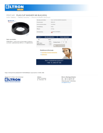 PENT AIRPLAS.CUPWASHERM6BLK(100X) Sz afyi Obudowy > Obudowynaści enne > Akcesor i adoobudównaści ennych N a z wa p ro d u ktu : PLAS .CUPWAS HERM6 BLK(100X) P ro d u c en t: PENT AI R K o d p ro d u c en ta : 21100016 C ertyfi ka ty: RoHS Wa g a : 0.02kg Ka rta ka ta logowa D o ku m en ty: O pis pro duktu: Podkł adkaz twor z ywasz tucz negowkol or z e cz ar nym ,pakowanapo100sz t.w1opakowani u Ilo ś ć [brutto ] /[netto ] Cena [wa luta ] 1+ netto [ Vat: Ilośćmin.: Wielokrotność: 23% 1sz t. 1sz t. Pod ajIlość: 0 ] + - dokosz yka Maszdodatkowepytania? +48713439755 https://skl ep.el tr on.pl /pl /p/18 47 48 452620/pl as-cup-washer -m 6-bl k-100x Wł aści ci el skl epui nter netowego: Adres : 50-07 1Wr ocł aw pl .Wol ności 7 B Biuro O bs ługiKlienta : tel .:+48 7 134397 55 fax+48 7 13441141 Infol i ni apn-pt.8 .00-16.00 skl ep@ el tr on.pl