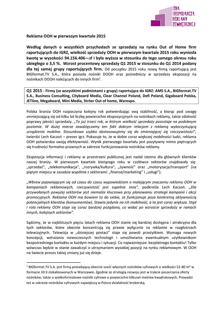 Reklama OOH w pierwszym kwartale 2015 Według danych o wszystkich przychodach ze sprzedaży na rynku Out of Home firm raportujących do IGRZ, wielkość sprzedaży OOH w pierwszym kwartale 2015 roku wyniosła kwotę w wysokości 94.156.406—zł i była wyższa w stosunku do tego samego okresu roku ubiegłego o 3,5 %. Wzrost procentowy sprzedaży Q1 2015 w stosunku do Q1 2014 podany dla tej samej grupy raportujących firm. Od początku 2015 roku nową firmą raportującą jest BIGformat.TV S.A., która posiada nośniki DOOH oraz pośredniczy w sprzedaży ekspozycji na nośnikach DOOH należących do innych firm1. Q1 2015 - Firmy (ze wszystkimi podmiotami z grupy) raportujące do IGRZ: AMS S.A., BIGformat.TV S.A., Business Consulting, Cityboard Media, Clear Channel Poland, Defi Poland, Gigaboard Polska, JETline, Megaboard, Mini Media, Ströer Out of home, Warexpo. Polska branża OOH rozpoczyna kolejny rok potwierdzając swą stabilność, a biorąc pod uwagę zmniejszającą się od kilku lat liczbę powierzchni ekspozycyjnych na nośnikach reklamy, także zdolność poprawy jakości sprzedaży. „To już trzeci rok, w którym wielkość sprzedaży pozostaje na podobnym poziomie. W dużej mierze zawdzięczamy ten fakt dobrym relacjom z reklamą wykorzystującą urządzenia mobilne. Stosunkowo szybko dostosowujemy się do zmieniającej się rzeczywistości”, twierdzi Lech Kaczoń – prezes igrz. Pokazuje to, że w dobie coraz większej mobilności ludzi, reklama OOH potwierdza swoją efektywność. Wynik pierwszego kwartału jest pozytywny mimo piętrzących się trudności formalno-prawnych w zakresie funkcjonowania nośników reklamy. Ekspozycja informacji i reklamy w przestrzeni publicznej jest nadal istotna dla głównych klientów naszej branży. W pierwszym kwartale bieżącego roku w czołówce sektorów znajdowały się: „sprzedaż”, „telekomunikacja”, „rozrywka/kultura”, „żywność” oraz „motoryzacja/transport” (na piątym miejscu w zasadzie wspólnie z sektorami: „finanse/marketing” i „usługi”). „Wbrew pojawiającym się od czasu do czasu wypowiedziom o malejącym znaczeniu reklamy OOH w kampaniach reklamowych, rzeczywistość jest zupełnie inna”, podkreśla Lech Kaczoń. „Dla przywołanych powyżej sektorów jest niemalże kluczowa przy planowaniu strategii kampanii i akcji promocyjnych. Reklama OOH ma bowiem to do siebie, że funkcjonuje poza konkretną aktywnością potencjalnych klientów (konsumentów). Stawia jedynie na ich mobilność, a ta jest coraz większa. Stąd i rola reklamy OOH staje się coraz bardziej pożądana, co widać po wzroście sprzedaży w ramach innych, kolejnych sektorów”. Sądzimy, że w najbliższych pięciu latach reklama OOH stanie się bardziej dostępna i atrakcyjna dla tych sektorów, które obecnie koncentrują się prawie wyłącznie na reklamie w rozgłośniach telewizyjnych. Telewizja w „dzisiejszej postaci” staje się powoli przeżytkiem. Wymaga nowych koncepcji, wdrażania nowoczesnych technologii i umożliwiania ewentualnym użytkownikom bezpośredniego kontaktu w każdym miejscu i sytuacji. Co najważniejsze: bezpłatnego kontaktu! Tylko wówczas będzie w stanie zawalczyć o utrzymaniem wysokiej pozycji na rynku reklamowym. W OOH na świecie proces takiej zmiany już się dzieje. 1 BIGformat.TV S.A. jest firmą posiadającą obecnie sześć własnych nośników cyfrowych o wielkości 52-80 m² w formacie 10:3 zlokalizowanych w Warszawie. Zgodnie ze strategią rozwoju jest w trakcie poszerzania oferty nośników, także o wielkoformatowe nośniki cyfrowe o powierzchni kilkuset metrów kwadratowych. Prowadzi też w zakresie nośników cyfrowych największą w Polsce działalność brokerską. Reklama tranzytowa. W uzgodnieniu z firmami zajmującymi się tą formą reklamy, zmieniamy od bieżącego roku zasadę klasyfikacji sprzedaży w jej zakresie. Prezentujemy dane sprzedaży uzyskiwane w dotychczasowym klasycznym zakresie – reklama na środkach komunikacji miejskiej oraz dane uzyskiwane ze sprzedaży na nośnikach znajdujących się wewnątrz pojazdów komunikacji miejskiej (tak w formie stałej ekspozycji, jak i ekspozycji w postaci cyfrowej). W roku 2015 raport o wielkości sprzedaży w zakresie reklamy tranzytowej dotyczy trzech firm: AMS S.A., Business Consulting oraz Clear Channel Poland. Ta ostatnia zajmuje się tą forma reklamy od początku tego roku. Wielkość sprzedaży w zakresie reklamy tranzytowej wyniosła w pierwszym kwartale 2015 roku kwotę w wysokości 3.580.025.—zł i stanowiła w tym okresie 3,8 % ogółu sprzedaży OOH. Reklama tranzytowa pozostaje rozwojowa. Zakres tego rozwoju zależy od decyzji przewoźników komunikacji miejskiej, w większości od samorządów. Uważamy, że powoli zbliża się czas kolejnych zmian, idących w kierunku zastosowania nowoczesnych technologii. Mobilność tej formy reklamy stwarza jej nowe perspektywy. Lech Kaczoń – Prezes IGRZ: Jestem rozczarowany brakiem przemyślanej aktywności komitetów wyborczych kandydatów na Prezydenta RP. Tak dalece nieprofesjonalnych kampanii nie widziałem od początku wolnej Polski. Żałuję, albowiem zakres wykorzystania reklamy OOH jest na miesiąc przed terminem pierwszej tury wyborów niewielki. Spodziewam się, że inna sytuacja będzie przed jesiennymi wyborami parlamentarnymi. Większe zaangażowanie w promocję kandydatów na posłów i senatorów sprzyjać będzie lepszemu wykorzystaniu potencjału OOH. Z tej perspektywy, ale nie tylko, patrzę optymistycznie na wynik branży na koniec tego roku. W niniejszym podsumowaniu nie odnoszę się do procedowanej jeszcze w parlamencie „ustawy krajobrazowej” i jej ewentualnego wpływu na rynek reklamy OOH w Polsce. Swoje przemyślenia i komentarz prezentuję w osobnym stanowisku. Do niniejszego raportu dołączone są szczegółowe zestawienia sprzedaży w zakresie ogólnym, jak i dla reklamy tranzytowej. IGRZ/Raport o sprzedaży OOH 1Q 20