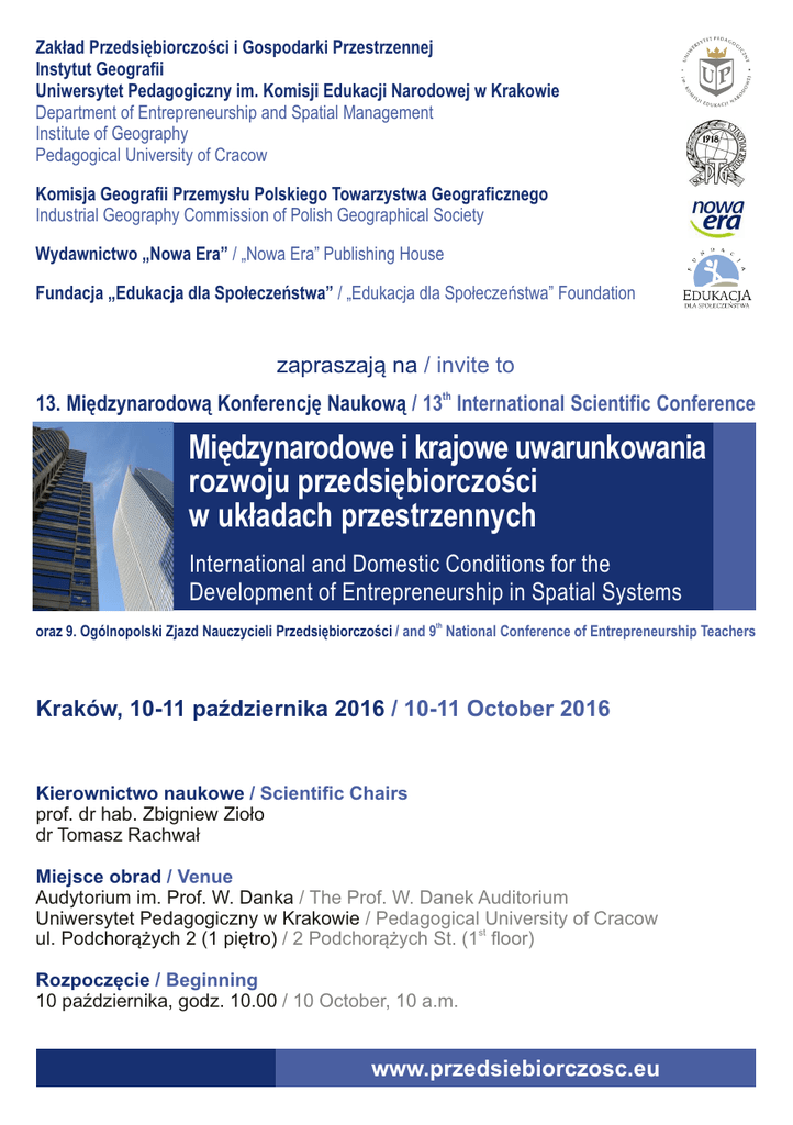 Zakład Przedsiębiorczości i Gospodarki Przestrzennej Instytut Geografii Uniwersytet Pedagogiczny im. Komisji Edukacji Narodowej w Krakowie Department of Entrepreneurship and Spatial Management Institute of Geography Pedagogical University of Cracow Komisja Geografii Przemysłu Polskiego Towarzystwa Geograficznego Industrial Geography Commission of Polish Geographical Society Wydawnictwo „Nowa Era” / „Nowa Era” Publishing House Fundacja „Edukacja dla Społeczeństwa” / „Edukacja dla Społeczeństwa” Foundation zapraszają na / invite to th 13. Międzynarodową Konferencję Naukową / 13 International Scientific Conference Międzynarodowe i krajowe uwarunkowania rozwoju przedsiębiorczości w układach przestrzennych International and Domestic Conditions for the Development of Entrepreneurship in Spatial Systems oraz 9. Ogólnopolski Zjazd Nauczycieli Przedsiębiorczości / and 9th National Conference of Entrepreneurship Teachers Kraków, 10-11 października 2016 / 10-11 October 2016 Kierownictwo naukowe / Scientific Chairs prof. dr hab. Zbigniew Zioło dr Tomasz Rachwał Miejsce obrad / Venue Audytorium im. Prof. W. Danka / The Prof. W. Danek Auditorium Uniwersytet Pedagogiczny w Krakowie / Pedagogical University of Cracow ul. Podchorążych 2 (1 piętro) / 2 Podchorążych St. (1st floor) Rozpoczęcie / Beginning 10 października, godz. 10.00 / 10 October, 10 a.m. www.przedsiebiorczosc.eu Cele: Celem 13. Konferencji będzie prezentacja koncepcji teoretycznych oraz wyników prac badawczych związanych z problematyką przedsiębiorczości, w szczególności dotyczących rozwoju działalności gospodarczej w różnej skali układów przestrzennych (lokalnej, regionalnej, krajowej, europejskiej i światowej), gospodarki finansowej przedsiębiorstw, jednostek samorządu terytorialnego i państwa, rynku kapitałowego, systemu bankowego, podatkowego i ubezpieczeń, etyki życia społecznogospodarczego, funkcjonowania rynku pracy oraz postaw przedsiębiorczych człowieka i jego umiejętności interpersonalnych. Szczególna uwaga zostanie zwrócona na przestrzenne aspekty rozwoju przedsiębiorczości oraz problematykę edukacji dla przedsiębiorczości, głównie w krajach Europy Środkowo-Wschodniej i innych rynkach wschodzących. Obrady konferencji będą zmierzać przede wszystkim w kierunku określenia jakie czynniki o charakterze międzynarodowym i krajowym kształtują rozwój przedsiębiorczości w układach przestrzennych. 9. Zjazd Nauczycieli Przedsiębiorczości poświęcony będzie wymianie wiedzy i doświadczeń na temat metodyki nauczania przedsiębiorczości i innych przedmiotów ekonomicznych na wszystkich poziomach edukacji, konfrontacji poglądów pracowników szkół wyższych, doradców metodycznych i nauczycieli na temat celów, treści, metod i efektów kształcenia w zakresie przedsiębiorczości. Zmierzać się będzie do odpowiedzi na pytanie w jakim zakresie zasoby wiedzy naukowej z przedsiębiorczości powinny być wdrażane na wszystkich etapach edukacji, od szkoły podstawowej do kształcenia na poziomie akademickim, ze szczególnym uwzględnieniem zagadnień przedsiębiorczości poruszanych w kształceniu geograficznym i ekonomicznym. Jesteśmy otwarci na prezentację doświadczeń dydaktycznych środowiska nauczycielskiego, a także wyników realizacji projektów edukacyjnych z zakresu przedsiębiorczości. W drugiej części Zjazdu planuje się prezentacje i warsztaty metodyczne z zakresu wykorzystania nowych metod i pomocy dydaktycznych, w tym gier edukacyjnych, wykorzystywanych w kształceniu postaw przedsiębiorczych. Zachęcamy do udziału w Konferencji i Zjeździe w szczególności: n pracowników naukowych, naukowo-dydaktycznych i doktorantów zajmujących się szeroko rozumianą problematyką przedsiębiorczości oraz edukacji z kraju i zagranicy; n studentów kierunków geograficznych, ekonomicznych, pedagogicznych i innych zainteresowanych problematyką Konferencji; n osoby odpowiedzialne za realizację programów specjalności z zakresu przedsiębiorczości na różnego typu kierunkach studiów; n doradców metodycznych oraz nauczycieli przedsiębiorczości i innych przedmiotów z ośrodków doradztwa nauczycieli i różnego typu szkół; n autorów programów, podręczników i innych pomocy dydaktycznych do nauczania przedsiębiorczości i przedmiotów ekonomicznych; n przedstawicieli władz państwowych, samorządowych i organizacji pozarządowych odpowiedzialnych za edukację i rozwijanie przedsiębiorczości; n pracowników instytucji otoczenia biznesu, w szczególności świadczących usługi doradcze w zakresie wykorzystania funduszy unijnych dla rozwoju przedsiębiorczości; n przedsiębiorców i innych praktyków życia gospodarczego; n wszystkie inne osoby zainteresowane problematyką konferencji. Języki konferencji: polski i angielski (tłumaczenie symultaniczne z j. angielskiego na j. polski i z j. polskiego na j. angielski będzie dostępne w pierwszym dniu konferencji). Zgłoszenia: prosimy o wypełnienie e-formularza uczestnictwa na stronie internetowej konferencji (www.przedsiebiorczosc.eu) lub przesłanie kart zgłoszenia pocztą elektroniczną na adres: [email protected], lub też faksem +48 12 662 62 43 najpóźniej do dnia 15 września 2016 r. Referentów prosimy o dołączenie streszczenia referatu (maks. 0,5-1 strony formatu A4 w języku wygłaszania referatu). Artykuły powstałe na bazie referatów, po otrzymaniu pozytywnych recenzji, będą opublikowane w czasopiśmie „Przedsiębiorczość - Edukacja”, www.p-e.up.krakow.pl (8 pkt. wg listy MNiSW). Dodatkowe informacje: dr Łukasz Quirini-Popławski, mgr Marcin Semczuk (Sekretarze Konferencji), tel. +48 12 662 62 48. 13. Międzynarodowa Konferencja Naukowa 13th International Scientific Conference Aims: The aim of the 13th Conference is the presentation of theoretical concepts and research results associated with the issues of entrepreneurship, in particular th