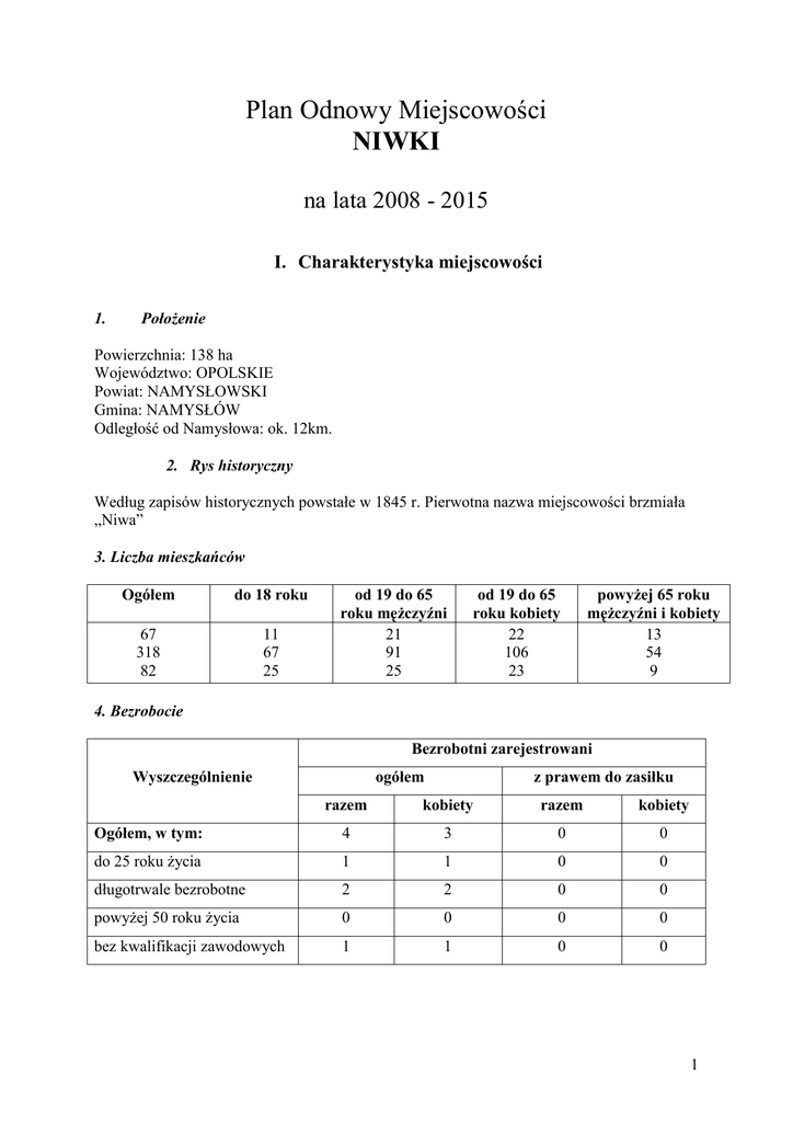 Plan Odnowy Miejscowości NIWKI na lata 2008 - 2015 I. Charakterystyka miejscowości 1. PołoŜenie Powierzchnia: 138 ha Województwo: OPOLSKIE Powiat: NAMYSŁOWSKI Gmina: NAMYSŁÓW Odległość od Namysłowa: ok. 12km. 2. Rys historyczny Według zapisów historycznych powstałe w 1845 r. Pierwotna nazwa miejscowości brzmiała „Niwa” 3. Liczba mieszkańców Ogółem do 18 roku 67 318 82 11 67 25 od 19 do 65 roku męŜczyźni 21 91 25 od 19 do 65 roku kobiety 22 106 23 powyŜej 65 roku męŜczyźni i kobiety 13 54 9 4. Bezrobocie Bezrobotni zarejestrowani Wyszczególnienie ogółem z prawem do zasiłku razem kobiety razem kobiety Ogółem, w tym: 4 3 0 0 do 25 roku Ŝycia 1 1 0 0 długotrwale bezrobotne 2 2 0 0 powyŜej 50 roku Ŝycia 0 0 0 0 bez kwalifikacji zawodowych 1 1 0 0 1 II. Inwentaryzacja zasobów 5. Infrastruktura społeczna Oświata Na terenie sołectwa nie ma przedszkola ani szkoły. Dzieci i młodzieŜ z terenu sołectwa uczęszczają do szkoły w Ligocie KsiąŜęcej. SłuŜba zdrowia Na terenie sołectwa nie funkcjonuje Ŝadna przychodnia medyczna. NajbliŜsza znajduje się w miejscowości Ligota KsiąŜęca.. Mieszkańcy korzystają z usług medycznych szpitala w Namysłowie. Bezpieczeństwo publiczne Na terenie sołectwa brak posterunku policji i OSP. W razie potrzeby pomocy udziela OSP Ligota Ks., OSP Przeczów i OSP Mikowice. Zadania z zakresu działania policji wykonuje Komenda Powiatowa Policji w Namysłowie. Infrastruktura techniczna Zaopatrzenie w wodę Wieś jest zwodociągowana. Kanalizacja Na terenie miejscowości brak jest zbiorowego systemu kanalizacji. W 2004r. została opracowana programowa koncepcja uporządkowania gospodarki wodno-ściekowej w gminach: Domaszowice, Namysłów, Świerczów i Pokój. Sieć gazowa Brak sieci gazowej. Wieś jest zaopatrywana w gaz butlowy. Sieć energetyczna Miejscowość jest w pełni zelektryfikowana. Wszystkie gospodarstwa domowe posiadają dostęp do energii elektrycznej. Komunikacja Przez teren sołectwa przebiega droga powiatowa Namysłów-Przeczów 1101 O. Połączenie autobusowe wsi to przede wszystkim linia Namysłów – Niwki – Brzeg (ok. 3 kursów dziennie) oraz Namysłów – Niwki – Brzozowiec (ok. 4 kursów dziennie), obsługiwana przez PKS Namysłów. Brak jest linii kolejowej i wodnych cieków komunikacyjnych. W 2000r. wybudowano sieć łączności telefonicznej. 2 Gospodarka Wielkość gospodarstw indywidualnych 1-2 ha powyŜej 2-5 ha powyŜej 5-7 ha powyŜej 7-10 ha powyŜej 10-15 ha powyŜej 15 ha 7 21 6 6 17 6 5 3 2 2 6 6 11 - 10 7 Zabytki: Brak zabytków wpisanych do rejestru zabytków. Pomniki przyrody: Brak pomników przyrody wpisanych do rejestru Wojewódzkiego Konserwatora Przyrody. Instytucje: Na terenie miejscowości nie funkcjonują instytucje o charakterze ponadlokalnym. III. Ocena mocnych i słabych stron miejscowości MOCNE STRONY 1. Atrakcyjne połoŜenie na trasie Namysłów Przeczów. Bliskość Namysłowa (12 km). 2. Zwodociągowanie miejscowości 3. Aktywna społeczność lokalna SZANSE 1. Dostępność środków z funduszy zewnętrznych przeznaczonych na rozwój obszarów wiejskich (funduszy UE i krajowych) 2. Dokształcanie społeczeństwa poprze kursy i szkolenia 3. Rozwój lokalnej przedsiębiorczości SŁABE STRONY 1. Wielkość – mała powierzchnia i liczba mieszkańców. 2. Niewystarczająca infrastruktura okołodrogowa (brak chodników, kanalizacji, ścieŜek rowerowych) 3. Słaba infrastruktura społeczna (brak przedszkola, szkoły, świetlicy wiejskiej) 4. Brak bazy sportowej i turystycznej 5. Brak miejsc publicznych spotkań (placów zabaw) ZAGROśENIA 1. Migracje młodzieŜy do większych miast i zagranicę. 2. Brak własnych środków finansowych 3. Skomplikowane procedury w ubieganiu się o środki zewnętrzne 3 6. Opis planowanych zadań inwestycyjnych Priorytet 1: Modernizacja istniejącego systemu komunikacji drogowej Działania: 1) Budowa chodników wzdłuŜ całej miejscowości Priorytet 2: Rozwój infrastruktury sportowej i kulturalnej Działania: 1) Budowa świetlicy wiejskiej jako miejsca spotkań mieszkańców wsi. 2) Budowa placu zabaw w centrum wsi. 3) Wyznaczenie boisk do piłki siatkowej, noŜnej i koszykówki 4) Budowa ścieŜki rowerowej w kierunku Namysłowa. 5) Budowa infrastruktury do ćwiczeń siłowych na świeŜym powietrzu. Priorytet 3: Modernizacja obiektów religijnych Działania: 1) Budowa domu pogrzebowego na cmentarzu. Priorytet 4: Rozwój toŜsamości mieszkańców Niwek i integracja mieszkańców Działania: 1) Budowa skwerku integracyjnego z grillem. 2) Wymiana tabliczek z numerami domów dla wszystkich mieszkańców wioski. 7. Szacunkowy kosztorys planowanych przedsięwzięć. Priorytety Nazwa zadania Koszt (w zł) Priorytet 1 Modernizacja istniejącego systemu komunikacji 30 000,00 Priorytet 2 Priorytet 3 Priorytet 4 drogowej 1.1 Rozwój infrastruktury sportowej i kulturalnej 2.1 2.2 2.3 2.4 2.5 Modernizacja obiektów religijnych 3.1 Rozwój toŜsamości mieszkańców Niwek i integracja mieszkańców 30 000,00 620 000,00 500 000,00 20 000,00 50 000,00 20 000,00 30 000,00 120 000,00 120 000,00 70 000,00 4 4.1 4.2 30 000,00 40 000,00 Koszt wszystkich planowanych przedsięwzięć: 840 000,00 zł. 5