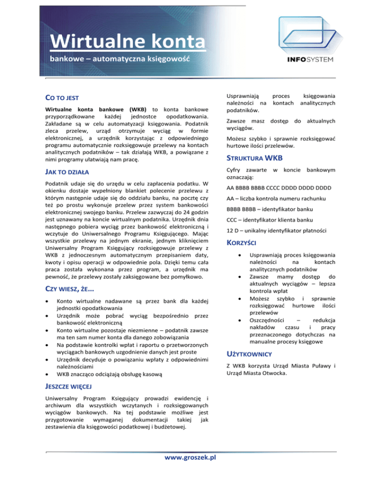 Wirtualne konta bankowe – automatyczna księgowość CO TO JEST Wirtualne konta bankowe (WKB) to konta bankowe przyporządkowane każdej jednostce opodatkowania. Zakładane są w celu automatyzacji księgowania. Podatnik zleca przelew, urząd otrzymuje wyciąg w formie elektronicznej, a urzędnik korzystając z odpowiedniego programu automatycznie rozksięgowuje przelewy na kontach analitycznych podatników – tak działają WKB, a powiązane z nimi programy ułatwiają nam pracę. Usprawniają proces należności na kontach podatników. Zawsze masz dostęp do aktualnych wyciągów. Możesz szybko i sprawnie rozksięgowad hurtowe ilości przelewów. STRUKTURA WKB Cyfry zawarte w koncie bankowym oznaczają: JAK TO DZIAŁA Podatnik udaje się do urzędu w celu zapłacenia podatku. W okienku dostaje wypełniony blankiet polecenie przelewu z którym następnie udaje się do oddziału banku, na pocztę czy też po prostu wykonuje przelew przez system bankowości elektronicznej swojego banku. Przelew zazwyczaj do 24 godzin jest uznawany na koncie wirtualnym podatnika. Urzędnik dnia następnego pobiera wyciąg przez bankowośd elektroniczną i wczytuje do Uniwersalnego Programu Księgującego. Mając wszystkie przelewy na jednym ekranie, jednym kliknięciem Uniwersalny Program Księgujący rozksięgowuje przelewy z WKB z jednoczesnym automatycznym przepisaniem daty, kwoty i opisu operacji w odpowiednie pola. Dzięki temu cała praca została wykonana przez program, a urzędnik ma pewnośd, że przelewy zostały zaksięgowane bez pomyłkowo. AA BBBB BBBB CCCC DDDD DDDD DDDD AA – liczba kontrola numeru rachunku BBBB BBBB – identyfikator banku CCC – identyfikator klienta banku 12 D – unikalny identyfikator płatności KORZYŚCI CZY WIESZ, ŻE… księgowania analitycznych Konto wirtualne nadawane są przez bank dla każdej jednostki opodatkowania Urzędnik może pobrad wyciąg bezpośrednio przez bankowośd elektroniczną Konto wirtualne pozostaje niezmienne – podatnik zawsze ma ten sam numer konta dla danego zobowiązania Na podstawie kontrolki wpłat i raportu o przetworzonych wyciągach bankowych uzgodnienie danych jest proste Urzędnik decyduje o powiązaniu wpłaty z odpowiednimi należnościami WKB znacząco odciążają obsługę kasową JESZCZE WIĘCEJ Uniwersalny Program Księgujący prowadzi ewidencję i archiwum dla wszystkich wczytanych i rozksięgowanych wyciągów bankowych. Na tej podstawie możliwe jest przygotowanie wymaganej dokumentacji takiej jak zestawienia dla księgowości podatkowej i budżetowej. www.groszek.pl Usprawniają proces księgowania należności na kontach analitycznych podatników Zawsze mamy dostęp do aktualnych wyciągów – lepsza kontrola wpłat Możesz szybko i sprawnie rozksięgowad hurtowe ilości przelewów Oszczędności – redukcja nakładów czasu i pracy przeznaczonego dotychczas na manualne procesy księgowe UŻYTKOWNICY Z WKB korzysta Urząd Miasta Puławy i Urząd Miasta Otwocka.