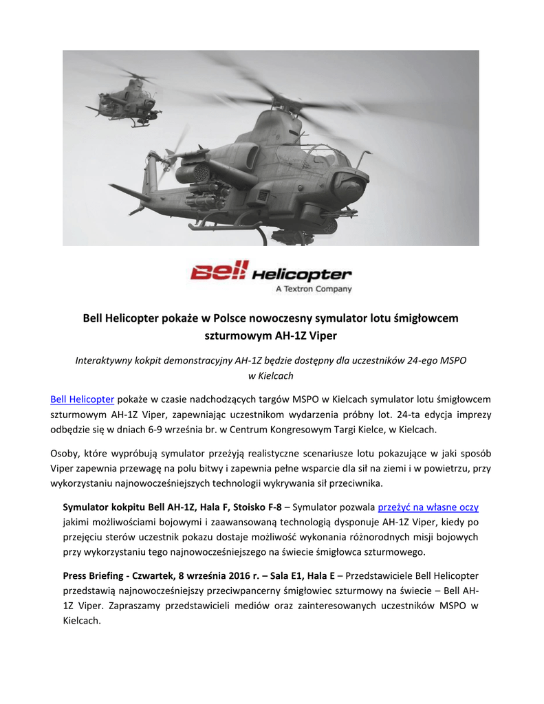 Bell Helicopter pokaże w Polsce nowoczesny symulator lotu śmigłowcem szturmowym AH-1Z Viper Interaktywny kokpit demonstracyjny AH-1Z będzie dostępny dla uczestników 24-ego MSPO w Kielcach Bell Helicopter pokaże w czasie nadchodzących targów MSPO w Kielcach symulator lotu śmigłowcem szturmowym AH-1Z Viper, zapewniając uczestnikom wydarzenia próbny lot. 24-ta edycja imprezy odbędzie się w dniach 6-9 września br. w Centrum Kongresowym Targi Kielce, w Kielcach. Osoby, które wypróbują symulator przeżyją realistyczne scenariusze lotu pokazujące w jaki sposób Viper zapewnia przewagę na polu bitwy i zapewnia pełne wsparcie dla sił na ziemi i w powietrzu, przy wykorzystaniu najnowocześniejszych technologii wykrywania sił przeciwnika. Symulator kokpitu Bell AH-1Z, Hala F, Stoisko F-8 – Symulator pozwala przeżyć na własne oczy jakimi możliwościami bojowymi i zaawansowaną technologią dysponuje AH-1Z Viper, kiedy po przejęciu sterów uczestnik pokazu dostaje możliwość wykonania różnorodnych misji bojowych przy wykorzystaniu tego najnowocześniejszego na świecie śmigłowca szturmowego. Press Briefing - Czwartek, 8 września 2016 r. – Sala E1, Hala E – Przedstawiciele Bell Helicopter przedstawią najnowocześniejszy przeciwpancerny śmigłowiec szturmowy na świecie – Bell AH1Z Viper. Zapraszamy przedstawicieli mediów oraz zainteresowanych uczestników MSPO w Kielcach. AH-1Z Viper to śmigłowiec zaprojektowany we współpracy z Korpusem Piechoty Morskiej USA, który przenosi wyjątkowo szeroka gamę uzbrojenia i wykorzystuje wykrywacze oparte na najbardziej zaawansowanej technologii. Viper charakteryzuje się promieniem operacyjnym ponad 240 km, przy obciązeniu uzbrojeniem w postaci 16 rakiet Hellfire klasy powietrze-ziemia, dwóch rakiet Sidewinder klasy powietrze-powietrze oraz 650 beztaśmowych pocisków do 20 mm działka M197 – dając możliwości przewyższające wszystkie inne platformy tego typu przy zachowaniu najniższych kosztów serwisowania i utrzymania. Kontakt dla mediów i zainteresowanych uczestników: Andrew Woodward Communications Manager, Bell Helicopter Military Programs [email protected] +1 817.280.1297 Aleksander Rajch Cross Media PR Sp z o.o. ul. Wiejska 2 m 6 00-489 Warszawa [email protected] Tel: +48 22 629 77 19