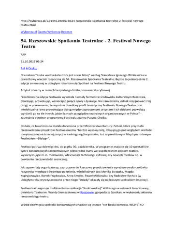 http://wyborcza.pl/1,91446,19056738,54-rzeszowskie-spotkania-teatralne-2-festiwal-nowegoteatru.html Wyborcza.pl Gazeta Wyborcza Depesze 54. Rzeszowskie Spotkania Teatralne - 2. Festiwal Nowego Teatru PAP 21.10.2015 09:24 A A A Drukuj Dramatem "Kurka wodna-katastrofa jest coraz bliżej" według Stanisława Ignacego Witkiewicza w czwartkowy wieczór rozpoczną się 54. Rzeszowskie Spotkania Teatralne. Będzie to jednocześnie 2. edycja zmienionej w ubiegłym roku formuły Spotkań na Festiwal Nowego Teatru. Artykuł otwarty w ramach bezpłatnego limitu prenumeraty cyfrowej "Zeszłoroczna edycja Festiwalu wywołała niemały ferment w środowisku kulturalnym Rzeszowa, oburzając, prowokując, wzniecając gorące spory i dyskusje. Nie zamierzamy jednak rezygnować z tej drogi, w przekonaniu, że wyraźnie określony profil tematyczny Festiwalu Nowego Teatru oraz intelektualna rama prowokująca dialog między zaproszonymi artystami i ich dziełami pozwalają wyróżnić go na tle innych, jakże licznych przeglądów teatralnych organizowanych w Polsce" zauważyła dyrektor programowy Festiwalu Joanna Puzyna-Chojka. Dodała, że taka formuła została doceniona przez Ministerstwo Kultury i Sztuki, które przyznało rzeszowskiemu projektowi festiwalowemu "bardzo wysoką notę, lokującą go pod względem wartości merytorycznej na trzeciej pozycji w rankingu ogólnopolskim, tuż za prestiżowym Międzynarodowym Festiwalem +Dialog+". Festiwal potrwa dziewięć dni, do piątku 30. października. W programie znajdzie się 10 spektakli (w tym 9 konkursowych) prezentujących różnorodne nurty we współczesnym polskim teatrze, wykorzystujące m.in. możliwości, właściwości technologii cyfrowej czy nowych mediów np. w tworzeniu rzeczywistości scenicznej. Jak zapewniają organizatorzy, zaproszone do Rzeszowa przedstawienia wyreżyserowała czołówka reżyserów młodego i średniego pokolenia, wśród których jest Monika Strzępka, Magda Kupryjanowicz, Bartek Frąckowiak, Anna Smolar, Paweł Miśkiewicz, czy Radosław Rychcik (w ubiegłym roku wyreżyserowane przez niego "Dziady" okazały się najlepszym spektaklem imprezy). Festiwal zainauguruje multimedialna realizacja "Kurki wodnej" Witkacego w reżyserii Jana Nowary, dyrektora Teatru im. Wandy Siemaszkowej w Rzeszowie, gospodarza Spotkań, w wykonaniu aktorów rzeszowskiego teatru. Wśród dziewięciu spektakli konkursowych znajdzie się jeszcze "nie-boska komedia. WSZYSTKO POWIEM BOGU!" w wykonaniu Narodowego Starego Teatru w Krakowie; "Podróż zimowa" Teatru Polskiego z Wrocławia; "Portret damy", który wystawi Teatr Wybrzeże z Gdańska; "Aktorzy żydowscy", na których zaprosi Teatr Żydowski z Warszawy; spektakl "Afryka" Teatru Polskiego z Bydgoszczy. Teatr im. W. Bogusławskiego z Kalisza pokaże "Klęski w dziejach miasta"; Teatr im. C.K. Norwida z Jeleniej Góry zaprezentuje przedstawienie "Karskiego historia nieprawdziwa", natomiast artyści Teatru im. Ludwika Solskiego w Tarnowie - sztukę "Grażyna" Adama Mickiewicza w reżyserii Radosława Rychcika. Ci ostatni nie wystąpią jednak - jak pozostałe teatry - na rzeszowskiej scenie, ale u siebie. Będzie to jedna z niespodzianek tegorocznej edycji imprezy; festiwalowa publiczność autokarami pojedzie do Tarnowa na spektakl. Kolejną niespodzianką dla publiczności będzie przedstawienie finałowe, w którym - poza konkursem wystąpią studenci IV roku Wydziału Aktorskiego krakowskiej PWST filia we Wrocławiu. Pokażą oni swój spektakl dyplomowy "Lew na ulicy" Judith Thompson. "Chcielibyśmy, aby obecność najmłodszego pokolenia artystów, dopiero rozpoczynających swoją przygodę z zawodowym teatrem, była stałym elementem programu naszego Festiwalu, dedykowanego +nowemu teatrowi+. Nowemu, czyli młodemu, zbuntowanemu, wrażliwemu na otaczający świat" - podkreśliła Puzyna-Chojka. Festiwal Nowego Teatru jest konkursem. Jury złożone ze studentów uczelni artystycznych i kierunków uniwersyteckich dotyczących teatru oraz młodych pisarzy i krytyków po obejrzeniu 9 konkursowych przedstawień przyzna nagrodę główną za osobowość artystyczną, a także dla młodego twórcy i dla najlepszego spektaklu. Tegoroczna edycja Festiwalu Nowego Teatru zostanie zadedykowana zmarłemu w 2010 roku niemieckiemu reżyserowi Christophowi Schlingensiefowi. Był on według Puzyny-Chojki "prawdziwym artystą totalnym, negującym granice między różnymi obszarami i gatunkami sztuki". Schlingensief występował m.in. przeciwko rasizmowi i nietolerancji. Pokazom konkursowym towarzyszyć będą różne działania artystyczne, tworzone na styku teatru, performansu i sztuk wizualnych, a także - po pięciu latach przerwy - Multimedia Szajna Festiwal. W foyer rzeszowskiego teatru prezentowane będą wybrane prace, w tym zwycięskie plakaty 15. Międzynarodowego Biennale Plakatu Teatralnego. W programie wydarzeń towarzyszących festiwalowi znajdzie się m.in. wystawa wideodokumentacji inscenizacji teatralnych i operowych zrealizowanych przez Schlingensiefa, czy dwa nocne pokazy filmów i zapisów działań teatralnych tego artysty. Cały tekst: http://wyborcza.pl/1,91446,19056738,54-rzeszowskie-spotkania-teatralne-2-festiwalnowego-teatru.html#ixzz3pChDSU8x