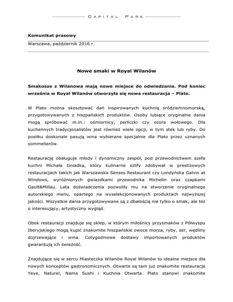 Komunikat prasowy Warszawa, październik 2016 r. INFORMACJA PRASOWA Nowe smaki w Royal Wilanów Smakosze z Wilanowa mają nowe miejsce do odwiedzania. Pod koniec września w Royal Wilanów otworzyła się nowa restauracja – Plato. W Plato można skosztować dań inspirowanych kuchnią śródziemnomorską, przygotowywanych z hiszpańskich produktów. Osoby lubiące oryginalne dania mogą spróbować m.in.: ośmiornicy, perliczki czy ozora wołowego. Dla kuchennych tradycjonalistów jest również wiele opcji, w tym stek lub ryby. Do posiłku doskonale pasują wina wybierane specjalnie dla Plato przez uznanych sommelierów. Restaurację obsługuje młody i dynamiczny zespół, pod przewodnictwem szefa kuchni Michała Gniadka, który kulinarne szlify zdobywał w prestiżowych restauracjach takich jak Warszawska Senses Restaurant czy Londyńska Galvin at Windows, wyróżnionych gwiazdkami przewodnika Michelin oraz czapkami Gault&Millau. Lata doświadczenia pozwoliły mu na stworzenie oryginalnego autorskiego menu, opartego na wyselekcjonowanych produktach najwyższej jakości. Wszystkie dania przygotowywane są z dbałością nie tylko o smak, ale też o interesujący, artystyczny wygląd. Obok restauracji znajduje się sklep, w którym miłośnicy przysmaków z Półwyspu Iberyjskiego mogą kupić znakomite hiszpańskie owoce morza, ryby, ser, wędliny dojrzewające i wina. Cotygodniowe dostawy importowanych produktów gwarantują ich świeżość. Znajdujące się w sercu Miasteczka Wilanów Royal Wilanów to idealne miejsce dla nowych konceptów gastronomicznych. Otwarte są tam już znakomite restauracje Yeye, Naturel, Nama Sushi i Kuchnia Otwarta. Plato stanowi znakomite uzupełnienie już istniejącej oferty gastronomicznej. Teraz odwiedzający Royal Wilanów mają jeszcze większy wybór wysokiej klasy miejsc do jedzenia. *** Dodatkowe informacje: Inwestor Grupa Capital Park jest doświadczonym i aktywnym inwestorem i deweloperem działającym na rynku nieruchomości w Polsce od ponad dziesięciu lat, specjalizującym się w wyszukiwaniu i wykorzystywaniu okazji rynkowych (ang. opportunistic investor). Głównym przedmiotem działalności Grupy jest nabywanie nieruchomości ze znacznym potencjałem budowy wartości, np. poprzez zmianę warunków zagospodarowania przestrzennego lub uzyskanie pozwolenia na budowę, budowę nowych lub przebudowę istniejących obiektów, lub poprawę zarządzania istniejącymi budynkami. Capital Park osiąga dochody z najmu oraz ze sprzedaży nieruchomości lub produktów inwestycyjnych opartych na nieruchomościach. Grupa aktywnie poszukuje możliwości zakupu nowych projektów nieruchomościowych oraz nowych źródeł dochodów i wzrostu wartości w obszarach rynku charakteryzujących się dużym potencjałem rozwoju. Od rozpoczęcia działalności w 2003 roku Grupa przeprowadziła ponad 100 transakcji inwestycyjnych i zarządza portfelem nieruchomości obejmującym 72 projekty o łącznej powierzchni wynajmu brutto ok. 254 tys. mkw., zlokalizowanych w 34 miastach. Spośród tych projektów 39 nieruchomości handlowych typu highstreet znajduje się w strukturze utworzonego, innowacyjnego na polskim rynku Real Estate Income Assets FIZ AN, którym Grupa aktywnie zarządza i w którym posiada 15-proc. udział. W 2015 roku firma dostarczył na polski rynek około 65 tys. mkw. nowej powierzchni biurowohandlowej. Na dzień 31 grudnia 2015 r. bieżąca wartość portfela nieruchomości zarządzanych przez Grupę wynosiła 1,9 mld zł. Na dzień 31 grudnia 2015 r. 83% bieżącej wartości portfela Grupy stanowiły nieruchomości w Warszawie, czyli na największym i jednym z najbardziej perspektywicznych rynków nieruchomości komercyjnych w Polsce. Biuro prasowe Capital Park Joanna Cybulska tel. 0 48 22 642 24 16, + 48 609 716 305 email: [email protected]