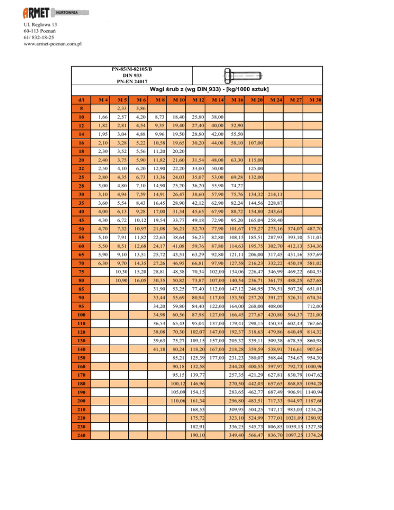 Ul. Reglowa 13 60-113 Poznań 61/ 832-18-25 www.armet-poznan.com.pl PN-85/M-82105/B DIN 933 PN-EN 24017 Wagi śrub z (wg DIN 933) - [kg/1000 sztuk] d/l M4 M5 M6 M8 M 10 M 12 M 14 M 16 M 20 M 24 M 27 M 30 2,33 3,86 10 1,66 2,57 4,20 8,73 18,40 25,80 38,00 12 1,82 2,81 4,54 9,35 19,40 27,40 40,00 52,90 14 1,95 3,04 4,88 9,96 19,50 28,80 42,00 55,50 16 2,10 3,28 5,22 10,58 19,65 30,20 44,00 58,10 107,00 18 2,30 3,52 5,56 11,20 20,20 20 2,40 3,75 5,90 11,82 21,60 31,54 48,00 63,30 115,00 22 2,50 4,10 6,20 12,90 22,20 33,00 50,00 25 2,80 4,35 6,73 13,36 24,03 35,07 53,00 69,28 28 3,00 4,80 7,10 14,90 25,20 36,20 55,90 74,22 30 3,10 4,94 7,59 14,91 26,47 38,60 57,90 75,76 134,32 214,11 35 3,60 5,54 8,43 16,45 28,90 42,12 62,90 82,24 144,56 228,87 40 4,00 6,13 9,28 17,00 31,34 45,65 67,90 88,72 154,80 243,64 45 4,30 6,72 10,12 19,54 33,77 49,18 72,90 95,20 165,04 258,40 50 4,70 7,32 10,97 21,08 36,21 52,70 77,90 101,67 175,27 273,16 374,07 487,70 55 5,10 7,91 11,82 22,63 38,64 56,23 82,80 108,15 185,51 287,93 393,10 511,03 60 5,50 8,51 12,68 24,17 41,08 59,76 87,80 114,63 195,75 302,70 412,13 534,36 65 5,90 9,10 13,51 25,72 43,51 63,29 92,80 121,11 206,00 317,45 431,16 557,69 70 6,30 97,90 127,58 216,23 332,22 450,19 581,02 8 125,00 132,00 9,70 14,35 27,26 46,95 66,81 75 10,30 15,20 28,81 48,38 70,34 102,00 134,06 226,47 346,99 469,22 604,35 80 10,90 16,05 30,35 50,82 73,87 107,00 140,54 236,71 361,75 488,25 627,68 85 31,90 53,25 77,40 112,00 147,12 246,95 376,51 507,28 651,01 90 33,44 55,69 80,94 117,00 153,50 257,20 391,27 526,31 674,34 95 34,20 59,80 84,40 122,00 164,00 268,00 408,00 100 34,98 60,56 87,98 127,00 166,45 277,67 420,80 564,37 721,00 712,00 110 36,53 65,43 95,04 137,00 179,41 298,15 450,33 602,43 767,66 120 38,08 70,30 102,07 147,00 192,37 318,63 479,86 640,49 814,32 130 39,63 75,27 109,15 157,00 205,32 339,11 509,38 678,55 860,98 140 41,18 80,24 118,20 167,00 218,28 359,59 538,91 716,61 907,64 150 85,21 125,39 177,00 231,23 380,07 568,44 754,67 954,30 160 90,18 132,58 244,20 400,55 597,97 792,73 1000,96 170 95,15 139,77 257,35 421,29 627,81 830,79 1047,62 180 100,12 146,96 270,50 442,03 657,65 868,85 1094,28 190 105,09 154,15 283,65 462,77 687,49 906,91 1140,94 200 110,06 161,34 296,80 483,51 717,33 944,97 1187,60 210 168,53 309,95 504,25 747,17 983,03 1234,26 220 175,72 323,10 524,99 777,01 1021,09 1280,92 230 182,91 336,25 545,73 806,85 1059,15 1327,58 240 190,10 349,40 566,47 836,70 1097,25 1374,24