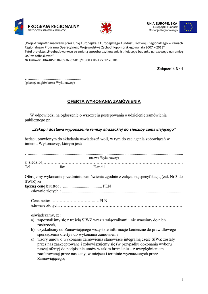 UNIA EUROPEJSKA Europejski Fundusz Rozwoju Regionalnego „Projekt współfinansowany przez Unię Europejską z Europejskiego Funduszu Rozwoju Regionalnego w ramach Regionalnego Programu Operacyjnego Województwa Zachodniopomorskiego na lata 2007 – 2013” Tytuł projektu: „Przebudowa wraz ze zmianą sposobu użytkowania istniejącego budynku garażowego na remizę OSP w Kołbaskowie” Nr Umowy: UDA-RPZP.04.05.02-32-019/10-00 z dnia 22.12.2010r. Załącznik Nr 1 ….................................................. (pieczęć nagłówkowa Wykonawcy) OFERTA WYKONANIA ZAMÓWIENIA W odpowiedzi na ogłoszenie o wszczęciu postępowania o udzielenie zamówienia publicznego pn. „Zakup i dostawa wyposażenia remizy strażackiej do siedziby zamawiającego” będąc uprawionym do składania oświadczeń woli, w tym do zaciągania zobowiązań w imieniu Wykonawcy, którym jest: …................................................................................................................................................... (nazwa Wykonawcy) z siedzibą ………………………………………………………………………………………. Tel. ……………… fax ………………. E-mail ………………………………………………. Oferujemy wykonanie przedmiotu zamówienia zgodnie z załączoną specyfikacją (zał. Nr 3 do SWIZ) za łączną cenę brutto: ….................................... PLN /słownie złotych : .................................................................................................................. Cena netto: …………………………..…PLN /słownie złotych: …………………………………………………………………………… oświadczamy, że: a) zapoznaliśmy się z treścią SIWZ wraz z załącznikami i nie wnosimy do nich zastrzeżeń, b) uzyskaliśmy od Zamawiającego wszystkie informacje konieczne do prawidłowego sporządzenia oferty i do wykonania zamówienia; c) wzory umów o wykonanie zamówienia stanowiące integralną część SIWZ zostały przez nas zaakceptowane i zobowiązujemy się (w przypadku dokonania wyboru naszej oferty) do podpisania umów w takim brzmieniu – z uwzględnieniem zaoferowanej przez nas ceny, w miejscu i terminie wyznaczonych przez Zamawiającego; 1 d) jesteśmy/nie jesteśmy * podatnikiem podatku od towarów i usług (VAT) – nasz NIP: ….......................................... e) nasza oferta zawiera …................. ponumerowanych kartek. ….......................................... …......................................... (miejsce i data) (podpisy i pieczęcie) * niepotrzebne skreślić 2 Załącznik Nr 2 ................................................................... (pieczęć Wykonawcy) OŚWIADCZENIE Przystępując do udziału w postępowaniu o udzielenie zamówienia publicznego pn.: „Zakup i dostawa wyposażenia remizy strażackiej do siedziby zamawiającego” będąc uprawnionym(i) do składania oświadczeń woli w imieniu Oferenta oraz zgodnie z art. 22 ust 1 Ustawy Prawo zamówieniach publicznych dnia 29 stycznia 2004 r. (Dz. U. z 2010 r. Nr 113, poz. 759 z późn. zmianami) oświadczam(y), że: - posiadam uprawnienia do wykonywania określonej działalności lub czynności, jeżeli ustawy nakładają obowiązek posiadania takich uprawnień; - posiadam niezbędną wiedzę i doświadczenie oraz dysponuję potencjałem technicznym i osobami zdolnymi do wykonania zamówienia lub przedstawię pisemne zobowiązanie innych podmiotów- do udostępnienia potencjału technicznego i osób zdolnych do wykonania zamówienia, - znajduję się w sytuacji ekonomicznej i finansowej zapewniającej wykonanie zamówienia; - nie podlegam wykluczeniu z postępowania o udzielenie zamówienia (art. 24 ustawy Prawo Zamówień Publicznych). - nie zalegam w płatnościach podatku do Urzędu Skarbowego i opłat w ZUS. ……........................................... (miejsce, data) …............................................... (podpisy i pieczęcie) 3 Załącznik Nr 3 WYKAZ CENOWY PRZEDMIOTU ZAMÓWIENIA I PARAMETRY 1. Aparat oddechowy (6 sztuk). Wyposażony co najmniej w: dwupunktowy system przycisków wypinających, reduktor wysokiego ciśnienia typu tłokowego, przystosowany do ciśnienia nie mniejszą niż 200 bar. noszak regulowany, pasy nośne, maskę pełno twarzową, butlę kompozytową (6,8 l/300 bar), pokrowiec na maskę, pokrowiec na butlę. cena netto za jedną sztukę:…………………………………………… /słownie złotych: :……………………………………………………………………. cena brutto za jedną sztukę: :…………………………..…………… /słownie złotych: :…………………………………………..…………………..……. cena netto za całość zamówienia: …………………………………. /słownie złotych: :……………………………………………..……………….……. cena brutto za całość zamówienia:…………………………………. /słownie złotych:……………………………………………………………………. 2. Kombinezon gazoszczelny (2 sztuki). Wyposażony co najmniej w: szybę panoramiczną, system wentylacji wewnętrznej, zasilany zewnętrznym źródłem powietrza. cena netto za jedną sztukę:…………………………………………… /słownie złotych: :……………………………………………………………………. cena brutto za jedną sztukę: :…………………………..…………… /słownie złotych: :…………………………………………..…………………..……. cena netto za całość zamówienia: …………………………………. /słownie złotych: :……………………………………………..……………….……. cena brutto za całość zamówienia:…………………………………. /słownie złotych: