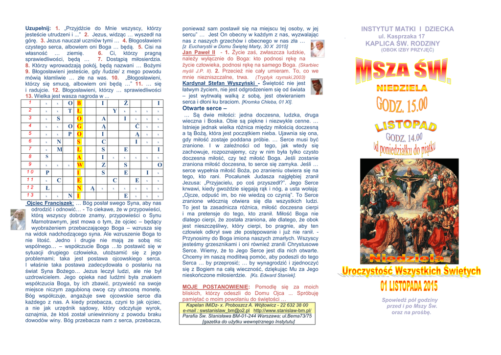 Uzupełnij: 1. „Przyjdźcie do Mnie wszyscy, którzy jesteście utrudzeni i ...” 2. Jezus, widząc … wyszedł na górę. 3. Jezus nauczał uczniów tymi … 4. Błogosławieni czystego serca, albowiem oni Boga … będą. 5. Cisi na własność … ziemię. 6. Ci, którzy pragną sprawiedliwości, będą … 7. Dostąpią miłosierdzia. 8. Którzy wprowadzają pokój, będą nazwani … Bożymi 9. Błogosławieni jesteście, gdy /ludzie/ z mego powodu mówią kłamliwie … złe na was. 10. „Błogosławieni, którzy się smucą, albowiem oni będą …” 11. … się i radujcie. 12. Błogosławieni, którzy … sprawiedliwości 13. Wielka jest wasza nagroda w ... 1 x x 2 x x 3 x 4 x 5 x 6 x 7 x 8 S 9 x 10 P 11 x 12 Ł 13 x O B T Ł S O x O G x P O N S M Ł A x x W I C E N x N I Ż I Y A Ą I C S I Z S x x x I x x x x x x x x x Ć Ą I E x x x I x S E x x x O I x E x x x x x x E x x x C Ą I x Ojciec Franciszek: … Bóg posłał swego Syna, aby nas odrodzić i odnowić… - To ciekawe, że w przypowieści, którą wszyscy dobrze znamy, przypowieści o Synu Marnotrawnym, jest mowa o tym, że ojciec – będący wyobrażeniem przebaczającego Boga – wzrusza się na widok nadchodzącego syna. Ale wzruszenie Boga to nie litość. Jedno i drugie nie mają ze sobą nic wspólnego… – współczucie Boga …to postawić się w sytuacji drugiego człowieka, utożsamić się z jego problemami; taka jest postawa ojcowskiego serca. I właśnie taka postawa zadecydowała o posłaniu na świat Syna Bożego… Jezus leczył ludzi, ale nie był uzdrowicielem. Jego opieka nad ludźmi była znakiem współczucia Boga, by ich zbawić, przywieść na swoje miejsce niczym zagubioną owcę czy utraconą monetę. Bóg współczuje, angażuje swe ojcowskie serce dla każdego z nas. A kiedy przebacza, czyni to jak ojciec, a nie jak urzędnik sądowy, który odczytuje wyrok, oznajmia, że ktoś został uniewinniony z powodu braku dowodów winy. Bóg przebacza nam z serca, przebacza, ponieważ sam postawił się na miejscu tej osoby, w jej sercu” … Jest On obecny w każdym z nas, wyzwalając nas z naszych grzechów i obecnego w nas zła … [z Eucharystii w Domu Świętej Marty, 30 X 2015] Jan Paweł II - 1. Życie zaś, zwłaszcza ludzkie, należy wyłącznie do Boga: kto podnosi rękę na życie człowieka, podnosi rękę na samego Boga. (Skarbiec myśli J.P. II). 2. Przecież nie cały umieram. To, co we mnie niezniszczalne, trwa. (Tryptyk rzymski,2003) Kardynał Stefan Wyszyński - Świętość nie jest łatwym życiem, nie jest odgrodzeniem się od świata – jest wytrwałą walką z sobą, jest otwieraniem serca i dłoni ku braciom. [Kromka Chleba, 01 XI]. INSTYTUT MATKI I DZIECKA . ul. Kasprzaka 17 KAPLICA ŚW. RODZINY (OBOK IZBY PRZYJĘĆ) Otwarte serce – … Są dwie miłości: jedna doczesna, ludzka, druga wieczna i Boska. Obie są piękne i niezwykle cenne. … Istnieje jednak wielka różnica między miłością doczesną a tą Bożą, która jest początkiem nieba. Ujawnia się ona, gdy miłość zostaje poddana próbie. … Serce musi być zranione. I w zależności od tego, jak wtedy się zachowuje, rozpoznajemy, czy w nim była tylko czysto doczesna miłość, czy też miłość Boga. Jeśli zostanie zraniona miłość doczesna, to serce się zamyka. Jeśli … serce wypełnia miłość Boża, po zranieniu otwiera się na tego, kto rani. Pocałunek Judasza najgłębiej zranił Jezusa: „Przyjacielu, po coś przyszedł?”. Jego Serce krwawi, kiedy gwoździe sięgają rąk i nóg, a usta wołają: „Ojcze, odpuść im, bo nie wiedzą co czynią”. To Serce zranione włócznią otwiera się dla wszystkich ludzi. To jest ta zasadnicza różnica, miłość doczesna cierpi i ma pretensje do tego, kto zranił. Miłość Boga nie dlatego cierpi, że została zraniona, ale dlatego, że obok jest nieszczęśliwy, który cierpi, bo pragnie, aby ten człowiek odkrył swe złe postępowanie i już nie ranił. Przynosimy do Boga imiona naszych zmarłych. Wszyscy jesteśmy grzesznikami i oni również zranili Chrystusowe Serce. Wiemy, że to Jego Serce jest dla nich otwarte. Chcemy im naszą modlitwą pomóc, aby podeszli do tego Serca … by przeprosić; … by wynagrodzić i zjednoczyć się z Bogiem na całą wieczność, dziękując Mu za Jego nieskończone miłosierdzie. [Ks. Edward Staniek]. MOJE POSTANOWIENIE: Pomodlę się za moich bliskich, którzy odeszli do Domu Ojca ... Spróbuję pamiętać o moim powołaniu do świętości … Kapelan IMiDz- x. Proboszcz A. Wójtowicz - 22 632 38 00 e-mail : [email protected] http://www.stanislaw-bm.pl/ Parafia Św. Stanisława BM-01-244 Warszawa; ul.Bema73/75 [gazetka do użytku wewnętrznego Instytutu] Spowiedź pół godziny przed i po Mszy Św. oraz na prośbę. Przyjdźcie do Mnie wszyscy, którzy jesteście utrudzeni i obciążeni, a Ja was pokrzepię. (Mt 11,28) Mt 5,1-12a Jezus, widząc tłumy, wyszedł na górę. A gdy usiadł, przystąpili do Niego Jego uczniowie. Wtedy otworzył swoje usta i nauczał ich tymi słowami: Błogosławieni ubodzy w duchu, albowiem do nich należy królestwo niebieskie. Błogosławieni, którzy się smucą, albowiem oni będą pocieszeni. Błogosławieni cisi, albowiem oni na własność posiądą ziemię. Błogosławieni, którzy łakną i pragną sprawiedliwości, albowiem oni będą nasyceni. Błogosławieni miłosierni, albowiem oni miłosierdzia dostąpią. Błogosławieni czystego serca, albowiem oni Boga oglądać będą. Błogosławieni, którzy wprowadzają pokój, albowiem oni będą nazwani synami Bożymi. Błogosławieni, którzy cierpią prześladowanie dla sprawiedliwości, albowiem do nich należy królestwo niebieskie. Błogosławieni jesteście, gdy /ludzie/ wam urągają i prześladują was, i gdy z mego powodu mówią kłamliwie wszystko złe na was. Cieszcie się i radujcie, albowiem wielka jest wasza nagroda w niebie. Kiedy słuchamy dziś błogosławieństw Pana Jezusa, wydają si