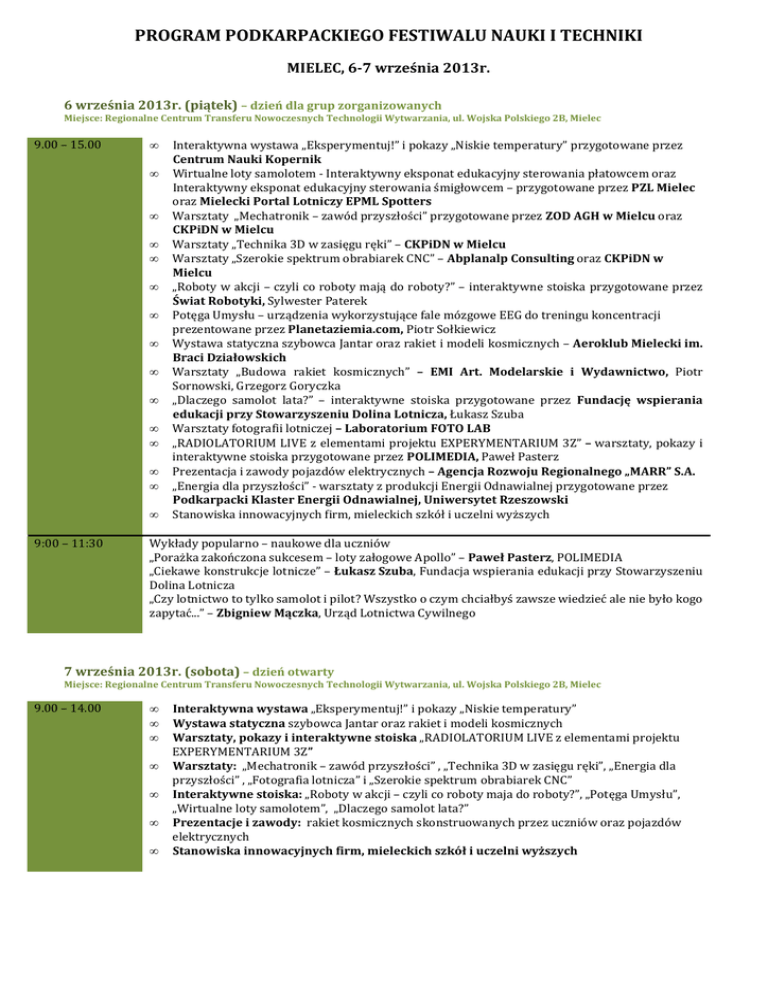 PROGRAM PODKARPACKIEGO FESTIWALU NAUKI I TECHNIKI MIELEC, 6-7 września 2013r. 6 września 2013r. (piątek) – dzień dla grup zorganizowanych Miejsce: Regionalne Centrum Transferu Nowoczesnych Technologii Wytwarzania, ul. Wojska Polskiego 2B, Mielec 9.00 – 15.00 • • • • • • • • • • • • • • • 9:00 – 11:30 Interaktywna wystawa „Eksperymentuj!” i pokazy „Niskie temperatury” przygotowane przez Centrum Nauki Kopernik Wirtualne loty samolotem - Interaktywny eksponat edukacyjny sterowania płatowcem oraz Interaktywny eksponat edukacyjny sterowania śmigłowcem – przygotowane przez PZL Mielec oraz Mielecki Portal Lotniczy EPML Spotters Warsztaty „Mechatronik – zawód przyszłości” przygotowane przez ZOD AGH w Mielcu oraz CKPiDN w Mielcu Warsztaty „Technika 3D w zasięgu ręki” – CKPiDN w Mielcu Warsztaty „Szerokie spektrum obrabiarek CNC” – Abplanalp Consulting oraz CKPiDN w Mielcu „Roboty w akcji – czyli co roboty mają do roboty?” – interaktywne stoiska przygotowane przez Świat Robotyki, Sylwester Paterek Potęga Umysłu – urządzenia wykorzystujące fale mózgowe EEG do treningu koncentracji prezentowane przez Planetaziemia.com, Piotr Sołkiewicz Wystawa statyczna szybowca Jantar oraz rakiet i modeli kosmicznych – Aeroklub Mielecki im. Braci Działowskich Warsztaty „Budowa rakiet kosmicznych” – EMI Art. Modelarskie i Wydawnictwo, Piotr Sornowski, Grzegorz Goryczka „Dlaczego samolot lata?” – interaktywne stoiska przygotowane przez Fundację wspierania edukacji przy Stowarzyszeniu Dolina Lotnicza, Łukasz Szuba Warsztaty fotografii lotniczej – Laboratorium FOTO LAB „RADIOLATORIUM LIVE z elementami projektu EXPERYMENTARIUM 3Z” – warsztaty, pokazy i interaktywne stoiska przygotowane przez POLIMEDIA, Paweł Pasterz Prezentacja i zawody pojazdów elektrycznych – Agencja Rozwoju Regionalnego „MARR” S.A. „Energia dla przyszłości” - warsztaty z produkcji Energii Odnawialnej przygotowane przez Podkarpacki Klaster Energii Odnawialnej, Uniwersytet Rzeszowski Stanowiska innowacyjnych firm, mieleckich szkół i uczelni wyższych Wykłady popularno – naukowe dla uczniów „Porażka zakończona sukcesem – loty załogowe Apollo” – Paweł Pasterz, POLIMEDIA „Ciekawe konstrukcje lotnicze” – Łukasz Szuba, Fundacja wspierania edukacji przy Stowarzyszeniu Dolina Lotnicza „Czy lotnictwo to tylko samolot i pilot? Wszystko o czym chciałbyś zawsze wiedzieć ale nie było kogo zapytać...” – Zbigniew Mączka, Urząd Lotnictwa Cywilnego 7 września 2013r. (sobota) – dzień otwarty Miejsce: Regionalne Centrum Transferu Nowoczesnych Technologii Wytwarzania, ul. Wojska Polskiego 2B, Mielec 9.00 – 14.00 • • • • • • • Interaktywna wystawa „Eksperymentuj!” i pokazy „Niskie temperatury” Wystawa statyczna szybowca Jantar oraz rakiet i modeli kosmicznych Warsztaty, pokazy i interaktywne stoiska „RADIOLATORIUM LIVE z elementami projektu EXPERYMENTARIUM 3Z” Warsztaty: „Mechatronik – zawód przyszłości” , „Technika 3D w zasięgu ręki”, „Energia dla przyszłości” , „Fotografia lotnicza” i „Szerokie spektrum obrabiarek CNC” Interaktywne stoiska: „Roboty w akcji – czyli co roboty maja do roboty?”, „Potęga Umysłu”, „Wirtualne loty samolotem”, „Dlaczego samolot lata?” Prezentacje i zawody: rakiet kosmicznych skonstruowanych przez uczniów oraz pojazdów elektrycznych Stanowiska innowacyjnych firm, mieleckich szkół i uczelni wyższych