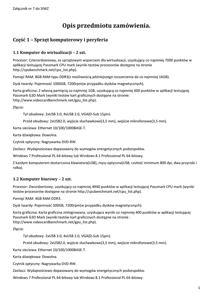 Załącznik nr 7 do SIWZ Opis przedmiotu zamówienia. Część 1 – Sprzęt komputerowy i peryferia 1.1 Komputer do wirtualizacji – 2 szt. Procesor: Czterordzeniowy, ze sprzętowym wsparciem dla wirtualizacji, uzyskujący co najmniej 7000 punktów w aplikacji testującej Passmark CPU mark (wyniki testów procesorów dostępne na stronie http://cpubenchmark.net/cpu_list.php). Pamięć RAM: 8GB RAM typu DDR3(z możliwością późniejszego rozszerzenia do co najmniej 16GB). Dysk twardy: Pojemność 1000GB, 7200rpm(w przypadku dysków magnetycznych). Karta graficzna: Z własną pamięcią co najmniej 1GB, uzyskującą co najmniej 600 punktów w aplikacji testującej Passmark G3D Mark (wyniki testów kart graficznych dostępne na stronie: http://www.videocardbenchmark.net/gpu_list.php). Złącza: Tył obudowy: 2xUSB 3.0, 4xUSB 2.0, VGA(D-Sub 15pin). Przód obudowy: 2xUSB2.0, wyjście słuchawkowe(3,5 mm), wejście mikrofonowe(3,5 mm). Karta sieciowa: Ethernet 10/100/1000BASE-T. Karta dźwiękowa: Dowolna. Czytnik optyczny: Nagrywarka DVD-RW. Zasilacz: Wydajnościowo dopasowany do wymogów energetycznych podzespołów. Windows 7 Professional PL 64-bitowy lub Windows 8.1 Professional PL 64-bitowy. Z każdym komputerem dostarczona klawiatura(USB), mysz optyczna(USB, czułość minimum 800 dpi, dwa przyciski i rolka). 1.2 Komputer biurowy – 2 szt. Procesor: Dwurdzeniowy, uzyskujący co najmniej 4940 punktów w aplikacji testującej Passmark CPU mark (wyniki testów procesorów dostępne na stronie http://cpubenchmark.net/cpu_list.php). Pamięć RAM: 4GB RAM DDR3. Dysk twardy: Pojemność 500GB, 7200rpm(w przypadku dysków magnetycznych). Karta graficzna: Karta graficzna zintegrowana, uzyskująca wyniki co najmniej 400 punktów w aplikacji testującej Passmark G3D Mark (wyniki testów kart graficznych dostępne na stronie : http://www.videocardbenchmark.net/gpu_list.php). Złącza: Tył obudowy: 2xUSB 3.0, 4xUSB 2.0, VGA(D-Sub 15pin). Przód obudowy: 2xUSB2.0, wyjście słuchawkowe(3,5 mm), wejście mikrofonowe(3,5 mm). Karta sieciowa: Ethernet 10/100/1000BASE-T. Karta dźwiękowa: Dowolna. Czytnik optyczny: Nagrywarka DVD-RW. Zasilacz: Wydajnościowo dopasowany do wymogów energetycznych podzespołów. Windows 7 Professional PL 64-bitowy lub Windows 8.1 Professional PL 64-bitowy. 1 Załącznik nr 7 do SIWZ Z każdym komputerem dostarczona klawiatura(USB), mysz optyczna(USB, czułość minimum 800 dpi, dwa przyciski i rolka). 1.3 Komputer multimedialny – 1 szt. Procesor: Dwurdzeniowy, uzyskujący wynik co najmniej 4940 punktów w aplikacji testującej Passmark CPU mark (wyniki testów procesorów dostępne na stronie http://cpubenchmark.net/cpu_list.php). Pamięć RAM: 8GB RAM DDR3(z możliwością późniejszego rozszerzenia do co najmniej 16GB). Dysk twardy: Pojemność 1000GB, 7200rpm(w przypadku dysków magnetycznych). Karta graficzna: Z własną pamięcią, uzyskującą co najmniej 400 punktów w aplikacji testującej Passmark G3D Mark (wyniki testów kart graficznych dostępne na stronie : http://www.videocardbenchmark.net/gpu_list.php). Złącza: Tył obudowy: 2xUSB 3.0, 4xUSB 2.0, VGA(D-Sub 15pin), HDMI. Przód obudowy: 2xUSB2.0, wyjście słuchawkowe(3,5 mm), wejście mikrofonowe(3,5 mm), czytnik kart pamięci. Karta sieciowa: Ethernet 10/100/1000BASE-T. Karta dźwiękowa: Dowolna. Czytnik Optyczny: Nagrywarka DVD-RW. Windows 7 Professional PL 64-bitowy lub Windows 8.1 Professional PL 64-bitowy. Z każdym komputerem dostarczona klawiatura(USB), mysz optyczna(USB, czułość minimum 800 dpi, dwa przyciski i rolka). 1.4 Monochromatyczne urządzenie wielofunkcyjne – 3 szt. Tryby pracy: drukarka, skaner, ksero. Technologia druku: Laserowa, druk monochromatyczny(czarny). Rozdzielczość wydruku: 600 x 600 dpi. Druk dwustronny: Automatyczny duplex. Podajnik: taca na 250 arkuszy papieru. Obsługiwana gramatura papieru: przedział od 60 do 160 g/m2. Złącza: USB 2.0, Ethernet 10/100 Mbps. Rozdzielczość skanowania: optyczna 600 x 2400 dpi. Dodatkowe funkcje: możliwość pracy jako autonomiczne ksero. Wydajność tonera(dostarczanego przez producenta): 2500 stron przy 5% pokryciu wydruku. Współpracująca z systemami: Windows 7, Windows 8.1, Windows server 2012. 1.5 Kolorowa drukarka laserowa – 1 szt. Technologia druku: Laserowa, druk kolorowy. Rozdzielczość druku : 600 x 600 dpi. Druk dwustronny: Automatyczny duplex. Podajnik: taca na 250 arkuszy papieru. Obsługiwana gramatura papieru: od 64 do 176 g/m2. Złącza: USB 2.0, Ethernet 10/100 Mbps. 2 Załącznik nr 7 do SIWZ Dodatkowe funkcje: Panel LCD informujący o statusie drukarki oraz umożliwiający konfigurację drukarki. Wydajność tonera(dostarczanego przez producenta): Czarny: 6500 stron przy 5% pokryciu wydruku. Kolor: 4500 stron przy 5% pokryciu wydruku. Współpraca z systemami: Windows 7, Windows 8.1, Windows Serwer 2012. 1.6 Kolorowe urządzenie wielofunkcyjne – 1 szt. Tryby pracy: drukarka, skaner, ksero. Technologia druku: Laserowa, druk kolorowy. Rozdzielczość druku 600 x 600 dpi. Druk dwustronny: Automatyczny duplex. Podajnik: taca na 250 arkuszy. Rozdzielczość skanera: 1200 x 1200 dpi. Obsługiwana gramatura papieru: od 60 do 220 g/m2. Złącza: USB, Ethernet 10/100 Mbps. Dodatkowe funkcje: możliwość pracy jako autonomiczne ksero. Wydajność tonera(dostarczanego przez producenta): Czarny: 4000 stron przy 5% pokryciu wydruku. Kolor: 2500 stron przy 5% pokryciu wydruku. Współpraca z systemami: Pełna instalacja oprogramowania dla systemów: Mac OS, Windows 7, Windows 8.1. Natywna obsługa druku z mobilnych systemów operacyjnych: iOS, Android, Windows 8 RT. 1.7 Monitor LCD – 4 szt. Przekątna matrycy: 24”. Format obrazu: 16:9. Natywna rozdzielczość: 1920x1080. Jasność: nie mniejsza niż 250 cd/m2 i nie większa niż 300 cd/m2. Czas reakcji matrycy: 1ms. Dodatkowe funkcje: wbudowane głośniki. Złącza: 2 x HDMI, D-Sub. Razem z każdym monitorem dostarczony kabel HDMI 1,5m. 1.8 Pendrive USB 6