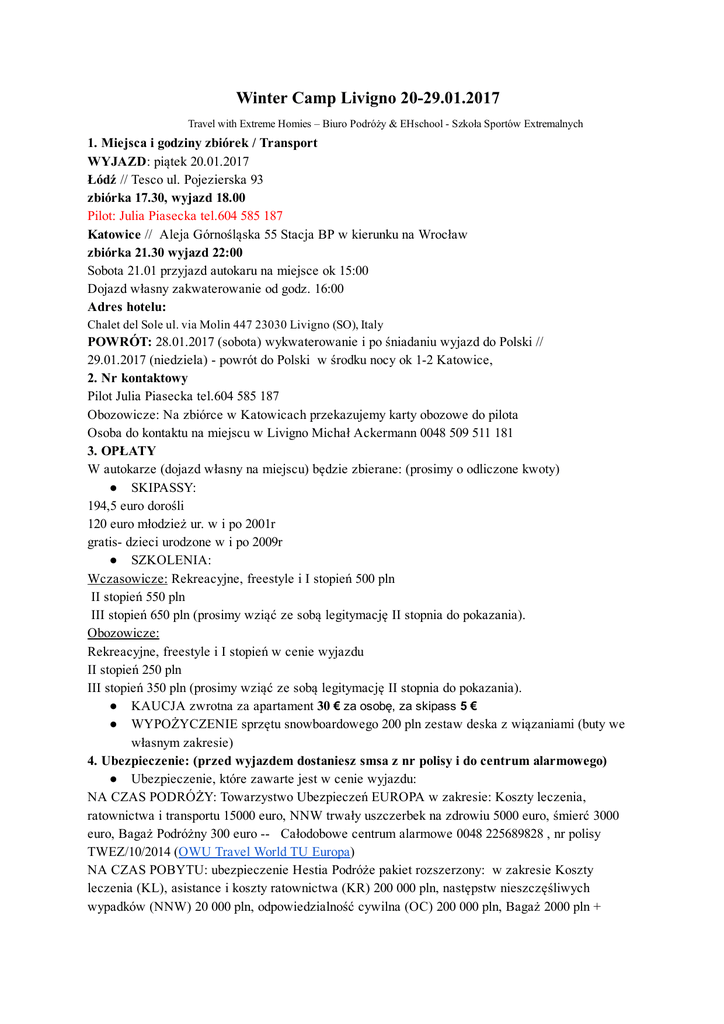 Winter Camp Livigno 2029.01.2017 Travel with Extreme Homies – Biuro Podróży & EHschool Szkoła Sportów Extremalnych 1. Miejsca i godziny z biórek / Transport WYJAZD : piątek 20.01.2017 Łódź // Tesco ul. Pojezierska 93 zbiórka 17.30, wyjazd 18.00 Pilot: Julia Piasecka tel.604 585 187 Katowice // Aleja Górnośląska 55 Stacja BP w kierunku na Wrocław zbiórka 21.30 wyjazd 22:00 Sobota 21.01 przyjazd a utokaru na miejsce ok 15:00 Dojazd własny z akwaterowanie od godz. 16:00 Adres hotelu: Chalet del Sole ul. via Molin 447 23030 Livigno (SO), Italy POWRÓT: 28.01.2017 (sobota) wykwaterowanie i po śniadaniu wyjazd do Polski // 29.01.2017 (niedziela) powrót do Polski w środku nocy ok 12 Katowice, 2. Nr kontaktowy Pilot Julia Piasecka tel.604 585 187 Obozowicze: Na z biórce w Katowicach przekazujemy karty obozowe do pilota Osoba do kontaktu na miejscu w Livigno Michał Ackermann 0048 509 511 181 3. OPŁATY W a utokarze (dojazd własny na miejscu) będzie z bierane: (prosimy o odliczone kwoty) ● SKIPASSY: 194,5 e uro dorośli 120 e uro młodzież ur. w i po 2001r gratis dzieci urodzone w i po 2009r ● SZKOLENIA: Wczasowicze: Rekreacyjne, freestyle i I stopień 500 pln II stopień 550 pln III stopień 650 pln (prosimy wziąć z e sobą legitymację II stopnia do pokazania). Obozowicze: Rekreacyjne, freestyle i I stopień w c enie wyjazdu II stopień 250 pln III stopień 350 pln (prosimy wziąć z e sobą legitymację II stopnia do pokazania). ● KAUCJA z wrotna z a a partament 30 € za osobę, za skipass 5 € ● WYPOŻYCZENIE sprzętu snowboardowego 200 pln z estaw deska z wiązaniami (buty we własnym z akresie) 4. Ubezpieczenie: (przed wyjazdem dostaniesz smsa z nr polisy i do c entrum alarmowego) ● Ubezpieczenie, które z awarte jest w c enie wyjazdu: NA CZAS PODRÓŻY: Towarzystwo Ubezpieczeń EUROPA w z akresie: Koszty leczenia, ratownictwa i transportu 15000 e uro, NNW trwały uszczerbek na z drowiu 5000 e uro, śmierć 3000 euro, Bagaż Podróżny 300 e uro Całodobowe c entrum a larmowe 0048 225689828 , nr polisy TWEZ/10/2014 ( OWU Travel World TU Europa ) NA CZAS POBYTU: ubezpieczenie Hestia Podróże pakiet rozszerzony: w z akresie Koszty leczenia (KL), a sistance i koszty ratownictwa (KR) 200 000 pln, następstw nieszczęśliwych wypadków (NNW) 20 000 pln, odpowiedzialność c ywilna (OC) 200 000 pln, Bagaż 2000 pln + rozszerzenie o pakiet SPORT (sporty rekreacyjne i ryzykowne: narciarstwo i snowboarding po oznakowanych trasach z jazdowych) Całodobowe c entrum a larmowe 0048 585507012 , nr polisy: 903011775110 (O WU Hestia Podróże ) ● Dodatkowo – dla c hętnych / lub we własnym z akresie doliczane do umowy ubezpieczenie SKI: ubezpieczenie Hestia Podróże pakiet pełny: w z akresie Koszty leczenia (KL), a ssistance i koszty ratownictwa (KR) 500 000 pln, następstw nieszczęśliwych wypadków (NNW) 30 000, odpowiedzialność c ywilna (OC) 1 000 000, Bagaż 5 000 pln – pakiet sport plus: sporty rekreacyjne, ryzykowne i e xtremalne (jazda po trasach + freeride) Składka 80 pln Całodobowe c entrum a larmowe 0048 585507012 , nr polisy: 903011775113 (O WU Hestia Podróże ) Polecamy a by każdy uczestnik wyjazdów z agranicznych posiadał ważną kartę EKUZ (Europejska Karta Ubezpieczenia Zdrowotnego) (karta EKUZ wydawana jest bezpłatnie). pobierz wniosek http://www.ehschool.pl/uploads/dokumenty/wniosekOwydanie%20EKUZ.pdf Oczywiście my ubezpieczamy w c enie wyjazdu od KL i NNW, a le z Kartą EKUZ jest prościej cokolwiek z ałatwiać w placówkach medycznych z a granicą i z awsze bezgotówkowo. W każdej miejscowości w której organizowany jest wyjazd posiadamy a uto, by w razie konieczność pilot instruktor mógł jechać do najbliższej placówki medycznej (lekarz, szpital) 5. Co z abrać należy – o tym warto pamiętać: ( http://www.ehschool.pl/uploads/dokumenty/Co_nale%C5%BCy_zabra%C4%87.pdf ) · Dowód tożsamości lub paszport (przy sobie, nie w bagażu), legitymację szkolna (dotyczy obozowiczów) · kartę obozową (dotyczy obozowiczów) do wydrukowania z e strony z z akładki, kontakt./dokumenty do pobrania · kostium kąpielowy , szorty do pływania, ręcznik kąpielowy + normalny, klapki · Sprawny sprzęt narciarski/snowboardowy (nasmarowany), buty narciarskie/snowboardowe, sprawne wiązania. · KASK (polecamy dla wszystkich, obozowicze –obowiązkowo!) + gogle · Osoby, które biorą udział w szkoleniu freestylowym snowboardowym powinny mieć deskę freestylową (miękką, najlepiej typu twintip) · krem z wysokim filtrem, szminka wazelinowa, c zapka, okulary przeciwsłoneczne, poduszka i kocyk do a utokaru · Informujemy o możliwości z deponowania pieniędzy dziecka u wychowawcy na z biórce – prosimy o przygotowanie nie z aklejonej koperty opisanej imieniem i nazwiskiem dziecka oraz podaniem kwoty. · strój na imprezę tematyczną KICZ PARTY !!! 7. Bagaż WAŻNE: limit bagażu głównego 25 kg, bagażu podręcznego 5 kg oraz 1 komplet sprzętu narciarskiego (+ buty oddzielnie w pokrowcu) lub sprzętu snowboardowego z apakowanego w pokrowiec. W przypadku posiadania bagażu ponad limitowego, Organizator ma prawo odmówić zabrania go na pokład. Prosimy o niezabieranie bagażu typu skorupa oraz o trwałe i widoczne oznaczenie bagażu imieniem i nazwiskiem. Anna Ackermann // a [email protected] // 0048 509338388