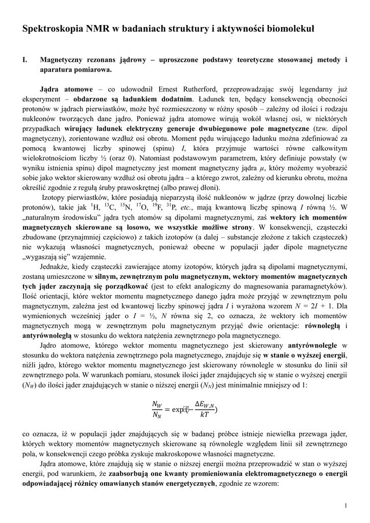 Spektroskopia NMR w badaniach struktury i aktywności biomolekuł I. Magnetyczny rezonans jądrowy – uproszczone podstawy teoretyczne stosowanej metody i aparatura pomiarowa. Jądra atomowe – co udowodnił Ernest Rutherford, przeprowadzając swój legendarny już eksperyment – obdarzone są ładunkiem dodatnim. Ładunek ten, będący konsekwencją obecności protonów w jądrach pierwiastków, może być rozmieszczony w różny sposób – zależny od ilości i rodzaju nukleonów tworzących dane jądro. Ponieważ jądra atomowe wirują wokół własnej osi, w niektórych przypadkach wirujący ładunek elektryczny generuje dwubiegunowe pole magnetyczne (tzw. dipol magnetyczny), zorientowane wzdłuż osi obrotu. Moment pędu wirującego ładunku można zdefiniować za pomocą kwantowej liczby spinowej (spinu) I, która przyjmuje wartości równe całkowitym wielokrotnościom liczby ½ (oraz 0). Natomiast podstawowym parametrem, który definiuje powstały (w wyniku istnienia spinu) dipol magnetyczny jest moment magnetyczny jądra µ, który możemy wyobrazić sobie jako wektor skierowany wzdłuż osi obrotu jądra – a którego zwrot, zależny od kierunku obrotu, można określić zgodnie z regułą śruby prawoskrętnej (albo prawej dłoni). Izotopy pierwiastków, które posiadają nieparzystą ilość nukleonów w jądrze (przy dowolnej liczbie protonów), takie jak 1H, 13C, 15N, 17O, 19F, 31P, etc., mają kwantową liczbę spinową I równą ½. W „naturalnym środowisku” jądra tych atomów są dipolami magnetycznymi, zaś wektory ich momentów magnetycznych skierowane są losowo, we wszystkie możliwe strony. W konsekwencji, cząsteczki zbudowane (przynajmniej częściowo) z takich izotopów (a dalej – substancje złożone z takich cząsteczek) nie wykazują własności magnetycznych, ponieważ obecne w populacji jąder dipole magnetyczne „wygaszają się” wzajemnie. Jednakże, kiedy cząsteczki zawierające atomy izotopów, których jądra są dipolami magnetycznymi, zostaną umieszczone w silnym, zewnętrznym polu magnetycznym, wektory momentów magnetycznych tych jąder zaczynają się porządkować (jest to efekt analogiczny do magnesowania paramagnetyków). Ilość orientacji, które wektor momentu magnetycznego danego jądra może przyjąć w zewnętrznym polu magnetycznym, zależna jest od kwantowej liczby spinowej jądra I i wyrażona wzorem N = 2I + 1. Dla wymienionych wcześniej jąder o I = ½, N równa się 2, co oznacza, że wektory ich momentów magnetycznych mogą w zewnętrznym polu magnetycznym przyjąć dwie orientacje: równoległą i antyrównoległą w stosunku do wektora natężenia zewnętrznego pola magnetycznego. Jądro atomowe, którego wektor momentu magnetycznego jest skierowany antyrównolegle w stosunku do wektora natężenia zewnętrznego pola magnetycznego, znajduje się w stanie o wyższej energii, niźli jądro, którego wektor momentu magnetycznego jest skierowany równolegle w stosunku do linii sił zewnętrznego pola. W warunkach pomiaru, stosunek ilości jąder znajdujących się w stanie o wyższej energii (NW) do ilości jąder znajdujących w stanie o niższej energii (NN) jest minimalnie mniejszy od 1: 𝑁𝑊 Δ𝐸𝑊,𝑁 = exp (− ) 𝑁𝑁 𝑘𝑇 co oznacza, iż w populacji jąder znajdujących się w badanej próbce istnieje niewielka przewaga jąder, których wektory momentów magnetycznych skierowane są równolegle względem linii sił zewnętrznego pola, w konsekwencji czego próbka zyskuje makroskopowe własności magnetyczne. Jądra atomowe, które znajdują się w stanie o niższej energii można przeprowadzić w stan o wyższej energii, pod warunkiem, że zaabsorbują one kwanty promieniowania elektromagnetycznego o energii odpowiadającej różnicy omawianych stanów energetycznych, zgodnie ze wzorem: 1 𝐸 = ℎ𝜈 Ponieważ energia kwantu promieniowania zależy od częstotliwości fali elektromagnetycznej, możemy powiedzieć, iż jądra atomowe posiadają pewne „częstotliwości własne” promieniowania, dzięki którym będą „wzbudzane”. Ponieważ, w fizyce, zjawisko pobudzania danego układu (najczęściej do drgań) w wyniku absorbcji energii fal, których częstotliwość odpowiada częstotliwości własnej danego układ, nosi nazwę rezonansu, omawiane zjawisko nazywa się magnetycznym rezonansem jądrowym (ang. Nuclear Magnetic Resonance, NMR), a częstotliwości własne jąder atomowych - częstotliwościami rezonansowymi (Larmora). Częstotliwość Larmora, czyli częstotliwość fali elektromagnetycznej zdolnej przeprowadzić jądro atomowe w stan o wyższej energii, dana jest wzorem: 𝜈𝐿 = 𝛾 𝐵 (1 − 𝜎) 2𝜋 0 i zależy od następujących parametrów: 1) typu jądra (1H, 13C, etc.), reprezentowanego we wzorze przez współczynnik żyromagnetyczny jądra, γ (który jest stały dla danego typu jądra); 2) warunków pomiaru, a dokładniej: mocy spektrometru, reprezentowanej we wzorze przez wartość indukcji omawianego wcześniej zewnętrznego pola magnetycznego, B0 (pamiętamy, że indukcja pola magnetycznego jest wielkością wprost proporcjonalną do natężenia pola magnetycznego); 3) otoczenia chemicznego jądra atomowego, a dokładniej: wpływu pól magnetycznych pozostałych jąder oraz elektronów znajdujących się w bezpośredniej bliskości danego jądra, reprezentowanego we wzorze przez stałą ekranowania, σ. Punkt 3) wymaga dodatkowego komentarza. Otóż okazuje się, iż omawiane wcześniej, zewnętrzne pole magnetyczne porządkujące wektory momentów magnetycznych w badanej populacji jąder, ulega „modyfikacji” w wyniku obecności lokalnych pól magnetycznych jąder atomowych oraz elektronów wchodzących w skład danej cząsteczki chemicznej. W konsekwencji, jądra atomowe, które mają różne otoczenia chemiczne, tj. znajdują się blisko (w przestrzeni) atomów różnego typu lub różnej ilości atomów tego samego typu (a przez to: różna jes