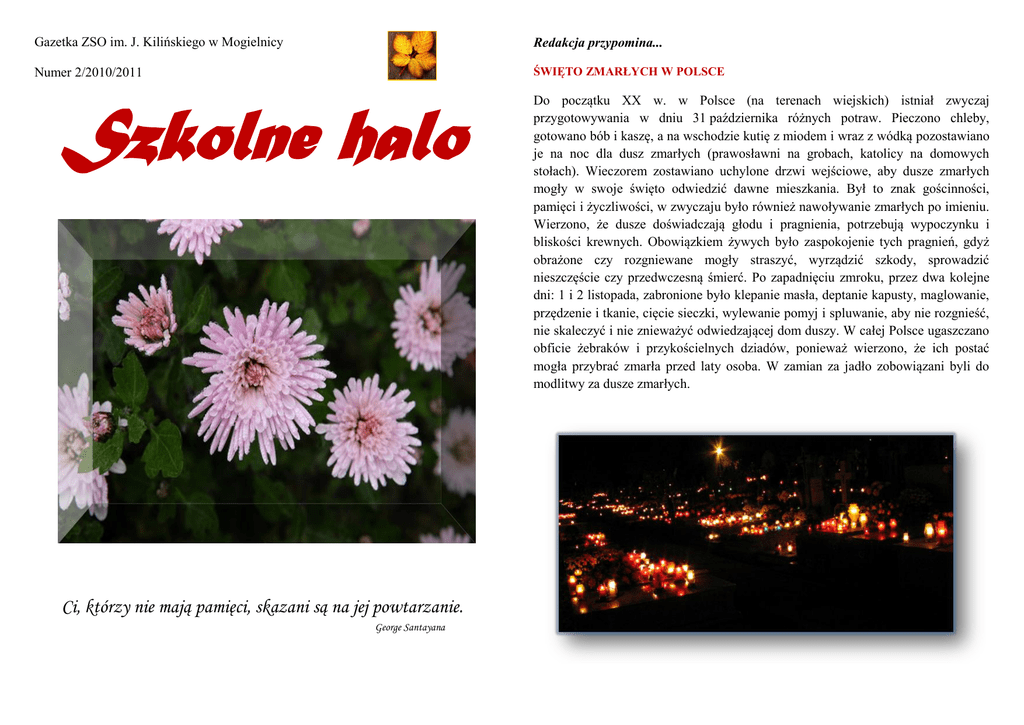 Gazetka ZSO im. J. Kilińskiego w Mogielnicy Redakcja przypomina... Numer 2/2010/2011 ŚWIĘTO ZMARŁYCH W POLSCE Szkolne halo Ci, którzy nie mają pamięci, skazani są na jej powtarzanie. George Santayana Do początku XX w. w Polsce (na terenach wiejskich) istniał zwyczaj przygotowywania w dniu 31 października różnych potraw. Pieczono chleby, gotowano bób i kaszę, a na wschodzie kutię z miodem i wraz z wódką pozostawiano je na noc dla dusz zmarłych (prawosławni na grobach, katolicy na domowych stołach). Wieczorem zostawiano uchylone drzwi wejściowe, aby dusze zmarłych mogły w swoje święto odwiedzić dawne mieszkania. Był to znak gościnności, pamięci i życzliwości, w zwyczaju było również nawoływanie zmarłych po imieniu. Wierzono, że dusze doświadczają głodu i pragnienia, potrzebują wypoczynku i bliskości krewnych. Obowiązkiem żywych było zaspokojenie tych pragnień, gdyż obrażone czy rozgniewane mogły straszyć, wyrządzić szkody, sprowadzić nieszczęście czy przedwczesną śmierć. Po zapadnięciu zmroku, przez dwa kolejne dni: 1 i 2 listopada, zabronione było klepanie masła, deptanie kapusty, maglowanie, przędzenie i tkanie, cięcie sieczki, wylewanie pomyj i spluwanie, aby nie rozgnieść, nie skaleczyć i nie znieważyć odwiedzającej dom duszy. W całej Polsce ugaszczano obficie żebraków i przykościelnych dziadów, ponieważ wierzono, że ich postać mogła przybrać zmarła przed laty osoba. W zamian za jadło zobowiązani byli do modlitwy za dusze zmarłych. Tradycja palenia zniczy W noc zaduszną, aż do świtu, na cmentarzach, rozstajach i w obejściach, rozniecano ogniska, których zadaniem było wskazywanie drogi błąkającym się duszom. Popularne było również palenie ognisk na mogiłach samobójców i ludzi zmarłych tragicznie, którzy zwykle byli grzebani za murem cmentarnym. Chrust na te ogniska składano w ciągu całego roku (ten, kto przechodził obok, kładł obok grobu gałązkę i w ten sposób tworzył się stos do spalenia w noc zaduszną). Wierzono, że ogień palony na grobach samobójców ma moc oczyszczającą umarłych, daje również ochronę żywym przed złymi mocami, które mogły być obecne w takich miejscach. Kiedy myślę Ojczyzna... 10 listopada 2010 r. w naszej szkole odbyła się akademia z okazji 92. rocznicy Odzyskania Niepodległości przez Polskę. Wystąpili w niej uczniowie klas trzecich gimnazjum oraz licealiści. Uroczystość rozpoczęła się wprowadzeniem sztandaru i odśpiewaniem hymnu narodowego. Celem akademii było przybliżenie uczniom wydarzeń historycznych związanych z odzyskaniem przez Polskę niepodległości. Na scenie widniał napis ,,Kiedy myślę Ojczyzna, szukam drogi biegnącej w każdym z nas…’’. W centrum umieszczone były: godło Polski, portret marszałka Józefa Piłsudskiego oraz trzy białe krzyże, a pod nimi kwiaty i znicze. red. Dla tych, którzy odeszli Dla tych którzy odeszli w nieznany świat, płomień na wietrze kołysze wiatr. Dla nich tyle kwiatów pod cmentarnym murem i niebo jesienne u góry Dla nich harcerskie warty i chorągiewek gromada, i dla nich ten dzień pierwszy dzień listopada. Danuta Gellnerowa Teksty i wiersze o charakterze historycznym przeplatane były patriotycznymi pieśniami śpiewanymi przez chór męski oraz solistów. Atmosfera spotkania była bardzo podniosła. Program przygotowali uczniowie pod kierunkiem nauczycielek: p. Anny Frasonskiej, p. Mirosławy Koperskiej, p. Marioli Kuźmy, p. Marii Lenart, p. Jolanty Ścisłowskiej oraz p. Anny Woźnicy. Obchody Rocznicy Odzyskania Niepodległości przez Polskę w naszej gminie Na zakończenie uroczystości pan dyrektor podziękował wszystkim nauczycielom i uczniom zaangażowanym w przygotowanie apelu oraz przypomniał o tym, jak ważnym świętem jest dzień 11 listopada. Akademię z okazji Rocznicy Odzyskania Niepodległości przez Polskę przygotowała młodzież i nauczyciele ze Szkoły Podstawowej w Brzostowcu. Zdaniem uczniów nasza szkolna akademia była niezwykle ciekawą lekcją historii. Oprac.: Aleksandra Kurcińska Klasa 3d Na uroczystości nie zabrakło przedstawicieli naszej szkoły – dyrekcji – p. D. Sańprucha, p. U. Tomali-Kujat, p. J. Tomczyk, pedagogów oraz delegacji wszystkich klas gimnazjum i liceum. Próbnych egzaminów czas Delegacje złożone z uczniów ZSO im. J. Kilińskiego w Mogielnicy uczciły pamięć bohaterów poległych w obronie Ojczyzny. red. W listopadzie nasi maturzyści zmagali się z próbnymi egzaminami z języka polskiego, matematyki, języka obcego i wybranego przedmiotu dodatkowego. Jak widać, wszyscy uczniowie klas trzecich liceum poważnie podeszli do sprawy red. Nasze podróże 18 listopada 28 października Klasy pierwsze LO zwiedziły cmentarz na Powązkach Klasy pierwsze c, d, e gimnazjum na wycieczce w Warszawie Wielu z nas pierwszy raz miało okazję odwiedzić to piękne zabytkowe miejsce. Szczególnie spodobała się nam wystawa przed Muzeum Wojska Polskiego Tu „zaszaleliśmy” Każdy z nas poczuł się przez chwilę „prawdziwym żołnierzem” Następnym „przystankiem” na trasie naszej podróży było Muzeum Narodowe. Chociaż placówka boryka się z pewnymi problemami, lekcje muzealne były naprawdę godne uwagi. „Łyknęliśmy” nieco kultury. Usłyszeliśmy wiele ciekawostek o mitach w sztuce, a także malarstwie doby Oświecenia i Romantyzmu. Na zakończenie wyruszyliśmy do Cinema City na Śluby panieńskie Fajnie było! Oprac. klasa 1c z wych. Nie przypuszczaliśmy nawet, że kryje ono w sobie tyle ciekawych historii o znanych i nieznanych Polakach. Podczas zwiedzania towarzyszył nam listopadowy – refleksyjny nastrój. Na jednej ze ścian Kościoła św. Boromeusza na Powązkach odnaleźliśmy tablicę poświęconą patronowi naszej szkoły Janowi Kilińskiemu Oprac. klasa I C z wych. Andrzejki, jędrzejówki, Andrzejówki Andrzejki obchodzimy w wigilię (czyli w przeddzień) dnia świętego A