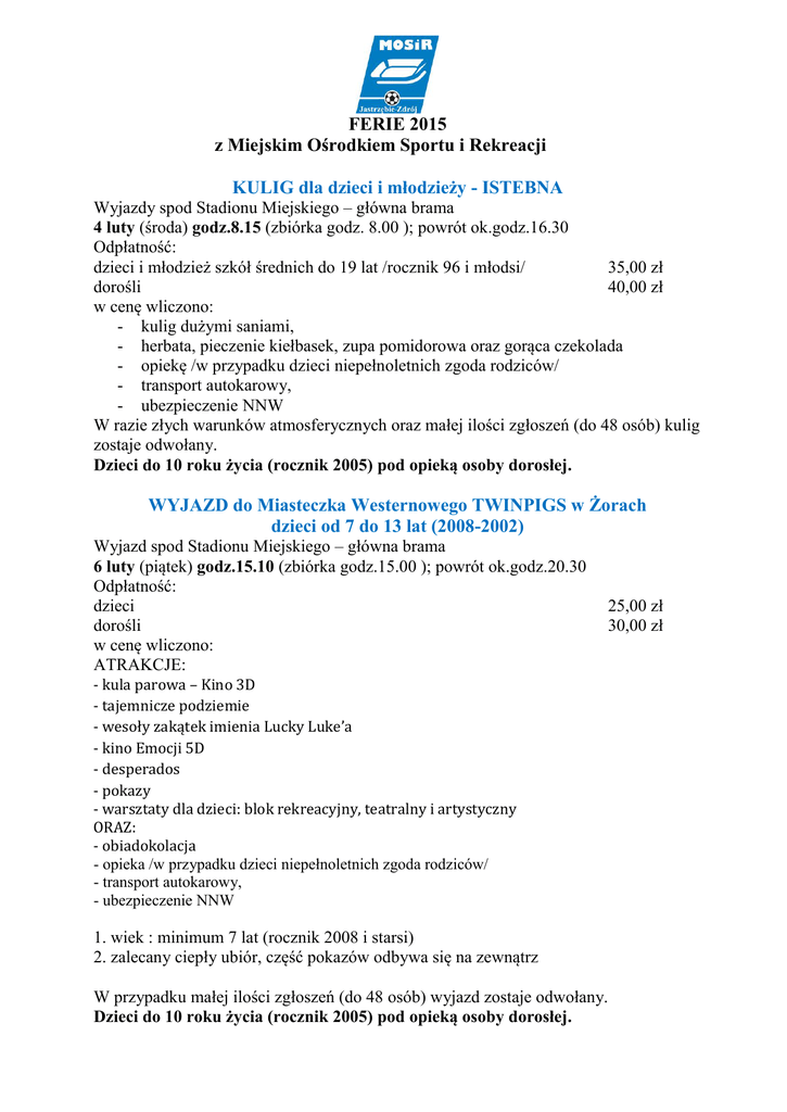 FERIE 2015 z Miejskim Ośrodkiem Sportu i Rekreacji KULIG dla dzieci i młodzieży - ISTEBNA Wyjazdy spod Stadionu Miejskiego – główna brama 4 luty (środa) godz.8.15 (zbiórka godz. 8.00 ); powrót ok.godz.16.30 Odpłatność: dzieci i młodzież szkół średnich do 19 lat /rocznik 96 i młodsi/ 35,00 zł dorośli 40,00 zł w cenę wliczono: - kulig dużymi saniami, - herbata, pieczenie kiełbasek, zupa pomidorowa oraz gorąca czekolada - opiekę /w przypadku dzieci niepełnoletnich zgoda rodziców/ - transport autokarowy, - ubezpieczenie NNW W razie złych warunków atmosferycznych oraz małej ilości zgłoszeń (do 48 osób) kulig zostaje odwołany. Dzieci do 10 roku życia (rocznik 2005) pod opieką osoby dorosłej. WYJAZD do Miasteczka Westernowego TWINPIGS w Żorach dzieci od 7 do 13 lat (2008-2002) Wyjazd spod Stadionu Miejskiego – główna brama 6 luty (piątek) godz.15.10 (zbiórka godz.15.00 ); powrót ok.godz.20.30 Odpłatność: dzieci dorośli w cenę wliczono: ATRAKCJE: - kula parowa – Kino 3D - tajemnicze podziemie - wesoły zakątek imienia Lucky Luke’a - kino Emocji 5D - desperados - pokazy - warsztaty dla dzieci: blok rekreacyjny, teatralny i artystyczny ORAZ: - obiadokolacja - opieka /w przypadku dzieci niepełnoletnich zgoda rodziców/ - transport autokarowy, - ubezpieczenie NNW 1. wiek : minimum 7 lat (rocznik 2008 i starsi) 2. zalecany ciepły ubiór, część pokazów odbywa się na zewnątrz W przypadku małej ilości zgłoszeń (do 48 osób) wyjazd zostaje odwołany. Dzieci do 10 roku życia (rocznik 2005) pod opieką osoby dorosłej. 25,00 zł 30,00 zł WYJAZD DO TEATRU LALEK BANIALUKA – BIELSKO BIAŁA dzieci od 7 do 13 lat (2008-2002) „KOZIOŁEK MATOŁEK” Wyjazd spod Stadionu Miejskiego – główna brama 9 luty (poniedziałek) godz.9.30 (zbiórka godz. 9.15); powrót ok.godz.13.30 Odpłatność: dzieci 18,00 zł dorośli 22,00 zł w cenę wliczono: - opiekę - transport autokarowy - bilet do teatru - ubezpieczenie NNW Zapisy do środy (30.01.2015) do godz. 15.00. W przypadku małej ilości zgłoszeń (do 48 osób) wyjazd zostaje odwołany. Dzieci do 10 roku życia (rocznik 2005) pod opieką osoby dorosłej. KULIG dla dzieci i młodzieży - ISTEBNA oraz PARK WODNY OLZA Wyjazdy spod Stadionu Miejskiego – główna brama 11 luty (środa) godz.8.15 (zbiórka godz. 8.00 ); powrót ok.godz.18.30 Odpłatność: dzieci i młodzież szkół średnich do 19 lat /rocznik 96 i młodsi/ 50,00 zł dorośli 60,00 zł w cenę wliczono: - kulig dużymi saniami, - herbata, pieczenie kiełbasek, żurek oraz gorąca czekolada - 2h w Parku Wodnym OLZA (zjeżdżalnia, jacuzzi, gejzery, dzika rwąca rzeka, wodospady, sauny, grota solno-skalna, brodzik dla dzieci) - opiekę /w przypadku dzieci niepełnoletnich zgoda rodziców/ - transport autokarowy, - ubezpieczenie NNW W razie złych warunków atmosferycznych oraz małej ilości zgłoszeń (do 48 osób) kulig zostaje odwołany. Dzieci i młodzież do 18 roku życia (rocznik 1997 i młodsi) pod opieką osoby dorosłej. FERIE z RAKIETKĄ tenis stołowy i badminton Hala Widowiskowo - Sportowa, Al.Jana Pawła II 6 wejście B TENIS STOŁOWY 02.02 – 06.02 (od poniedziałku do piątku) godz.12.00 – 17.00 09.02 – 13.02 (od poniedziałku do piątku) godz.12.00 – 17.00 BADMINTON 03.02; 04.02 - godz.15.00-17.00 10.02;11.02 - godz.14.30-16.30 możliwość rezerwacji tel. – 32 47612 01 ZAJĘCIA BEZPŁATNE Dzieci do lat 10 (rocznik 2005 ni młodsi) pod opieką dorosłych. Wymagane buty zmienne i ubiór sportowy. Każdy uczestnik musi posiadać własny sprzęt sportowy (istnieje możliwość wypożyczenia rakietek na podstawie leg.szkolnej, liczba ograniczona). AKADEMIA JOGI DLA DZIECI i MŁODZIEŻY od 8 do 16 lat Sala FITNESS - Stadion Miejski, ul.Harcerska 14B JOGA z MAMĄ, TATĄ, BABCIĄ i DZIADKIEM (zapraszamy do udziału w zajęciach opiekunów, którzy przyprowadzają dzieci na JOGĘ) 03.02,10.02 wtorki godz.14.00 06.02,13.02 piątki godz.10.00 ZAJĘCIA BEZPŁATNE Wymagane buty zmienne i ubiór sportowy (własna mata do ćwiczeń) ZIMOWA AKADEMIA TAŃCA Hala Widowiskowo – Sportowa, Al. Jana Pawła II 6 – Sala Lustrzana 02.02– 06.02 (od poniedziałku do piątku) godz. 15.45 – 16.30 dzieci 8 – 13 lat (taniec nowoczesny- początkujący) godz. 16.35 – 17.20 dzieci 8 - 13 lat( Taniec Towarzyski - początkujący) godz. 17.25 – 18.10 KURS TAŃCA dla Dorosłych godz. 18.15 – 19.00 LATINO SOLO – dla Pań informacja, zapisy: [email protected] ZAJĘCIA BEZPŁATNE Dzieci młodszej grupy pod opieką dorosłych. Wymagane buty zmienne i ubiór sportowy. HALOWA PIŁKA NOŻNA DLA DZIECI Hala Widowiskowo - Sportowa, Al.Jana Pawła II 6 Chłopcy od 11 do 13 lat (rocznik 2004,2003,2002) poniedziałki 02.02,09.02 – godz. 12.30-14.30 wtorki Chłopcy od 14 do 16 lat (rocznik 2001,2000,1999) 03.02,10.02 – godz. 12.30-14.30 środa czwartek Chłopcy do lat 10 (rocznik 2005 i młodsi) 04.02 – godz. 12.30-14.30 12.02 – godz. 12.30-14.30 ZAJĘCIA BEZPŁATNE Każdy uczestnik rozgrywek musi posiadać pisemną zgodę rodziców na udział w rozgrywkach. Wymagane buty zmienne i ubiór sportowy. SZYBCIEJ, WYŻEJ , DALEJ – halowe zajęcia lekkiej atletyki Hala Sportowa „OMEGA”, ul.Harcerska 14A / Sala Gimnastyczna – Stadion Miejski, ul.Harcerska 14B dzieci do lat 13 (rocznik 2002 i młodsi) 02.02,09.02 – poniedziałki 03.02,10.02 – wtorki 05.02,12.02 – czwartki godz. 11.30 – 13.00 godz. 11.30 – 13.00 godz. 11.30 – 13.00 ZAJĘCIA BEZPŁATNE Każdy uczestnik musi posiadać pisemną zgodę rodziców na udział w zajęciach. Wymagane buty zmienne i ubiór sportowy. PIŁKA SIATKOWA Współorganizator – Szkoła Podstawowa nr 10 Sala gimnastyczna Szkoły Podstawowej nr 10 ul. Zielona 2a 03.02,10.02 – wtorki godz.11.00 – 12.20 – chłopcy; godz.12.30 – 13.30 – dziewczęta 05.02,12.02 – czwartki godz.11.00 – 12.20 – chłopcy; godz.12.30 – 13.30 – dziewczęta Dla uczniów szkół gimnazjalnych
